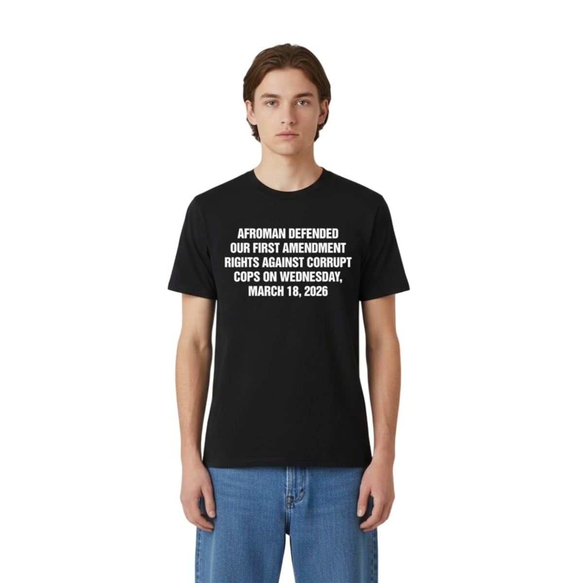 This minimalist, text-based apparel serves as a wearable billboard for one of the most bizarre and triumphant moments in recent legal history. Featuring stark, all-caps white typography set against a dark background, the design reads: “AFROMAN DEFENDED OUR FIRST AMENDMENT RIGHTS AGAINST CORRUPT COPS ON WEDNESDAY, MARCH 18, 2026.” It bypasses flashy graphics in favor of a direct, unapologetic statement. Designed for high visibility and immediate impact, this item is a direct nod to the intersection of constitutional law, meme culture, and musical satire.