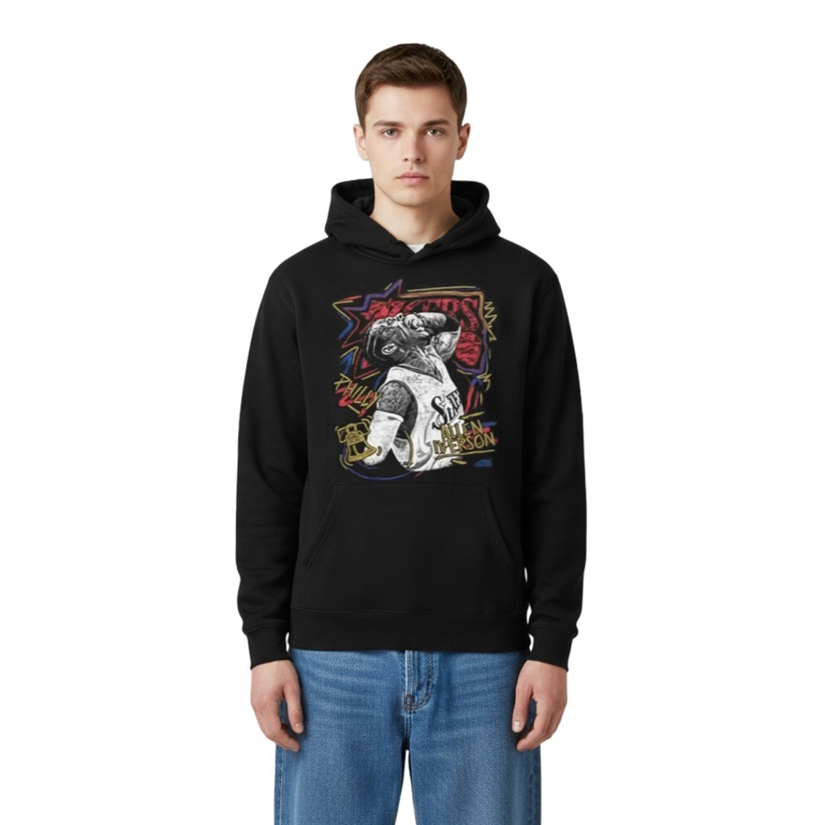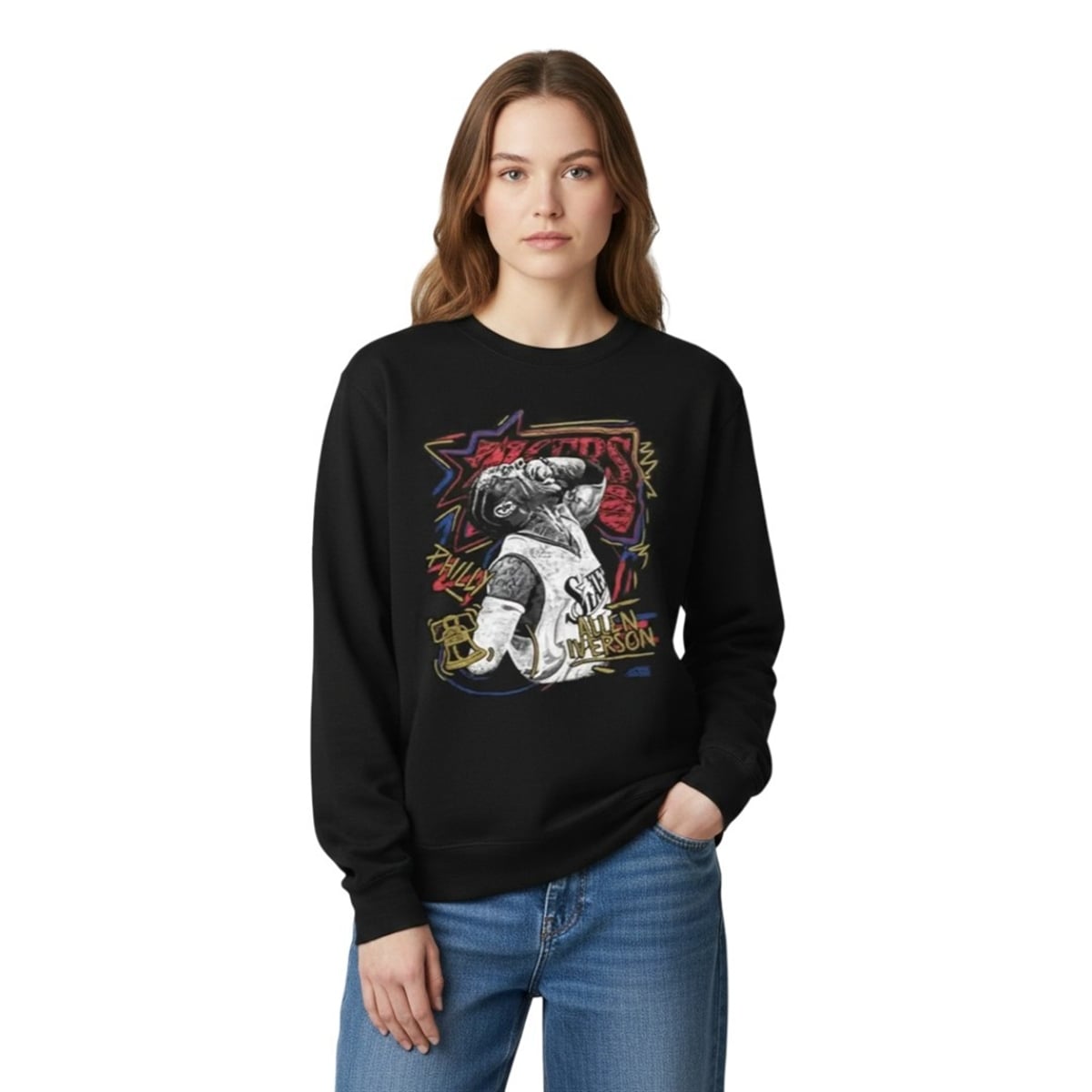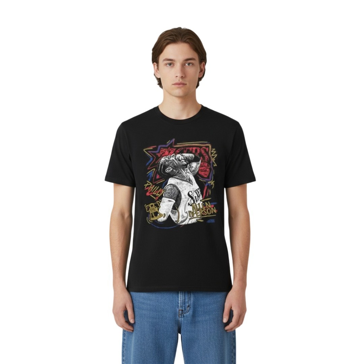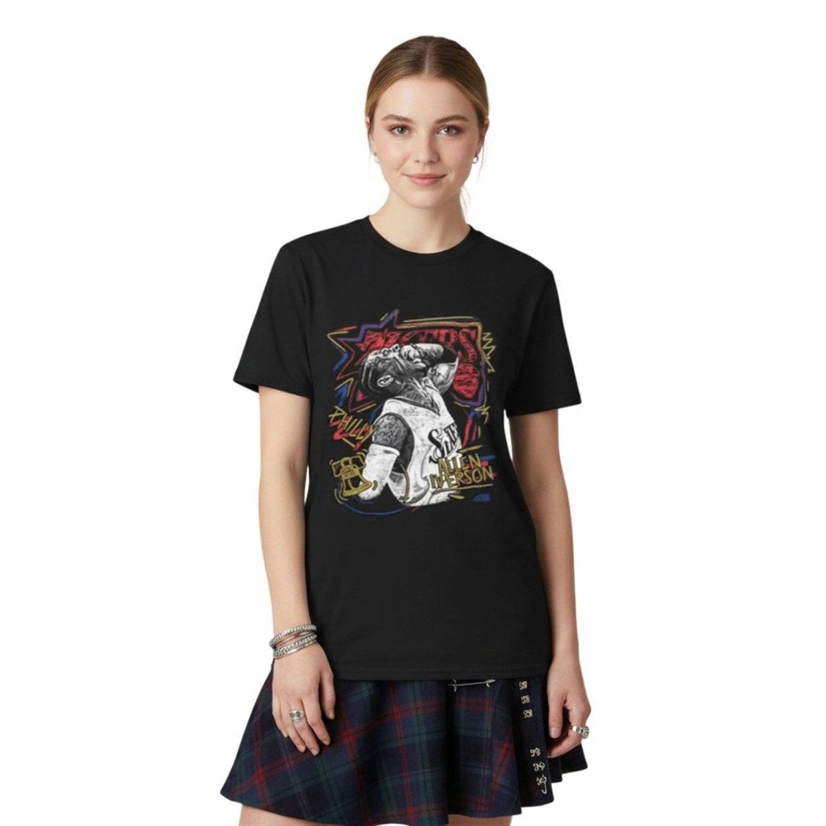 The shirt is a striking visual celebration of one of basketball’s most influential figures, brought back into the modern spotlight by a rising star of the ice. The front of the garment features a dynamic, stylized illustration of Allen Iverson in his iconic “hand to the ear” pose, urging the Philadelphia crowd to get louder. Surrounded by vibrant, graffiti-style accents in team colors, the graphic includes classic Philadelphia motifs, including a golden Liberty Bell and the recognizable “Sixers” script. The design leans heavily into a nostalgic, 90s and early 2000s streetwear aesthetic, utilizing bold contrast to make the central imagery pop. It stands as a testament to the era when basketball culture heavily influenced global fashion trends.