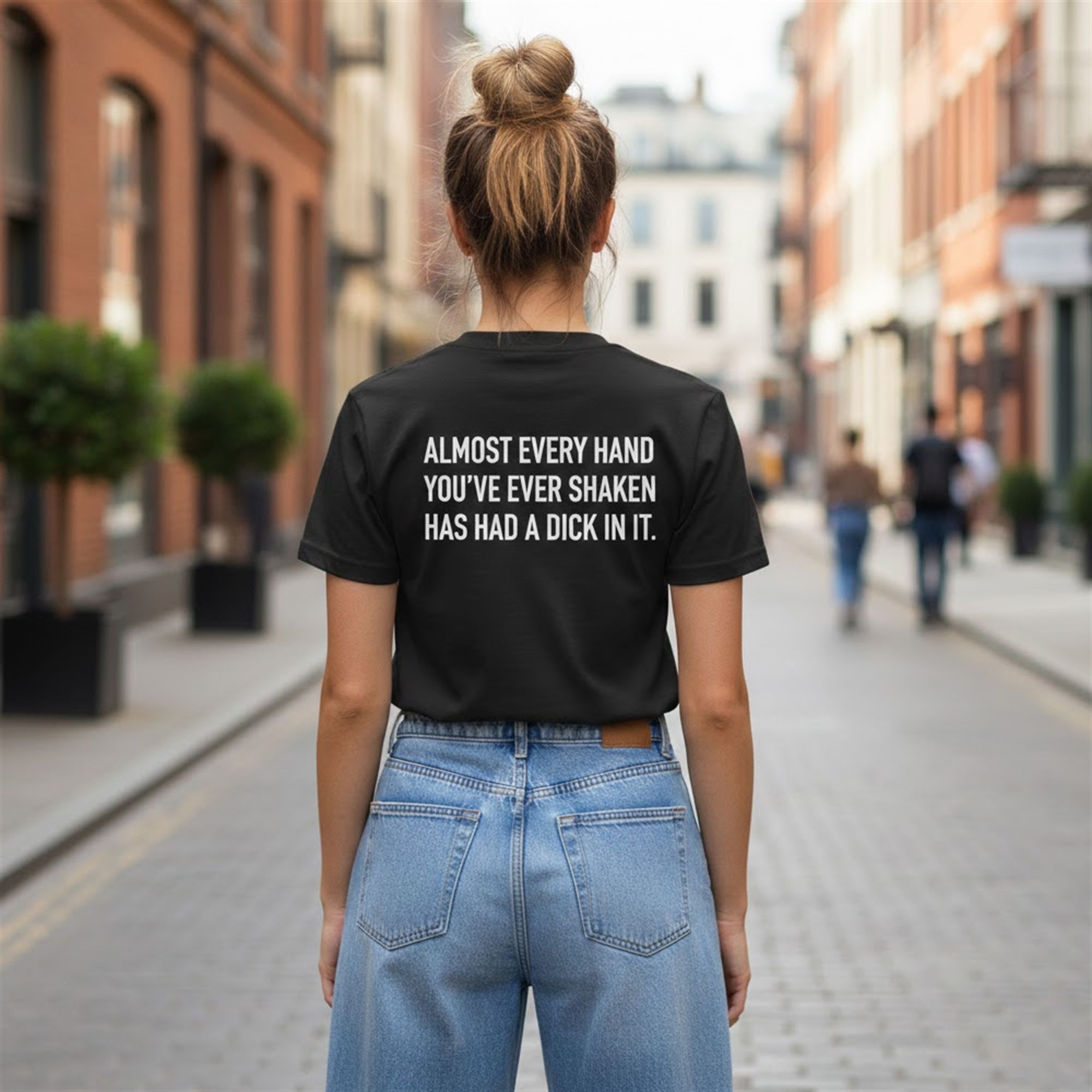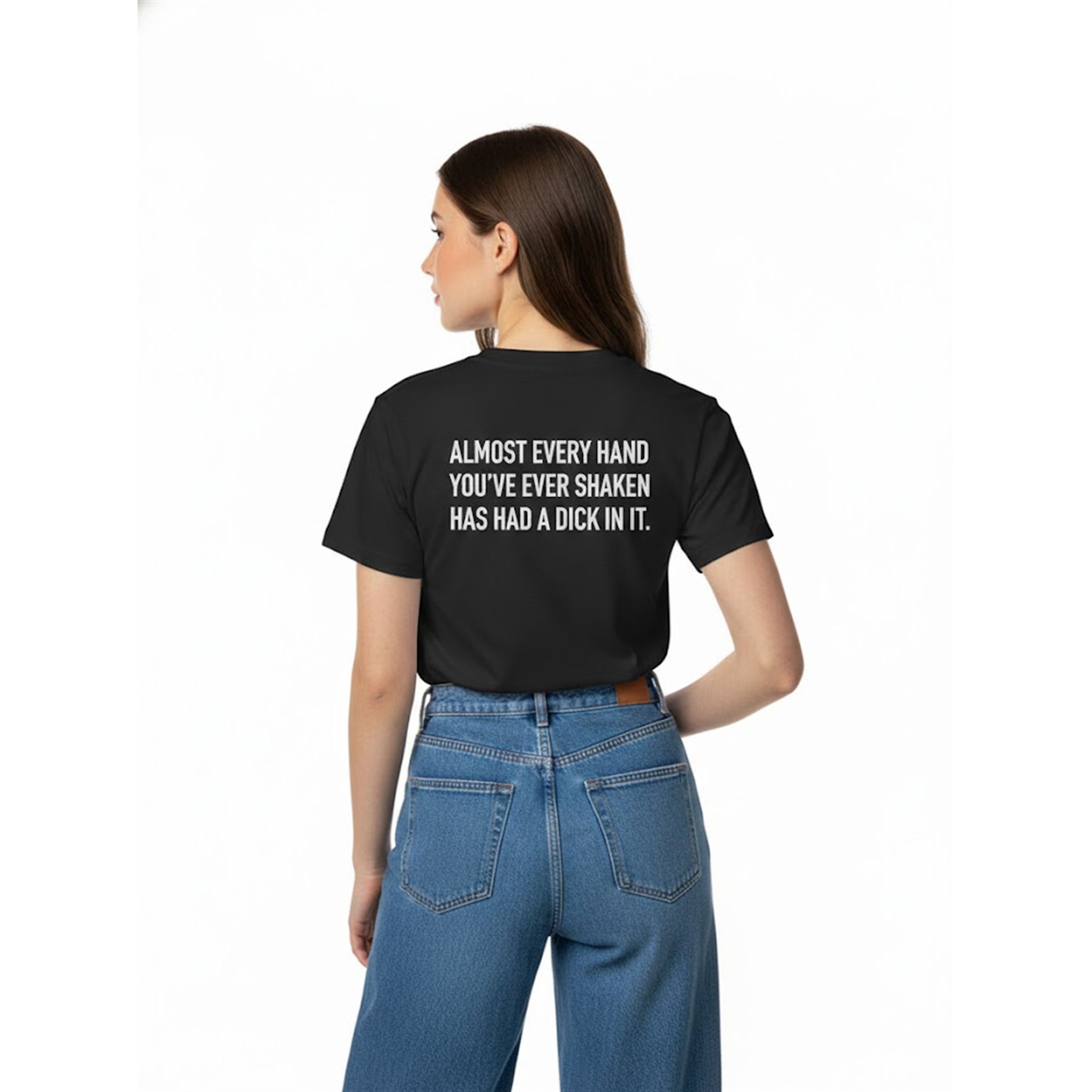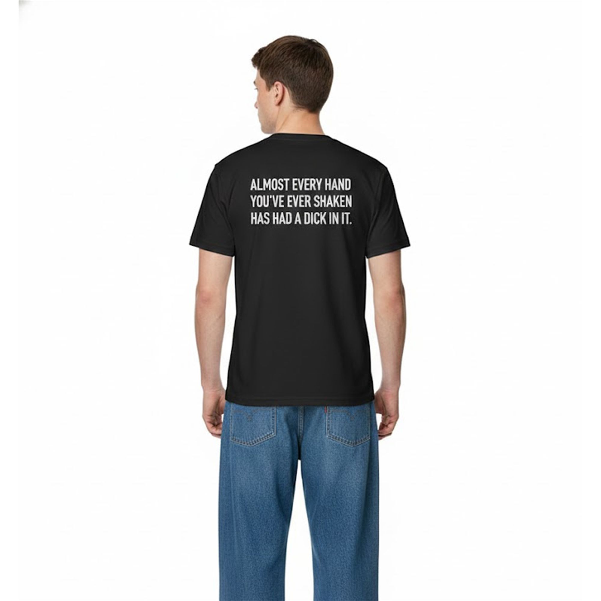 The placement of the text “Almost Every Hand You’ve Ever Shaken Has Had A Dick In It “—typically on the back—allows for a “delayed reveal.” You can engage in a normal conversation, shake someone’s hand, and then walk away, leaving them to read the message and process the uncomfortable reality of what they just read. It is designed for the bold personality who enjoys edginess and isn’t afraid to push the boundaries of polite society. This product aligns perfectly with the current trend of “statement streetwear,” where the value lies entirely in the message and the reaction it provokes.