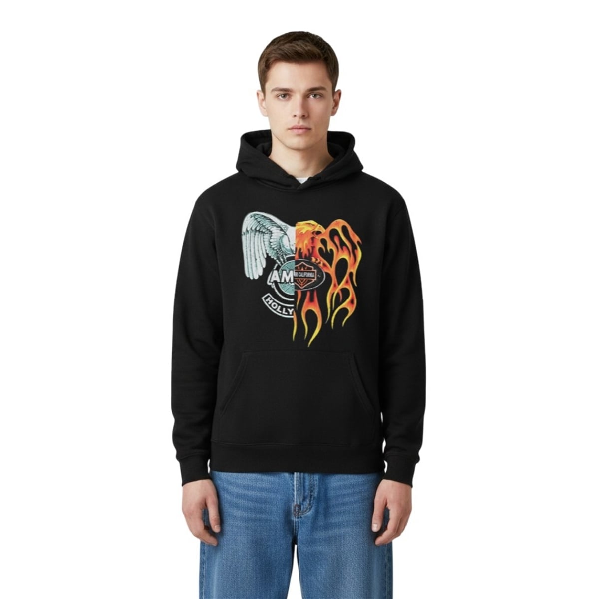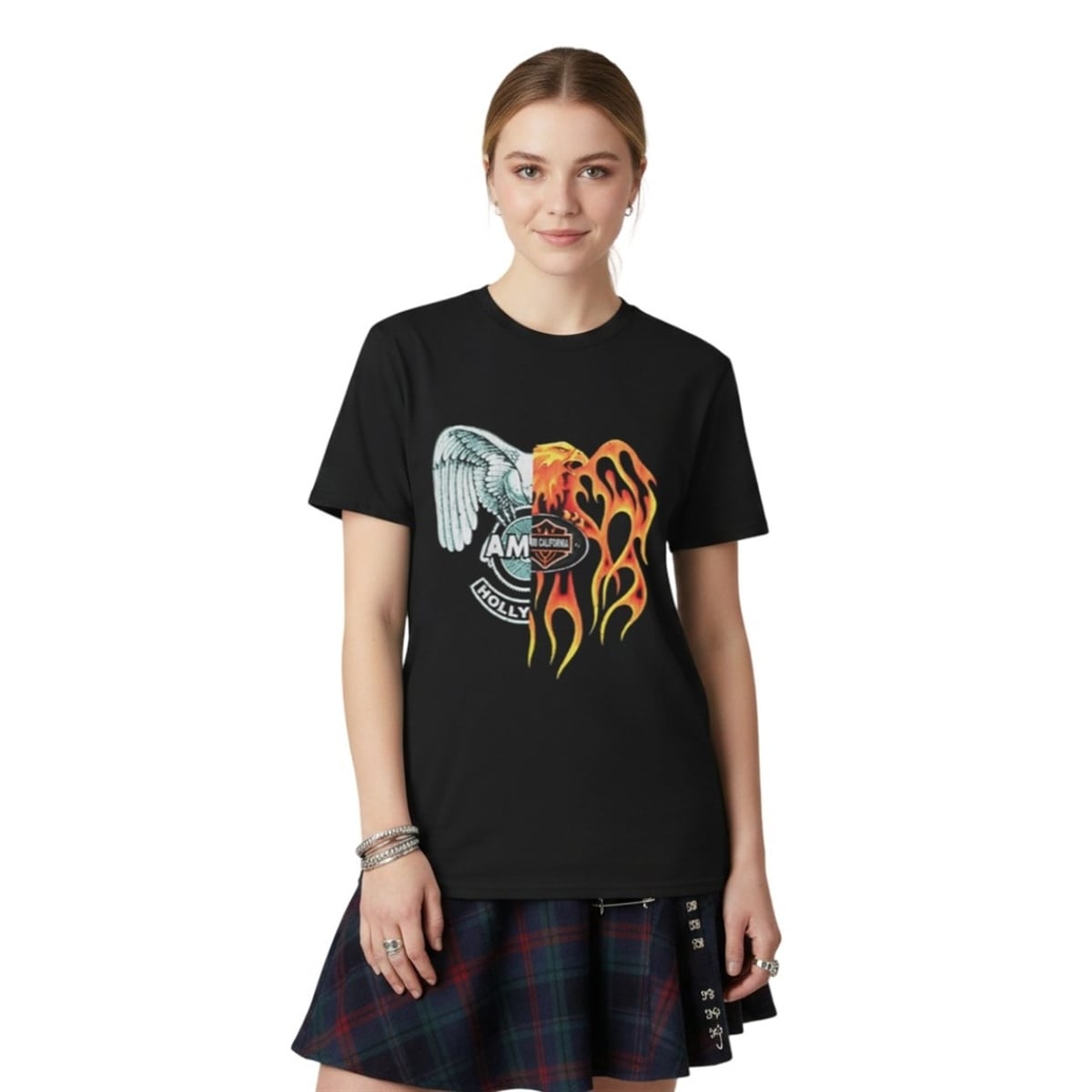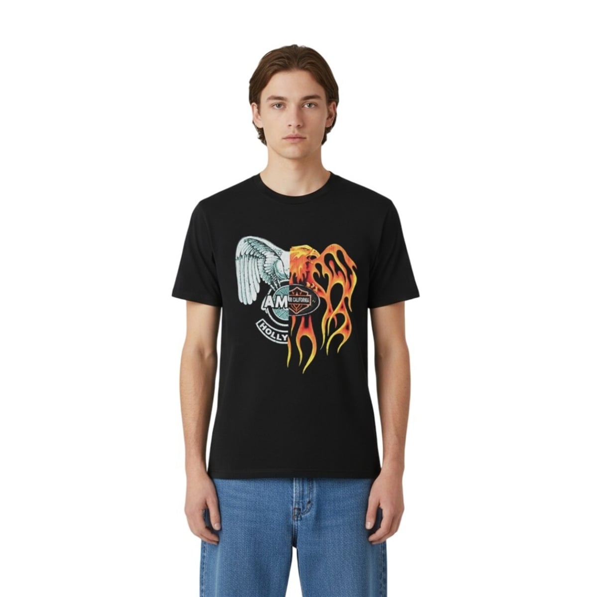 The shirt is a masterclass in visual storytelling and modern streetwear aesthetics. Set against a deep, solid black background, the centerpiece of this garment is a dramatic, split-screen style graphic that demands immediate attention. On the left side of the graphic, a majestic, vintage-inspired eagle is rendered in cool, icy blues and whites, perched above a classic “AMIRI HOLLYWOOD” circular crest. On the right side, the imagery abruptly transforms into a fiery, rebellious motif featuring a stylized eagle consumed by vibrant orange, yellow, and red flames. This stark division creates a fascinating optical illusion and a bold visual contrast. The oversized, relaxed silhouette perfectly mirrors the effortless, laid-back styling favored by modern musicians, making it an essential addition for anyone looking to capture that authentic, backstage rock-and-roll vibe.