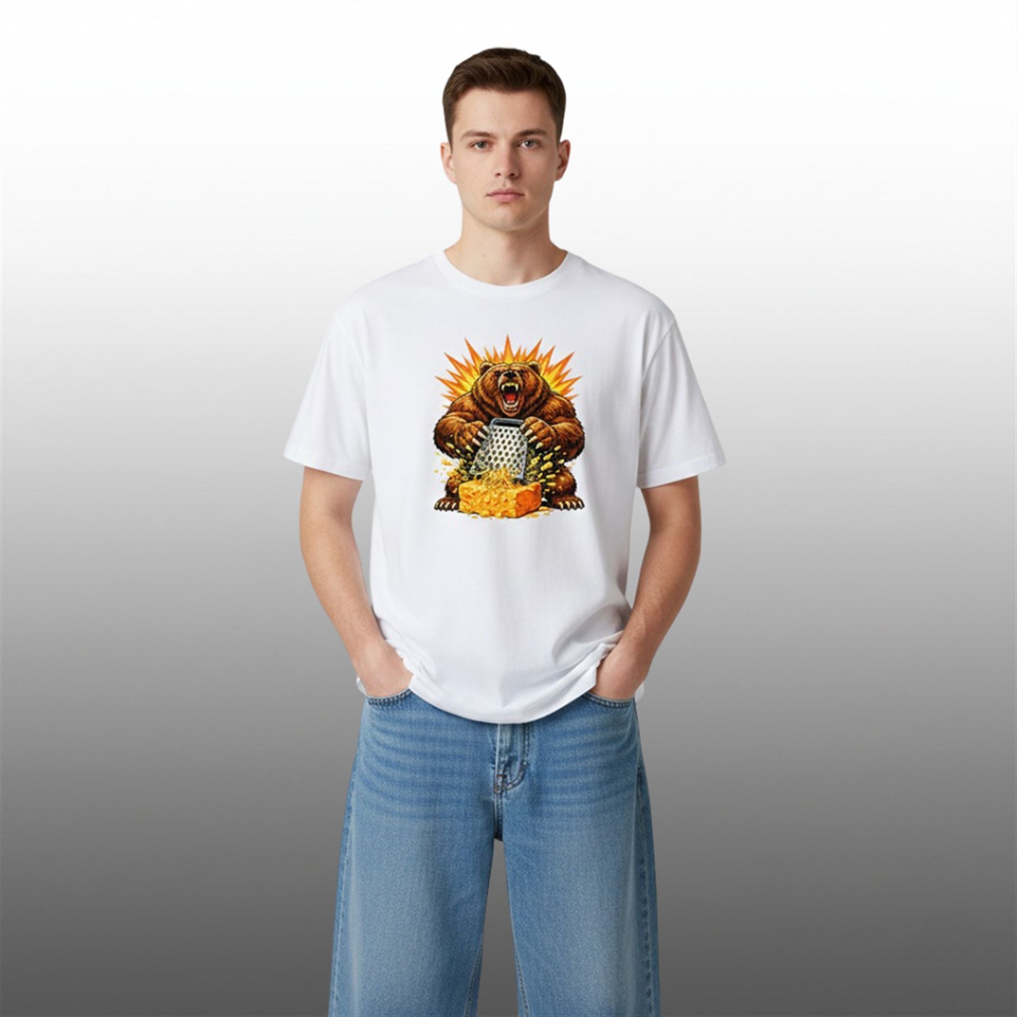 In the world of American football, few rivalries carry the historical weight and genuine animosity of Chicago versus Green Bay. This shirt captures that energy in a single, explosive image. The design centers on a stylized, roaring bear—representing the heart and soul of Chicago football—taking a massive cheese grater to a block of Swiss. It is a literal and metaphorical representation of shredding the competition.