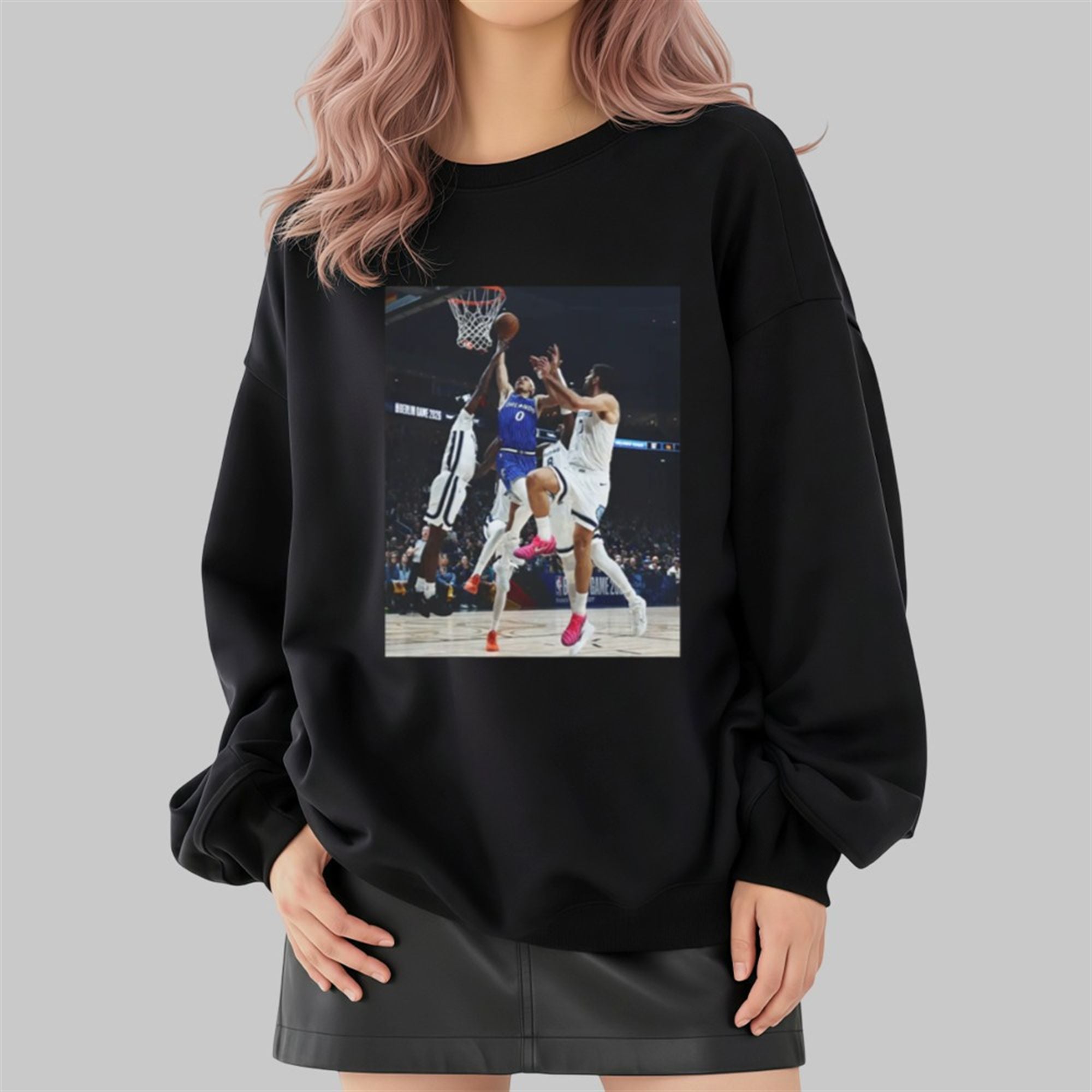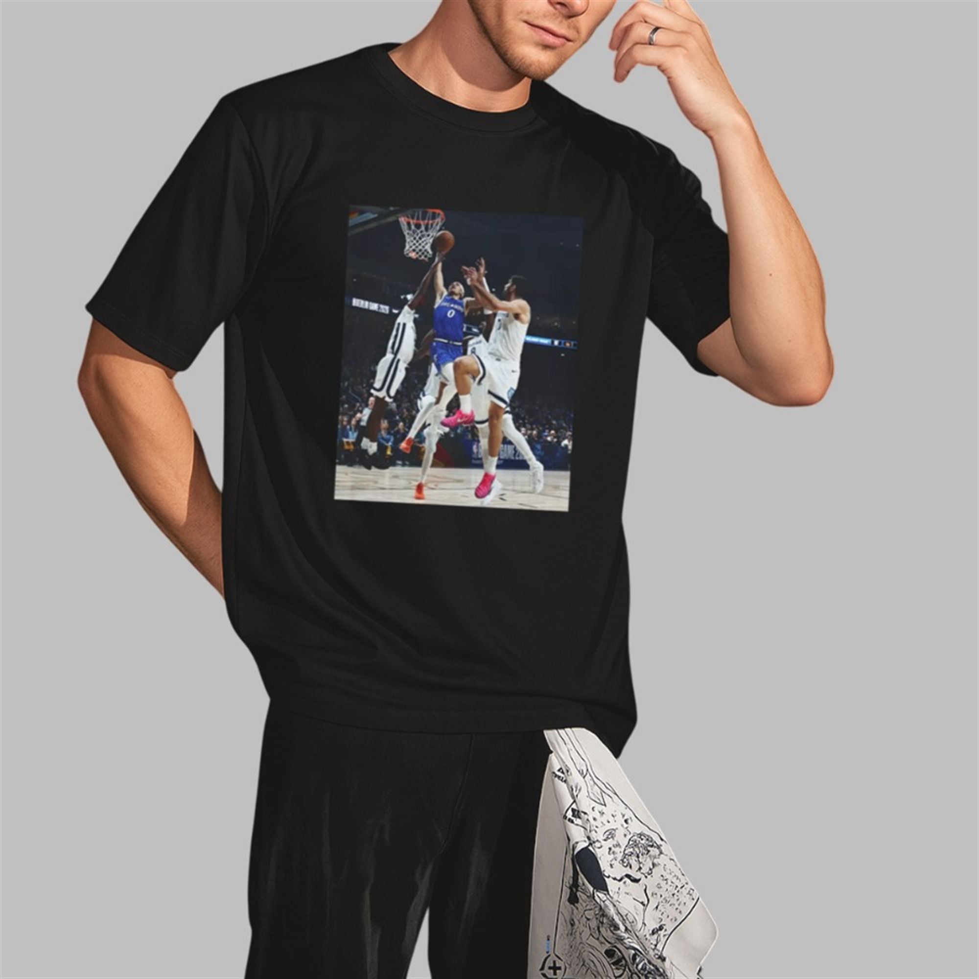 This apparel is more than just fan gear; it is a wearable piece of history. The graphic centers on the explosive athleticism of Anthony Black (AB) as he elevates in his blue jersey, contrasting sharply against the white uniforms of the four defenders foolish enough to contest him.