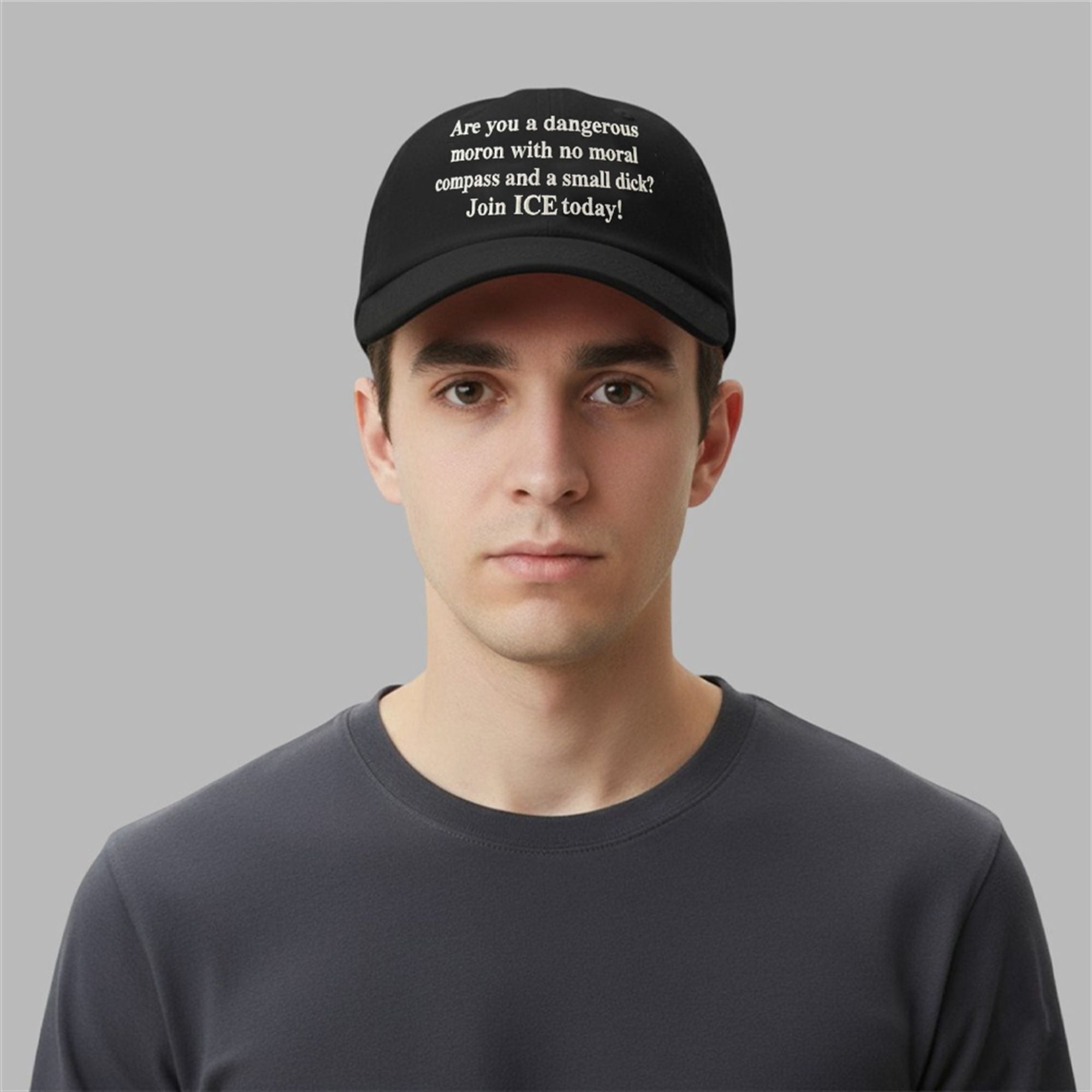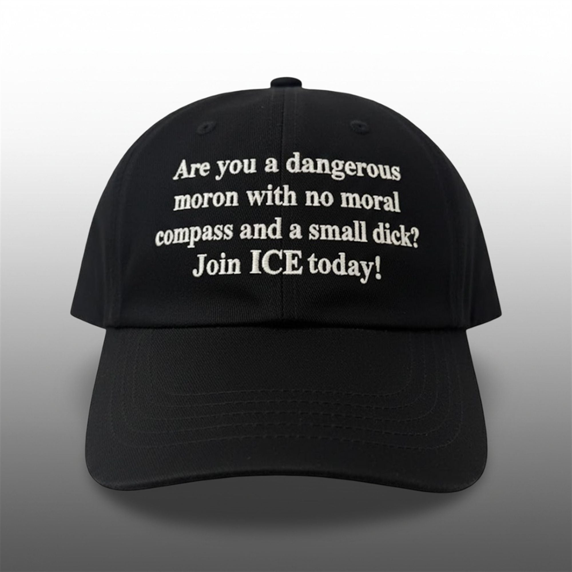 The Join ICE Today Satire Hat is a high-impact accessory defined by its uncompromising message. The design features a classic, structured silhouette with a curved brim, providing a timeless look that fits seamlessly into modern streetwear trends. The focal point of the product is the white text “Are You A Dangerous Moron With No Moral Compass And A Small Dick Join ICE Today” against a solid black background, ensuring maximum readability even from a distance. The text poses a rhetorical, satirical question regarding moral compasses and employment, aimed specifically at critiquing the U.S. Immigration and Customs Enforcement (ICE).