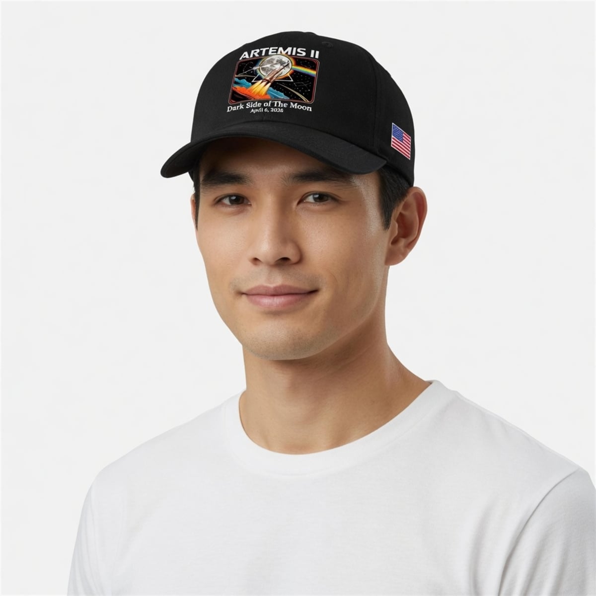 The hat is a specialized piece of commemorative apparel designed to celebrate one of the most significant aerospace milestones of the 21st century. Set against a sleek, dark background, the front profile features a vivid graphic of a spacecraft launching upward through a geometric prism, leaving a bright rainbow trail in its wake. The design is framed by nostalgic, retro-futuristic borders and prominently displays the text “ARTEMIS II,” “Dark Side of The Moon,” and the exact date of the lunar flyby, “April 6, 2026.” Completing the patriotic and historical context of the mission, a boldly rendered United States flag adorns the side panel.