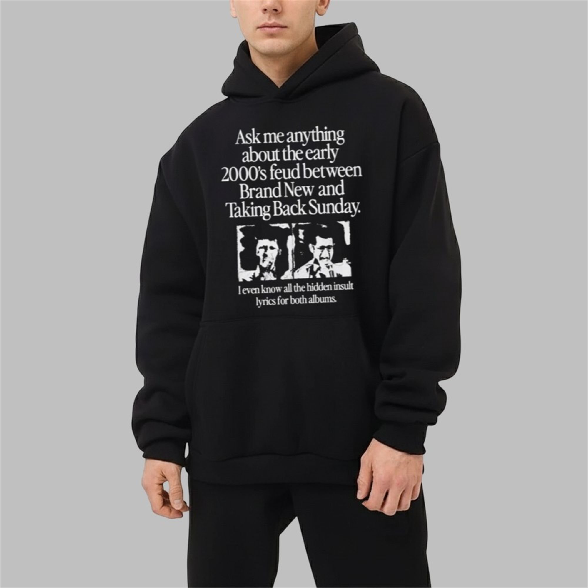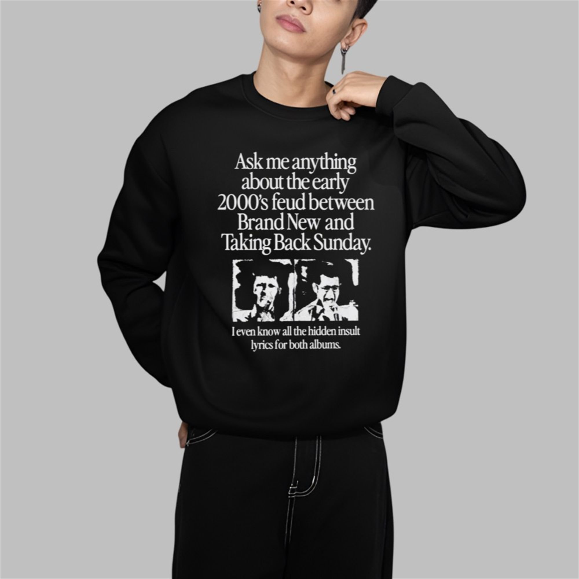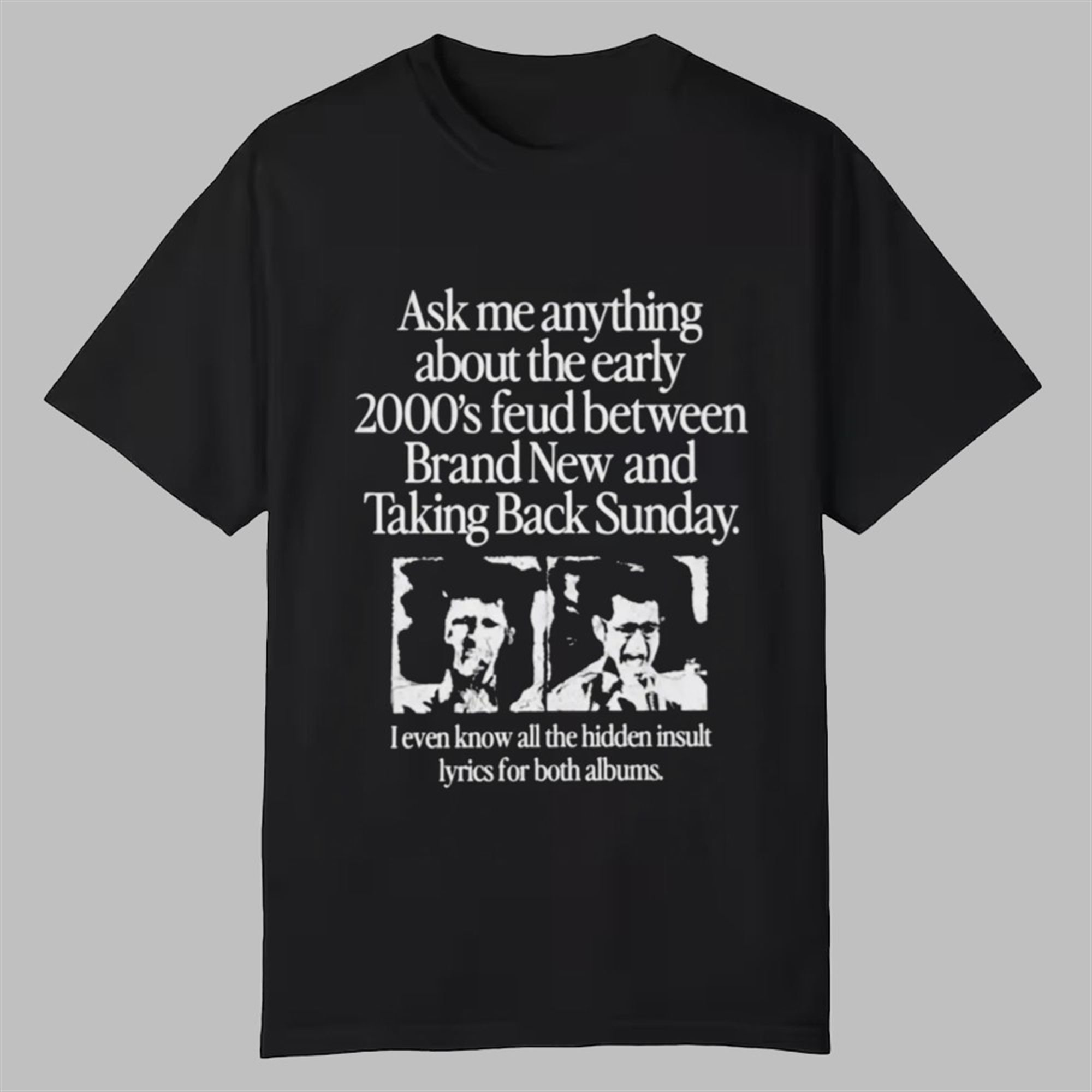 The design is a masterclass in minimalist nostalgia, featuring bold, evocative text that instantly sparks recognition and curiosity. It reads, “Ask me anything about the early 2000’s feud between Brand New and Taking Back Sunday. I even know all the hidden insult lyrics for both albums.” Paired with stark, high-contrast images reminiscent of early 2000s zines and show flyers, this shirt is more than apparel—it’s a conversation starter and a badge of honor. It signals that you were there, you paid attention, and you remember every sharp-tongued lyric and whispered story that fueled the fire between these two seminal bands.