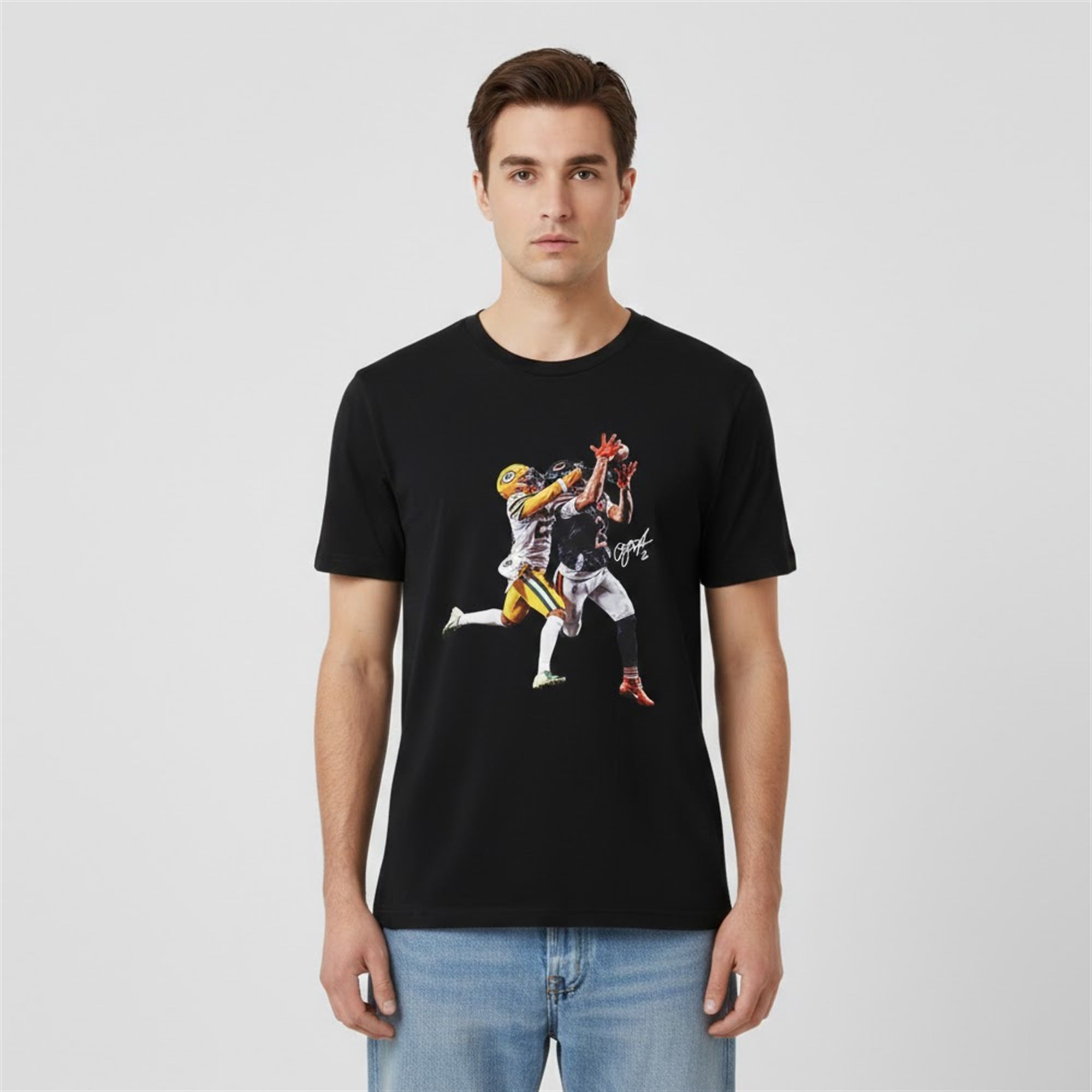 The shirt is not merely a piece of apparel; it is a canvas that documents a pivotal moment in modern sports history. The design focuses on the raw intensity of the game, freezing the exact millisecond of a spectacular catch. The graphic features a high-definition, stylized rendering of the receiver extending for the ball, dominating the defender in a display of pure athleticism. The visual contrast of the dark uniform against the opponent’s colors creates a striking focal point that draws the eye immediately.