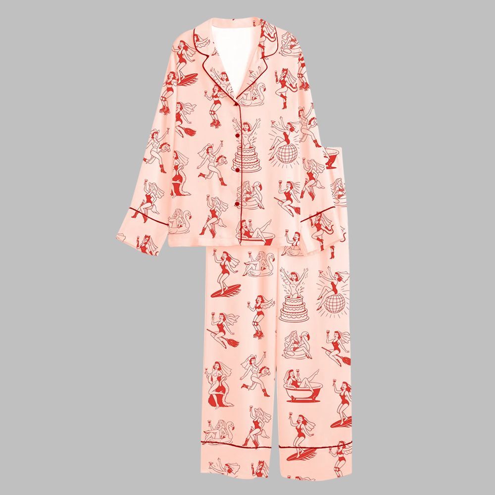 Designed with a playful, vintage-inspired print featuring charming illustrations of dancing figures, champagne bottles, wedding cakes, and disco balls, this set perfectly captures the joyous spirit of a bachelorette party. Its soft, comfortable fabric and relaxed fit make it ideal for lounging, picture-taking, and all the exciting moments leading up to the big day.