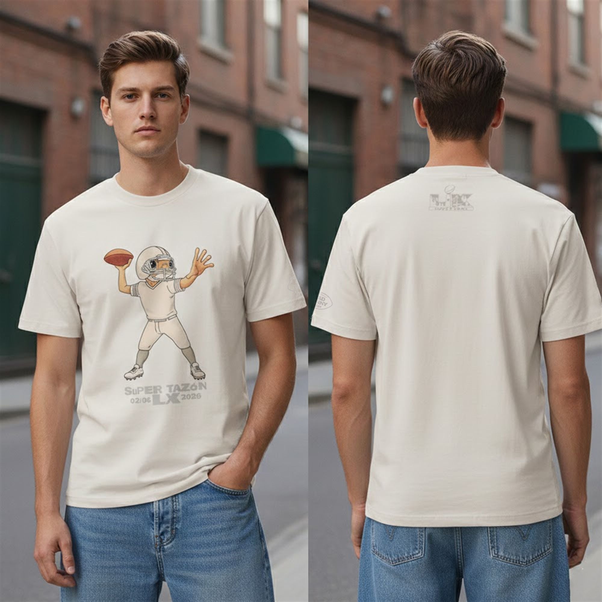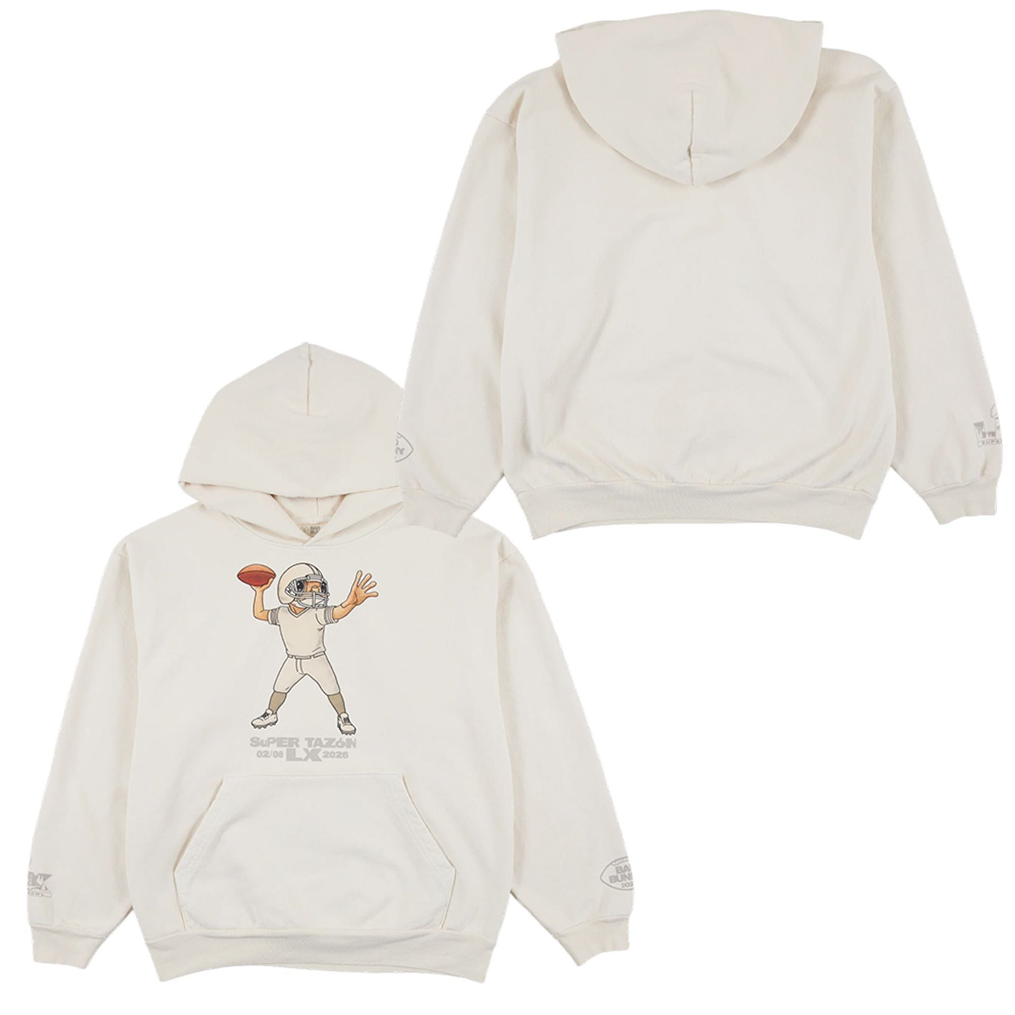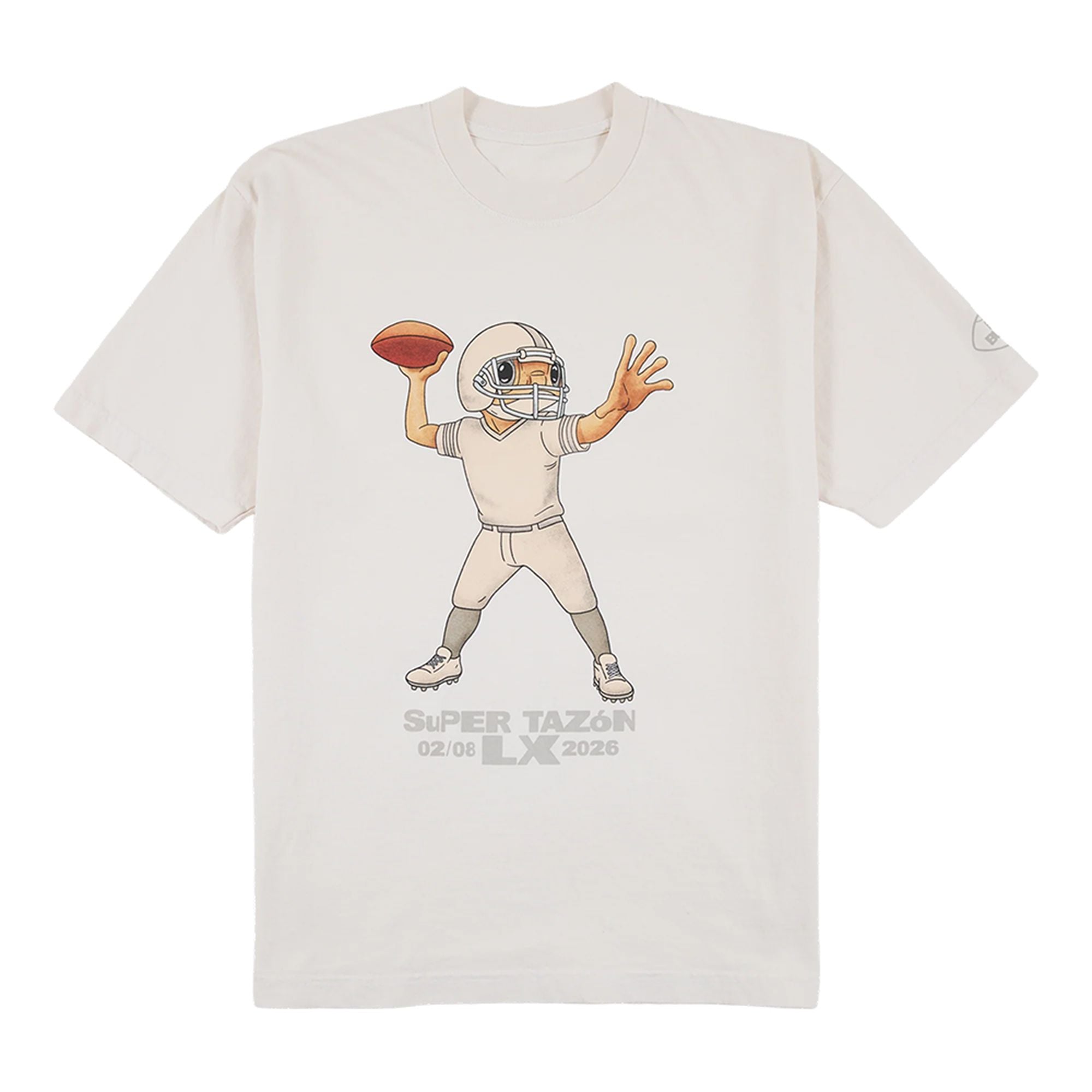 Designed for the trendsetting fan, this graphic tee features a playful yet iconic reimaging of Bad Bunny’s beloved visual identity. The artwork depicts his signature character—reminiscent of the Un Verano Sin Ti era—suited up in full football gear, poised to throw a touchdown. The “Super Tazón” text (Spanish for “Super Bowl“) boldly claims the event for the Latino community, reflecting the bilingual, border-breaking spirit of the halftime performance. This piece allows fans to hold onto the magic of the performance that united the world under the banner of “Latino Gang.”