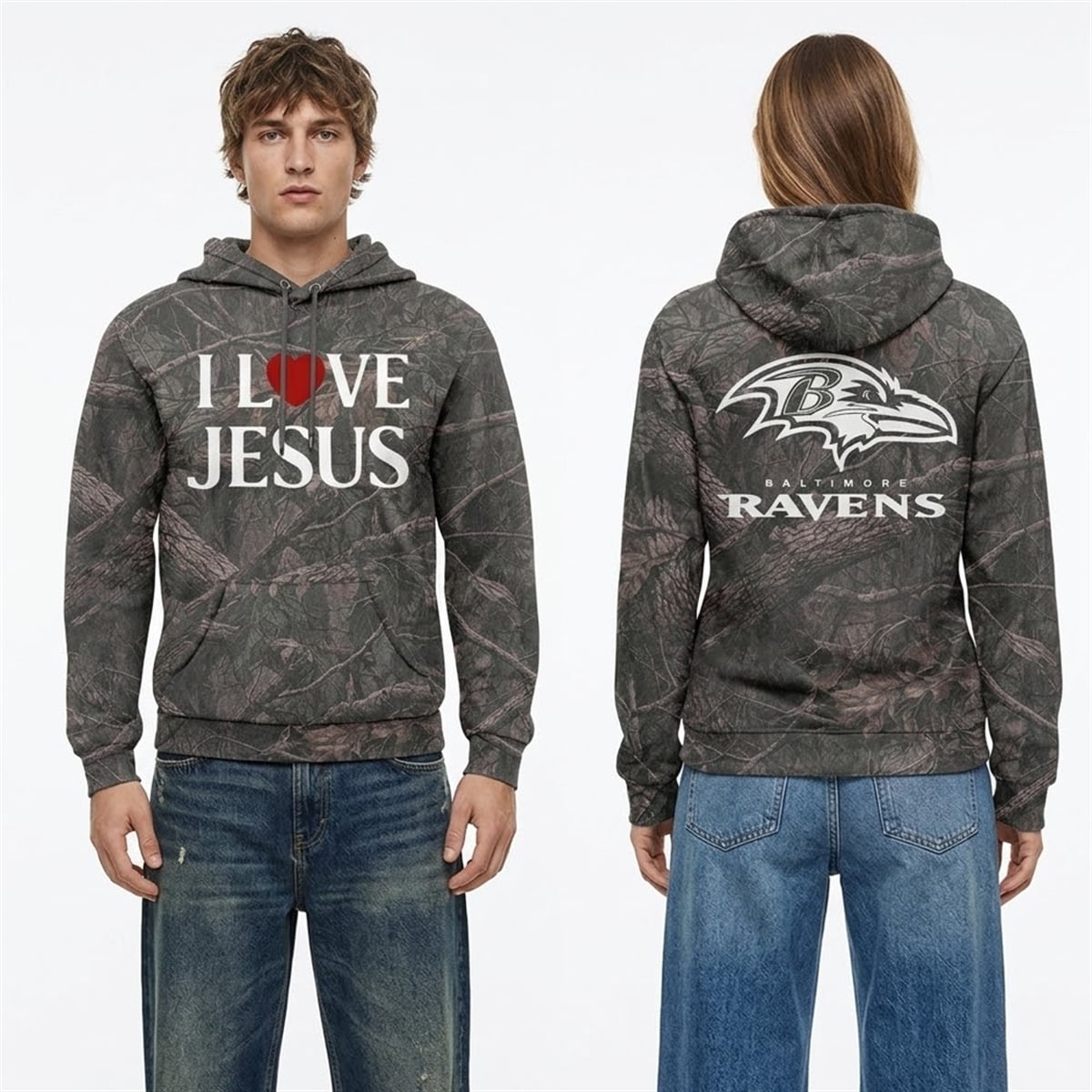This item is much more than just a piece of sports merchandise; it is a wearable hierarchy of personal values. The hyper-realistic forest camouflage serves as a grounding element, representing a deep-seated connection to nature, the wilderness, and the quiet peace of the outdoors. Layered on top of this is the “I Love Jesus” text, front and center, symbolizing that the wearer’s faith is their leading characteristic and primary guiding force. Finally, the massive Baltimore Ravens emblem on the back anchors the wearer to their geographic roots and community loyalty. By combining these elements, the design tells a complete story about the person wearing it: they are a believer first, a nature lover by nature, and a member of the Ravens Flock through and through.