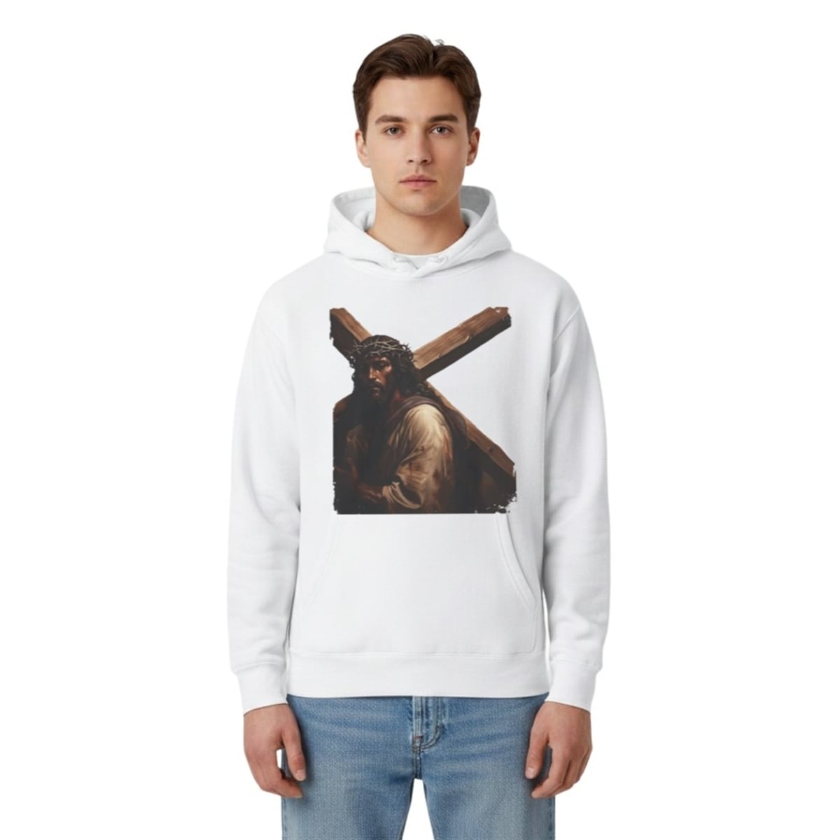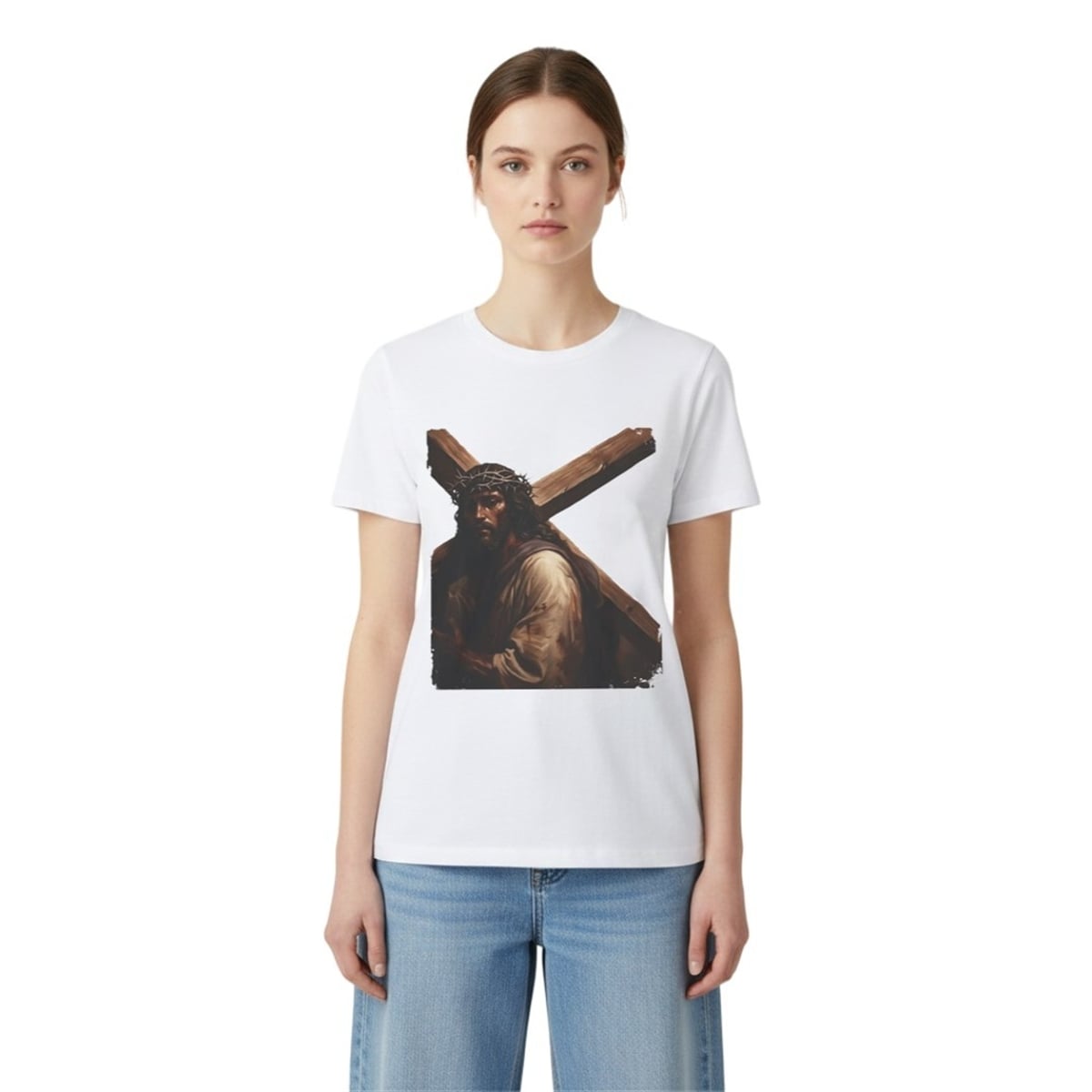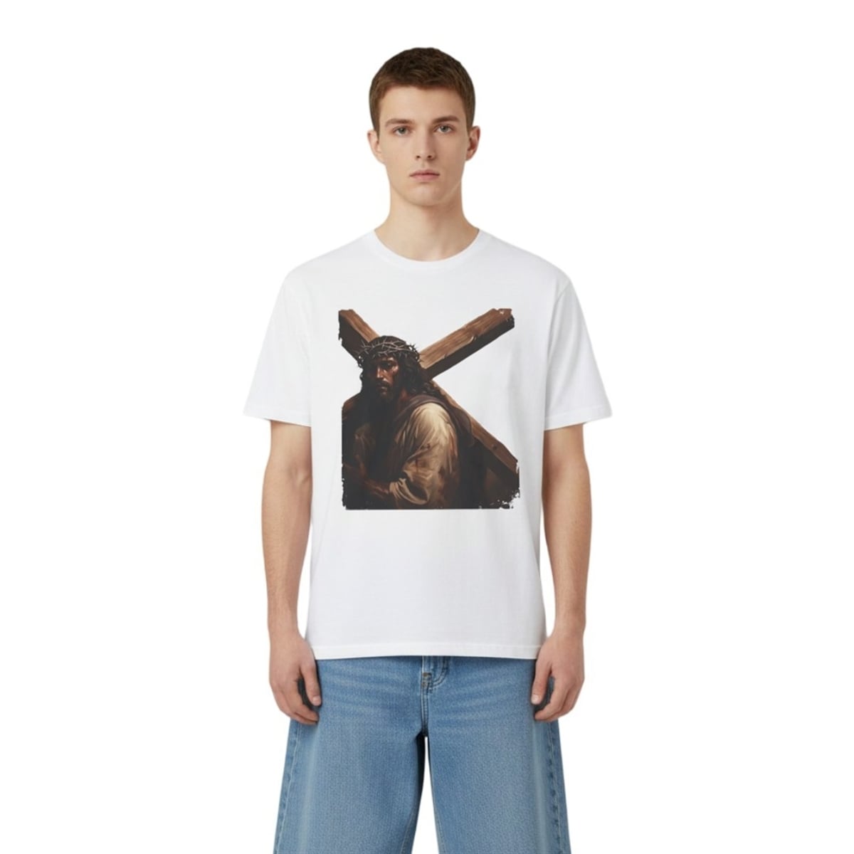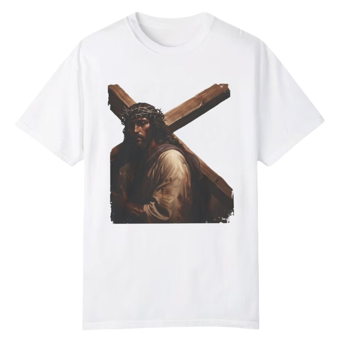 The shirt features a visually arresting front graphic that demands immediate attention. Set against a clean, minimalist background, the central artwork displays a beautifully rendered, traditional portrait of Jesus Christ wearing the crown of thorns and carrying a heavy wooden cross. The artwork is characterized by its deep, rich, earthy tones—featuring profound browns, warm shadows, and realistic detailing that mimics classical oil paintings.