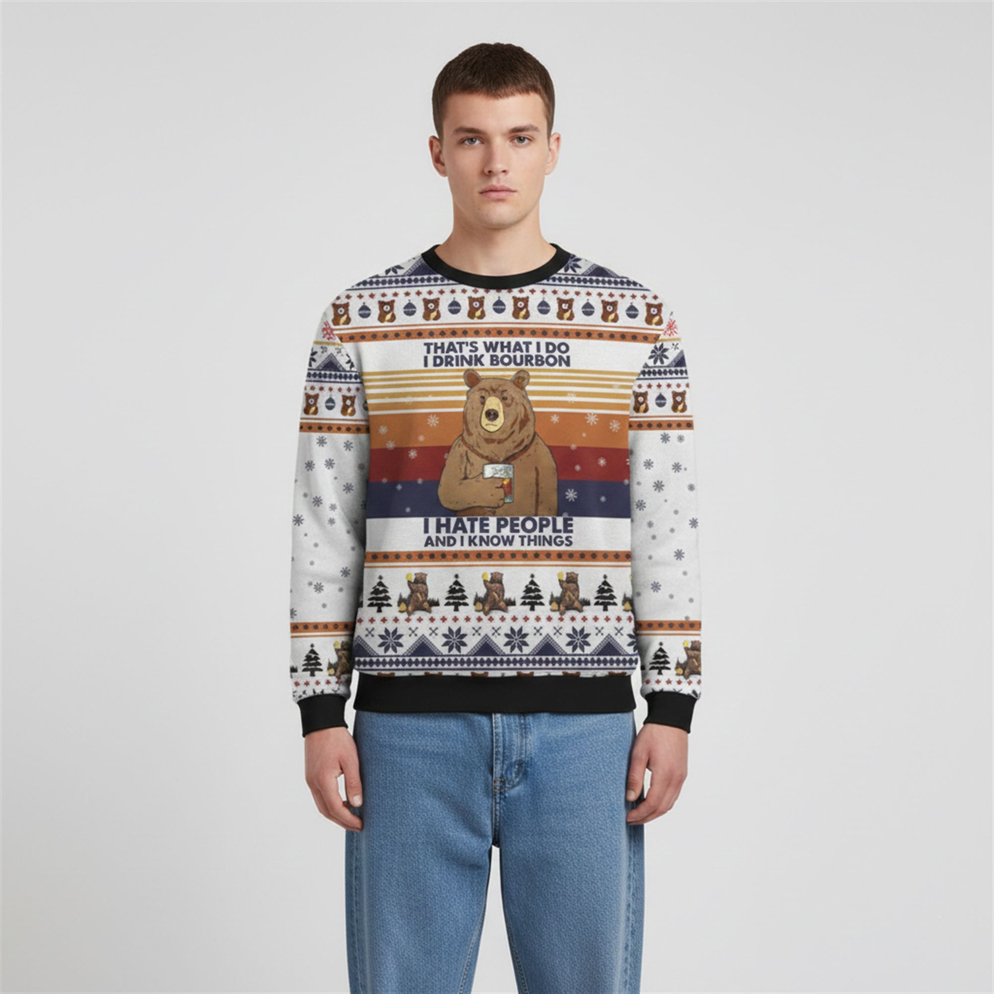 The centerpiece of the sweater is a stoic brown bear set against a retro sunset background, clutching a tumbler of amber liquid. The text—a witty parody of the famous Game of Thrones quote “That’s What I Do I brink Bourbon, I Hate People and I Know Things”—resonates with anyone who values solitude, intelligence, and fine spirits. The color palette blends warm vintage oranges and tans with deep holiday navys and whites, making it a versatile piece that pairs perfectly with jeans or lounge pants.