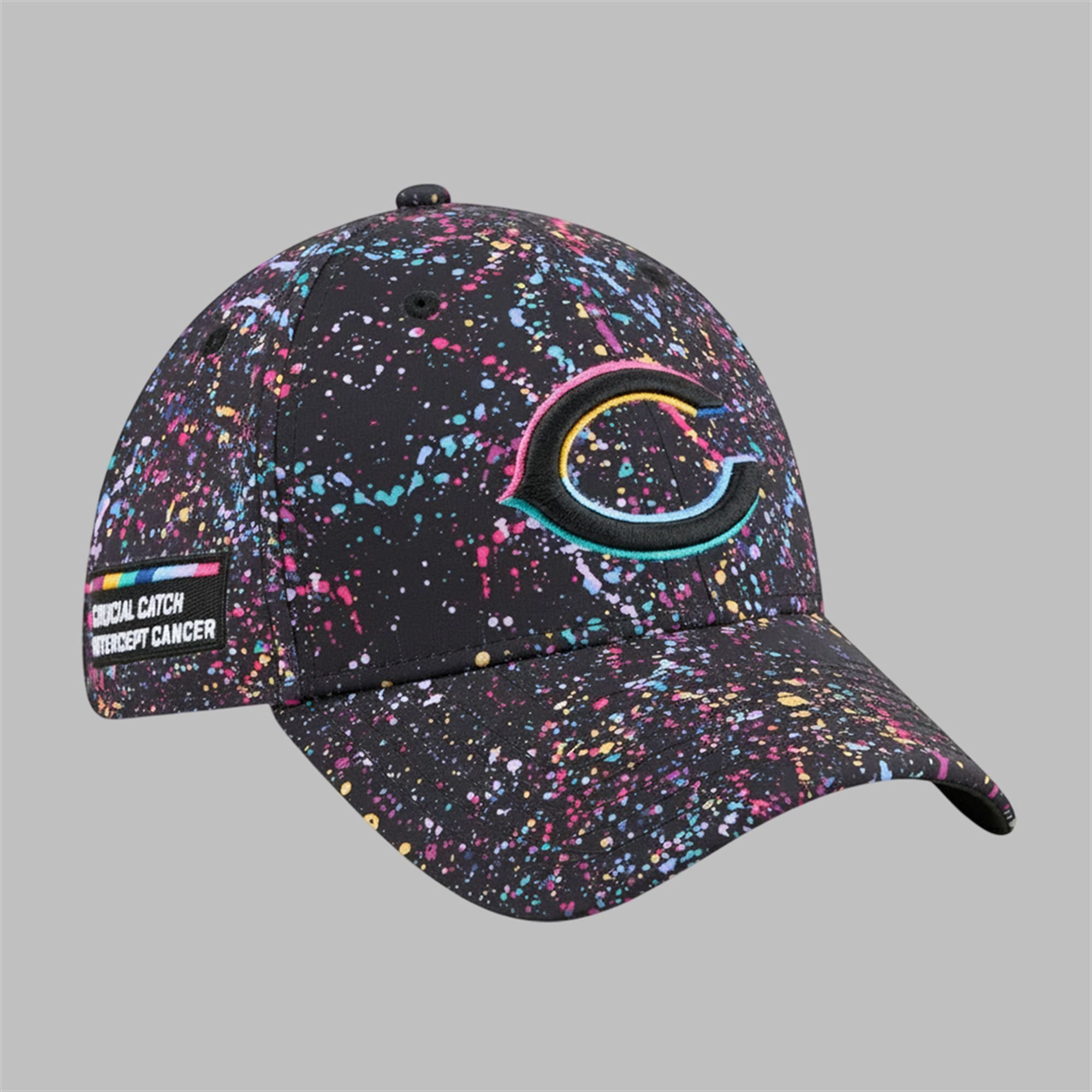 The centerpiece is the iconic Chicago Bears “C” logo. The logo itself is outlined in a sharp, tri-color gradient of teal, blue, and pink, making it pop against the black fill and chaotic-yet-beautiful splatter background. On the side, the hat features the “Crucial Catch / Intercept Cancer” patch, woven with a rainbow gradient that signifies the campaign’s commitment to fighting all types of cancer. This patch is your mark of authenticity, proving you have the genuine, league-approved item.