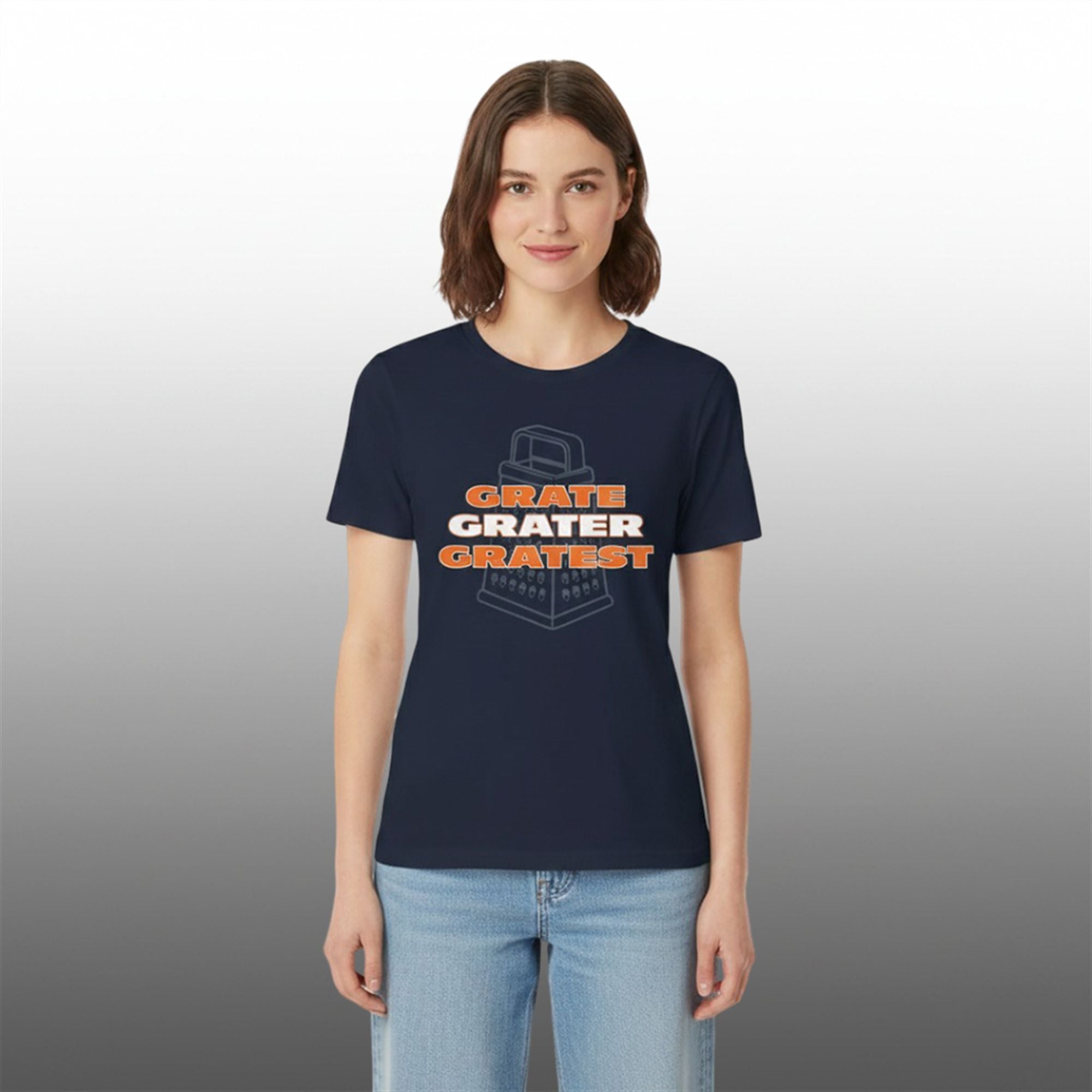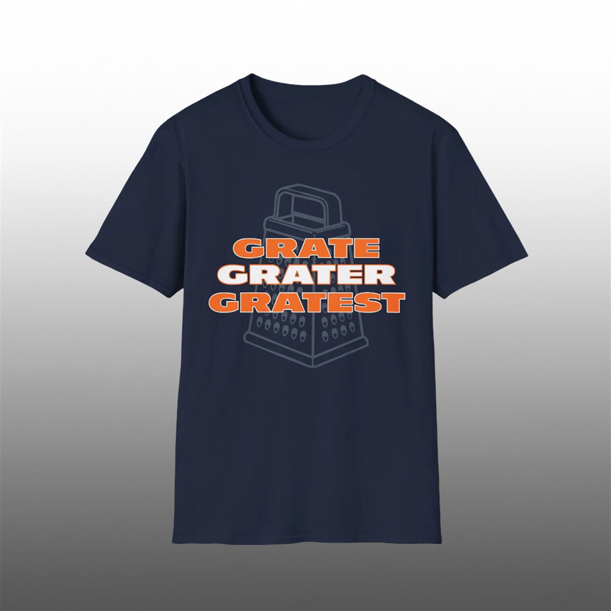 The design features the text “GRATE, GRATER, GRATEST” stacked boldly over a line-art illustration of a box grater. This triple-play on words serves two purposes. First, it plays on the adjectives “Great, Greater, Greatest,” asserting your team’s dominance and superior status in the league. Second, it reinforces the action of the grater itself, emphasizing the dismantling of the rival team. The color palette utilizes the iconic navy blue and orange associated with Chicago football, ensuring that even from a distance, your allegiance is unmistakable.
