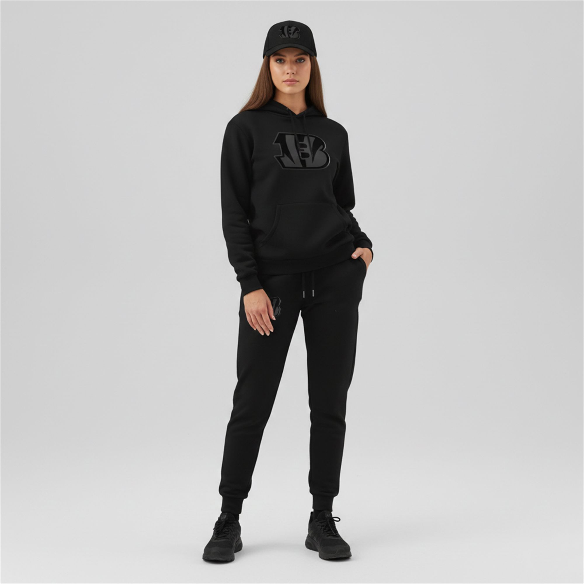 The combo isn’t just merchandise; it is a uniform for the most dedicated supporters. Moving away from loud, traditional team colors, this collection embraces a modern “stealth” look. The centerpiece is the jet-black hoodie, featuring the iconic Bengals “B” logo rendered in a striking metallic grey and black palette. The back of the hoodie makes a bold statement with “CINCINNATI BENGALS FOOTBALL” text arching proudly over the logo, ensuring your allegiance is visible from every angle.