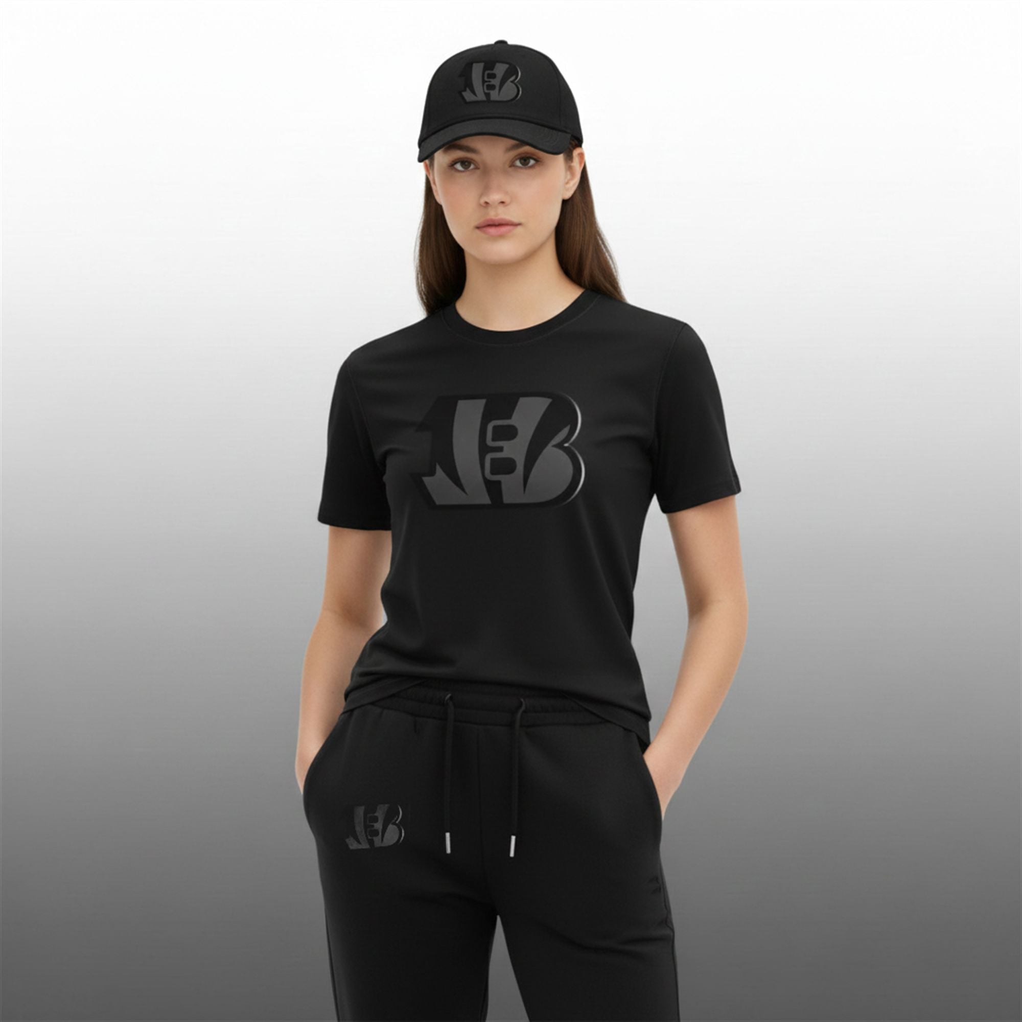 The shirt is a bold departure from the standard team shop fare. While the Bengals are famous for their stripes, this tee strips away the excess to focus on raw power and identity. The shirt features a premium black cotton base with the iconic “B” logo rendered in a stunning 3D-effect charcoal grey on the chest. The back continues the theme with “CINCINNATI BENGALS FOOTBALL” arching proudly over a matching secondary logo.