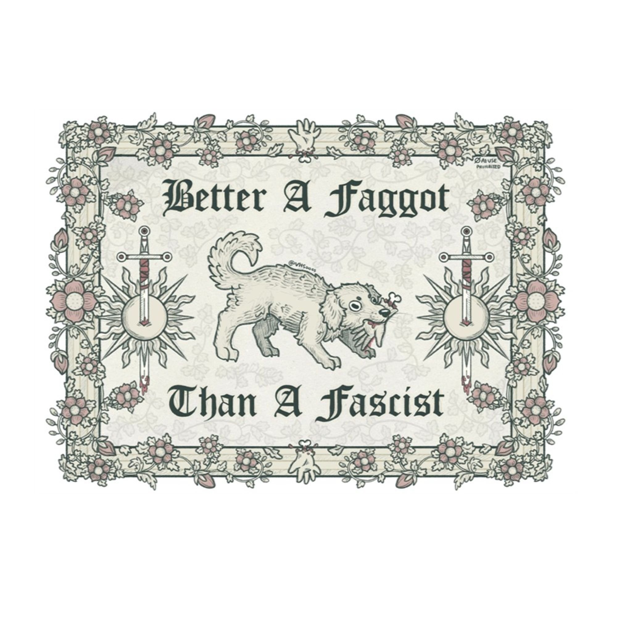 Featuring the unflinching declaration, “Better A Faggot Than A Fascist,” this poster is more than just decoration; it’s a bold statement of identity, solidarity, and unwavering opposition to hate. The design masterfully juxtaposes a powerful, reclaimed term with an intricate, medieval-inspired aesthetic. At its center, a fierce, mythical canine-like creature stands defiantly, rendered in a classic woodcut style. Flanked by ornate swords and radiant suns and framed by a delicate floral border, this piece blends rebellion with renaissance, creating a truly unique visual experience that is both a conversation starter and a profound piece of personal expression.