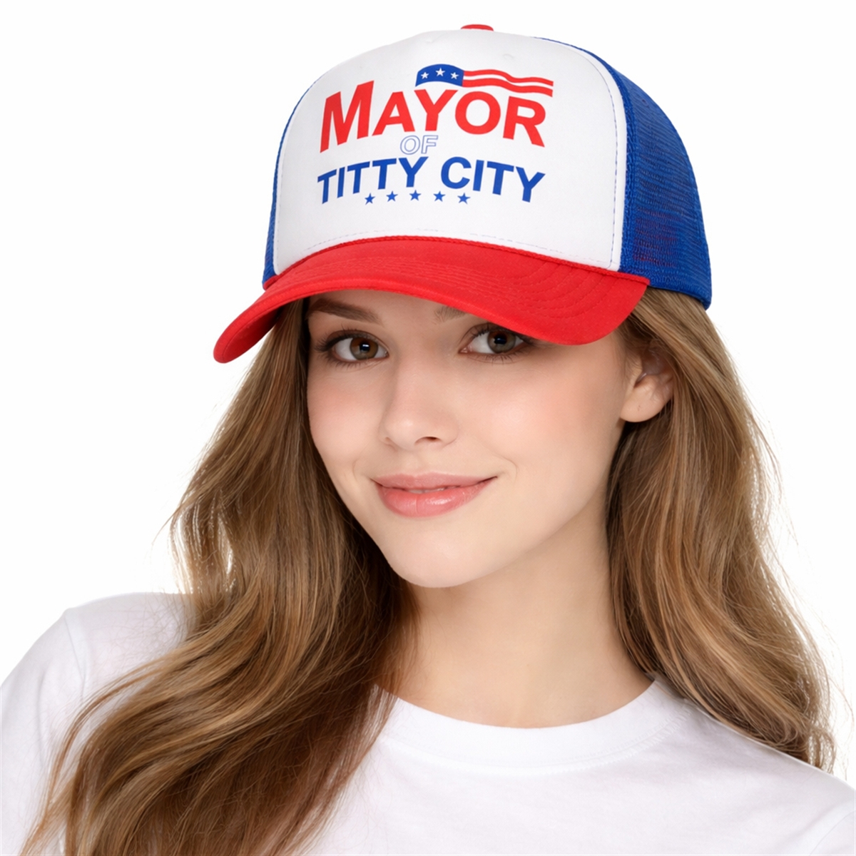 The hat is a masterclass in ironic, statement-driven fashion. Visually, the cap features a striking tri-color Americana palette, boasting a bold red brim, a crisp white front panel, and a vibrant blue back. The front is emblazoned with the now-legendary phrase “MAYOR OF TITTY CITY” in contrasting red and blue typography, accented by a stylized star-spangled banner graphic and a row of classic five-point stars. This design creates a nostalgic, retro aesthetic that contrasts brilliantly with the distinctly modern, provocative text. It is designed to be visually loud, unapologetic, and instantly readable from a distance, making it the perfect focal point for any casual or street-style ensemble.