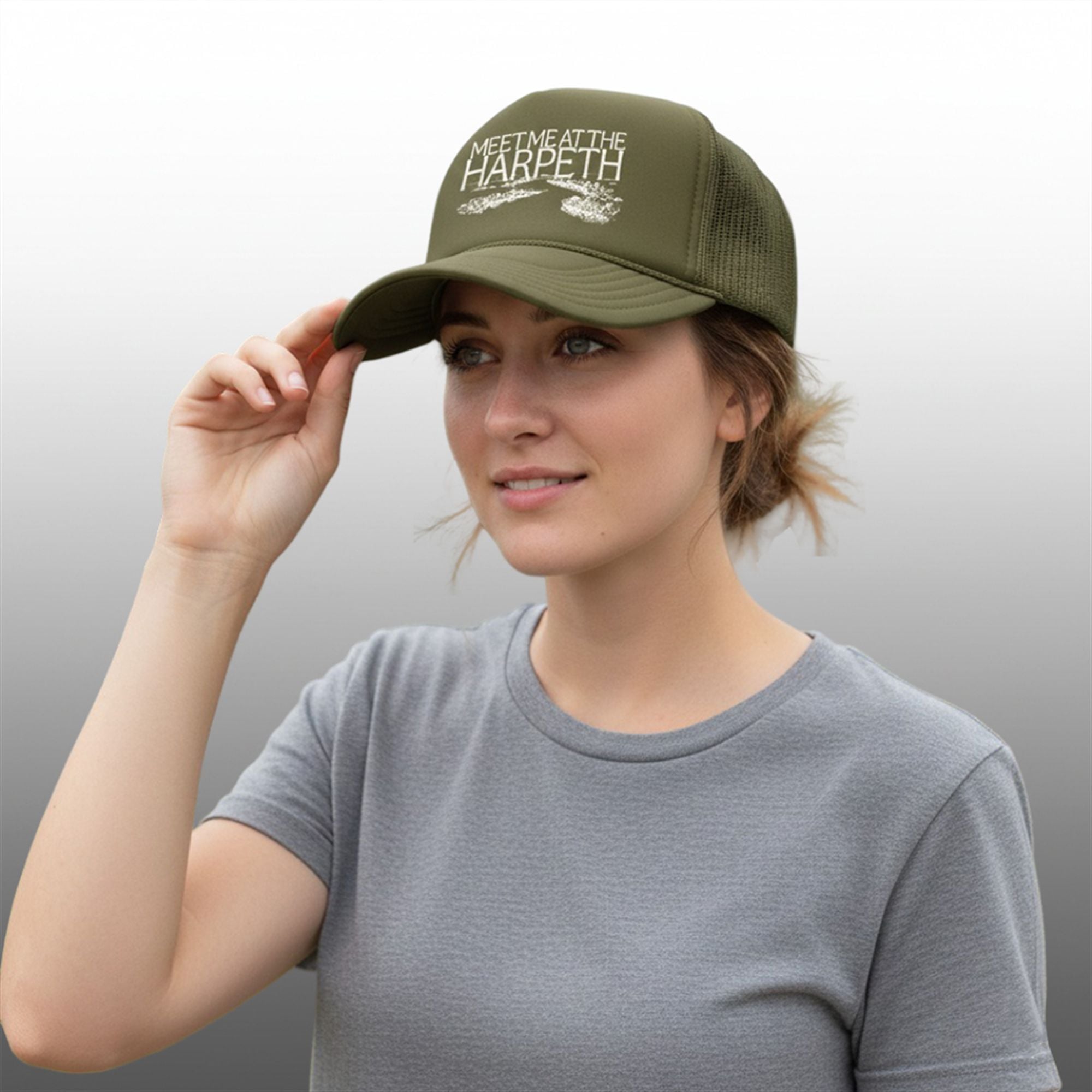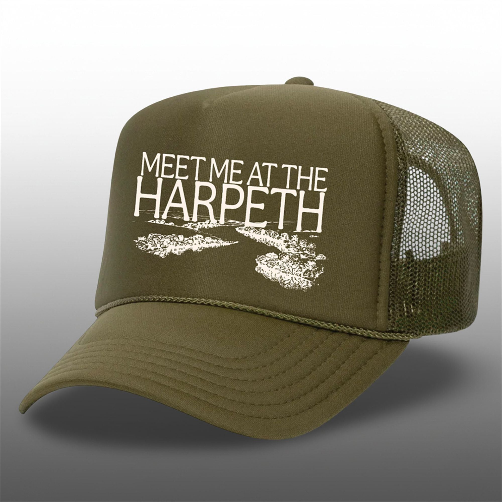 The design features a rich olive/army green colorway that hides river mud and pairs perfectly with flannel, denim, or a life vest. The front panel proudly displays the slogan “MEET ME AT THE HARPETH” in a rustic, hand-stamped font, sitting above a stylized graphic of the winding Harpeth River. Finished with a classic braided rope across the brim—a hallmark of authentic 70s and 80s headwear—this hat bridges the gap between old-school nostalgia and modern outdoor style.
