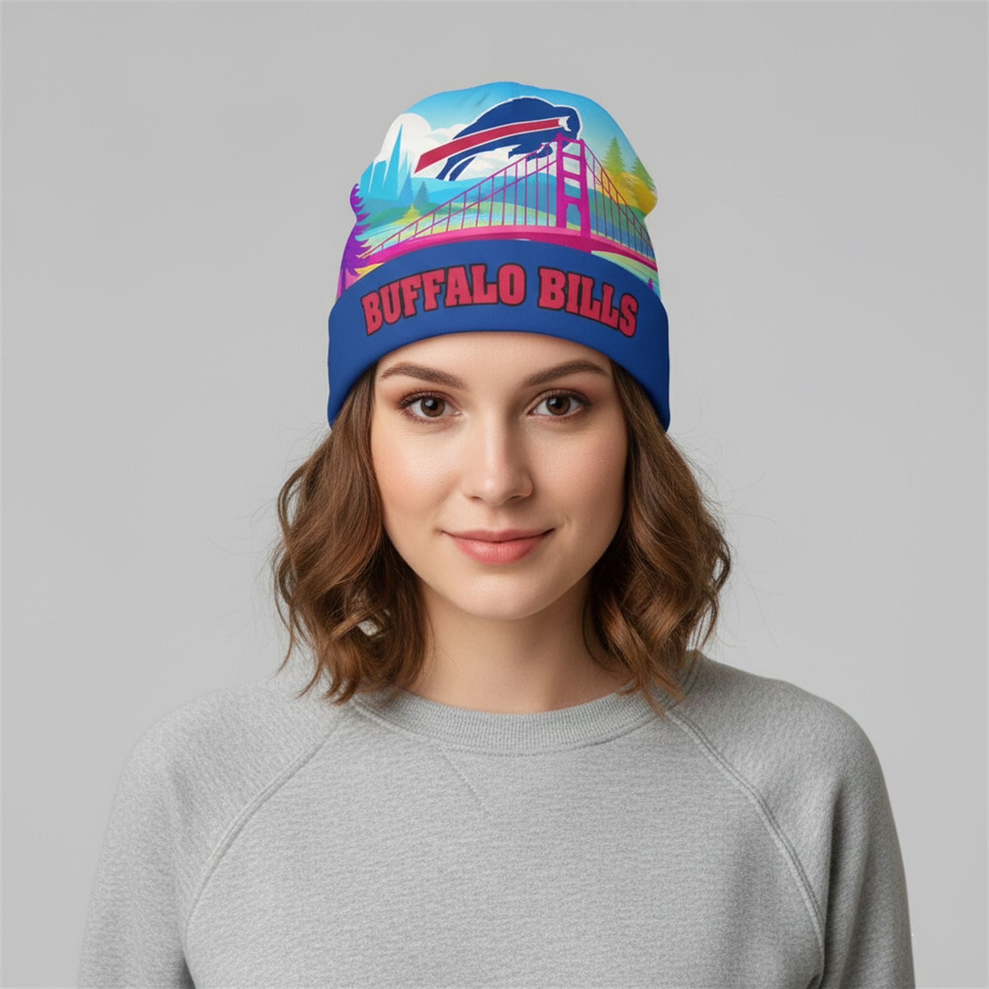 The design features a bold, wrap-around graphic that reimagines the Super Bowl host location through the lens of Bills Mafia. The iconic charging buffalo logo dominates the foreground, superimposed over an artistic rendition of the Golden Gate Bridge rendered in striking magenta and purple hues. The background showcases stylized teal mountains and a sunny California sky, creating a sharp, visually appealing contrast with the traditional Royal Blue cuff that proudly displays the “BUFFALO BILLS” text in bold red lettering. This product captures the energy of Super Bowl 60, making it an essential collector’s item for fans who want to remember exactly where they were when the Bills took the field in February 2026.