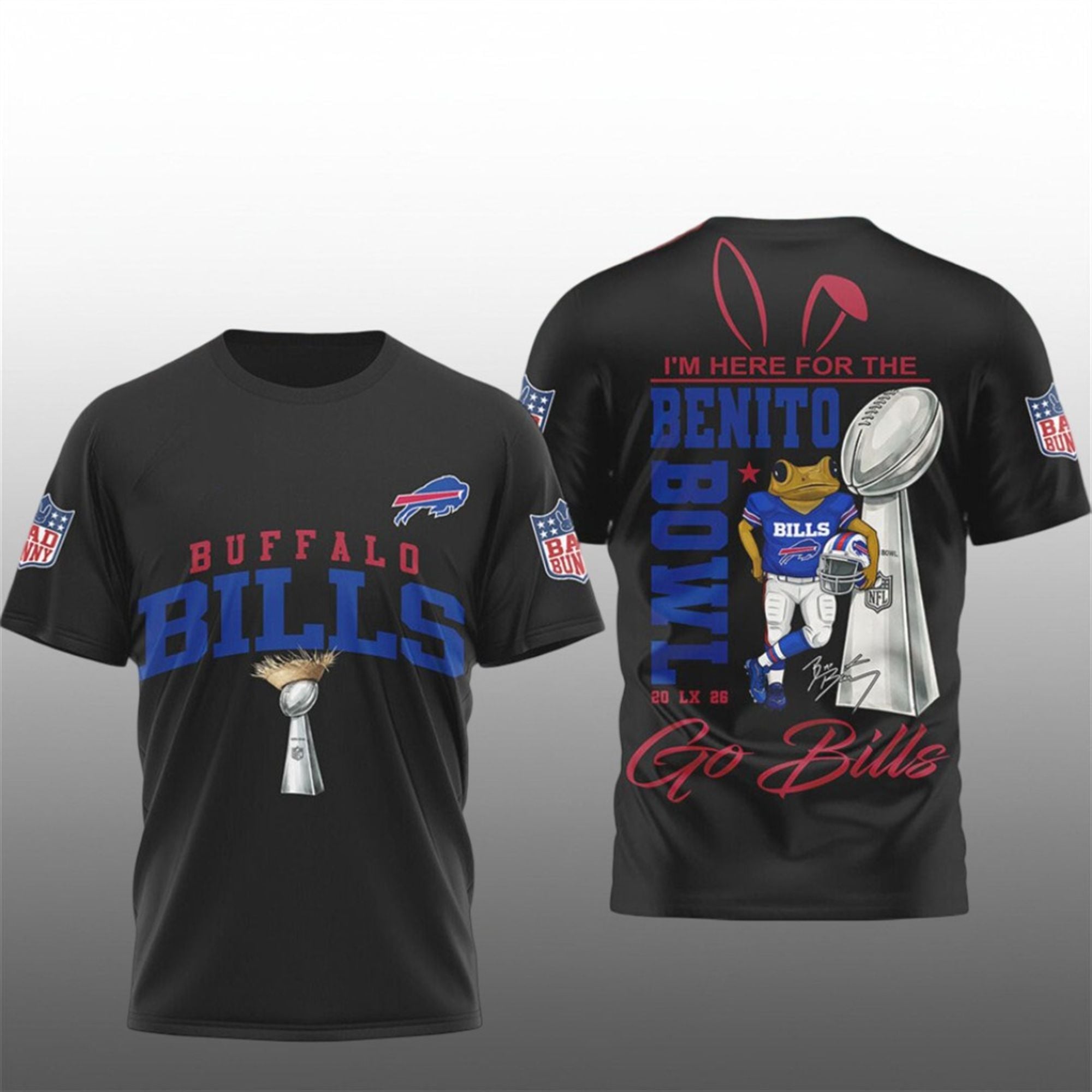 This shirt exploded in popularity because it perfectly bridges the gap between internet meme culture and hardcore sports loyalty. Fans loved the unexpected combination of the most passionate fanbase (Bills Mafia) with the world’s biggest Latin music superstar, creating a humorous “what if” scenario for the Super Bowl halftime show. The image of the “Bad Bunny Frog” in a football jersey became an instant shareable hit on TikTok and Twitter, turning this specific design into the must-have uniform for the 2026 playoff run.