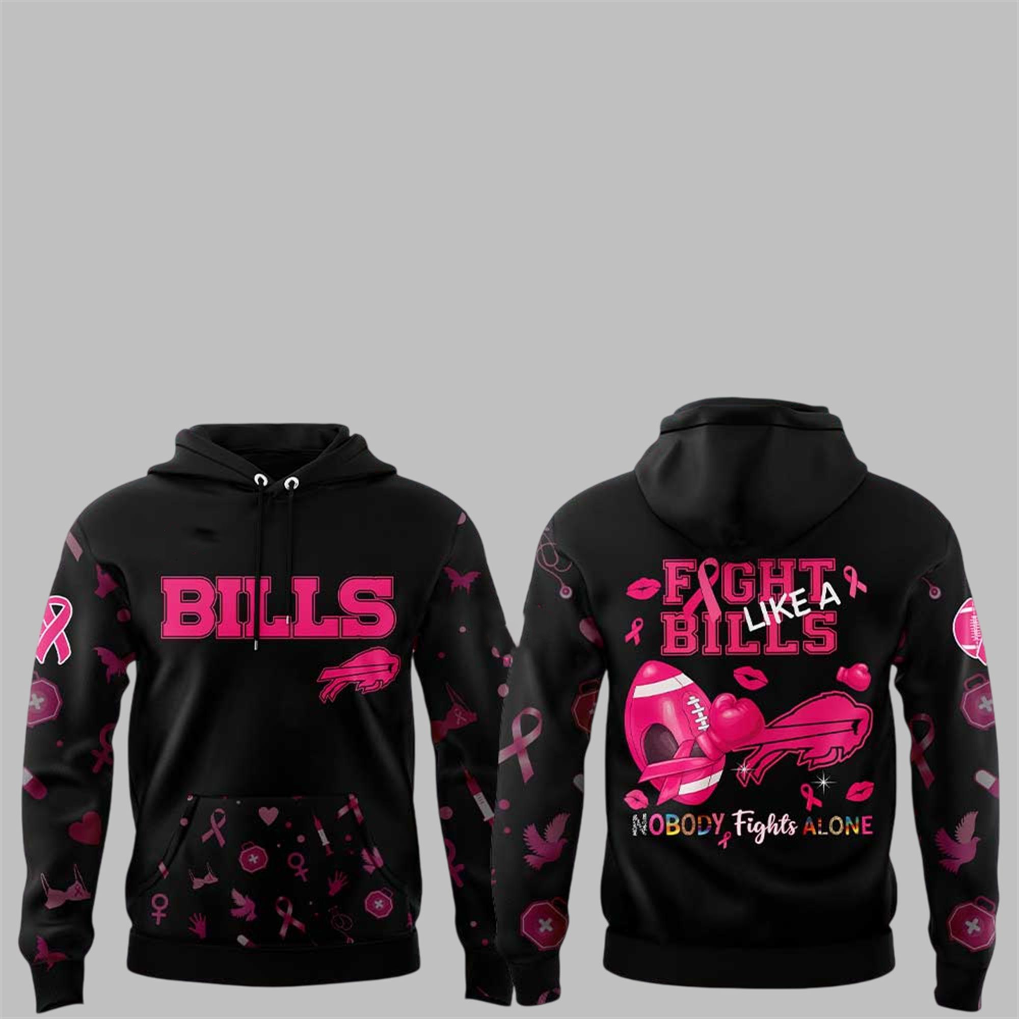 Stand shoulder-to-shoulder with fighters and survivors this season with Bills Nobody Fights Alone Breast Cancer 2025 Hoodie. Timed for Breast Cancer Awareness Month in October 2025, this hoodie is a bold and meaningful way for the Bills Mafia to show its support for a cause that affects millions. It flawlessly combines the iconic branding of your favorite team with the universally recognized symbols of the breast cancer awareness movement.