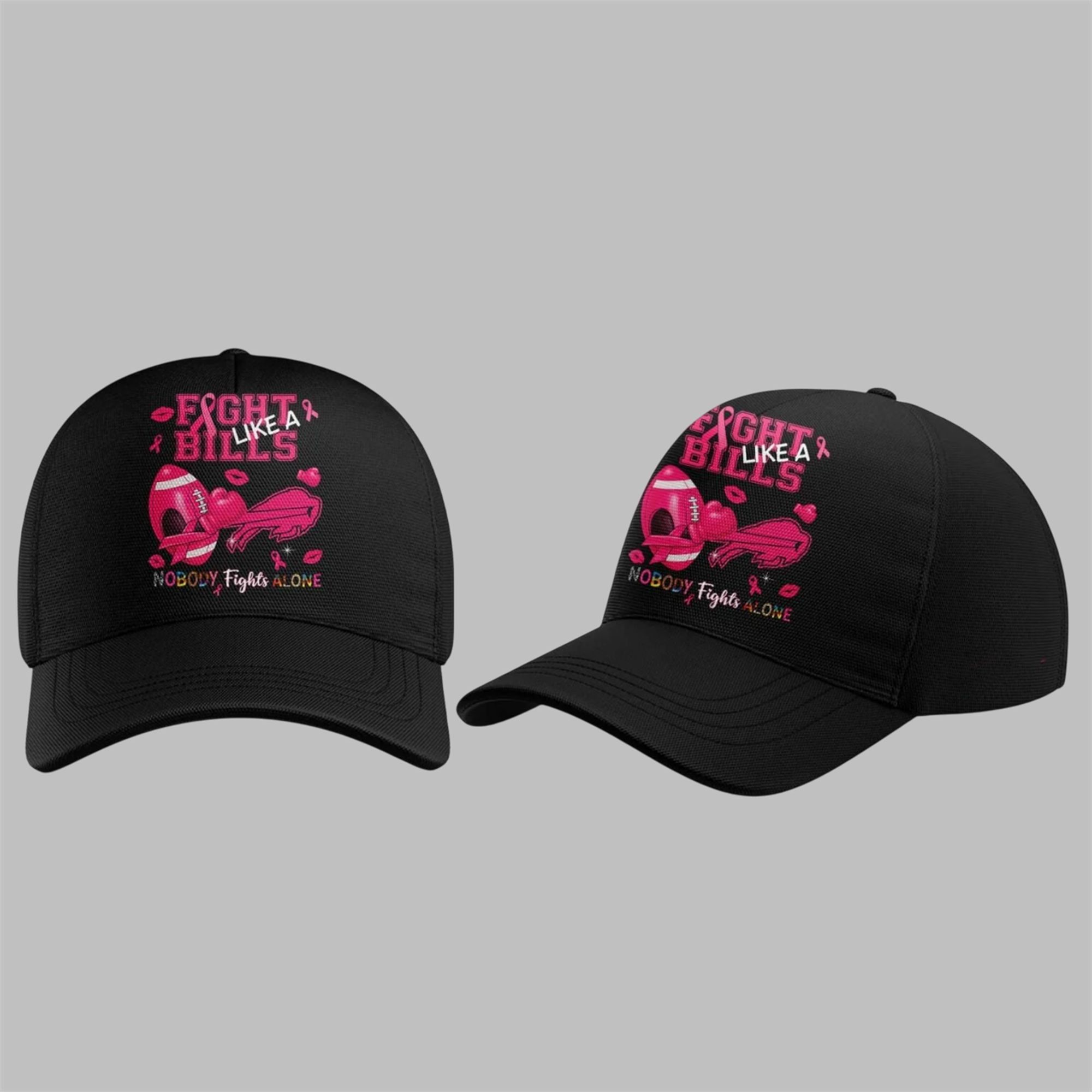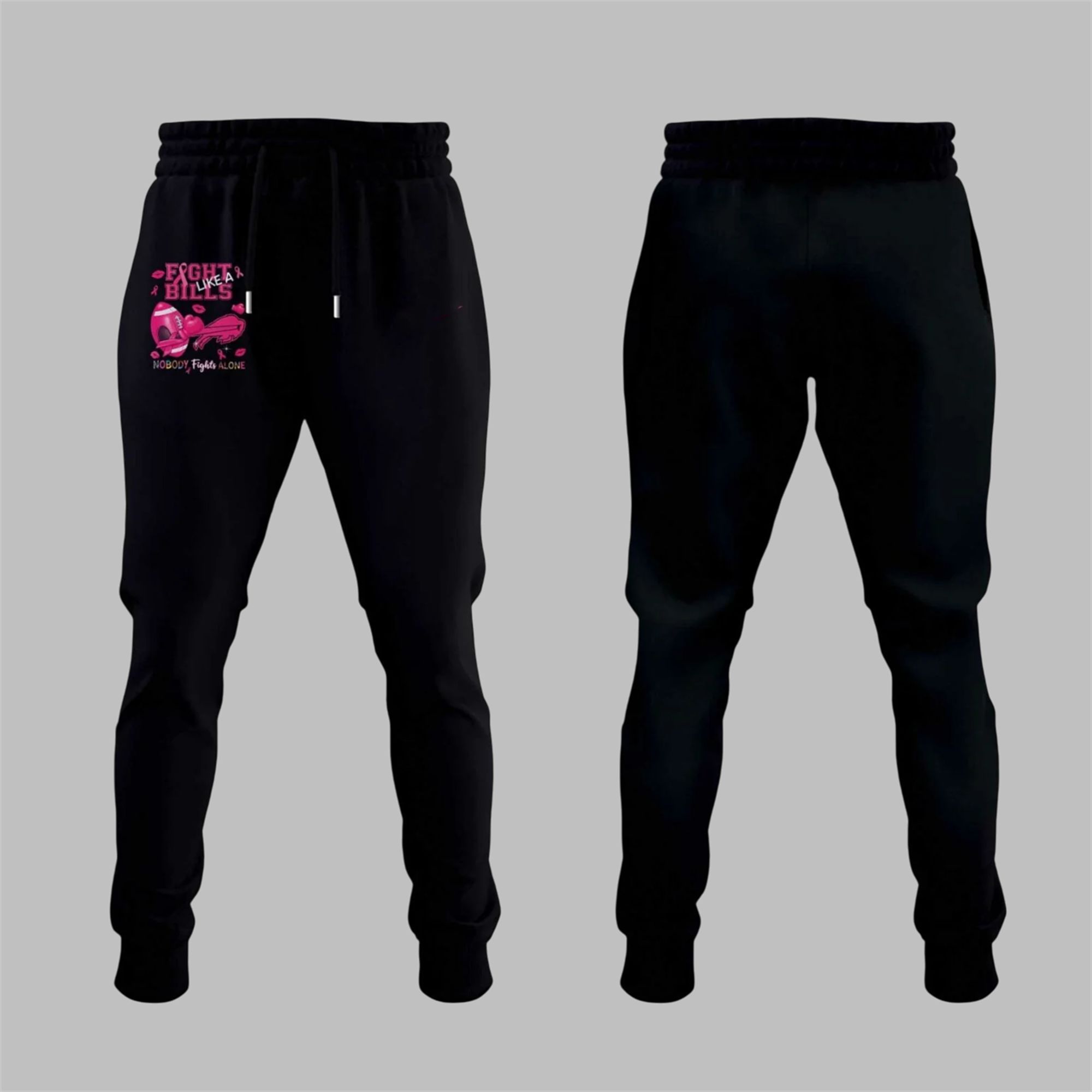 Engineered for both comfort and impact, this all-over print hoodie is a masterpiece of modern apparel design. The striking black base provides the perfect canvas for the vibrant pink graphics that symbolize hope and resilience. The front proudly displays the “BILLS” wordmark in bold pink, accompanied by the team’s charging buffalo logo. The back features the powerful “FIGHT LIKE A BILLS” and “NOBODY FIGHTS ALONE” slogans, intertwined with footballs, hearts, and awareness ribbons.lience.