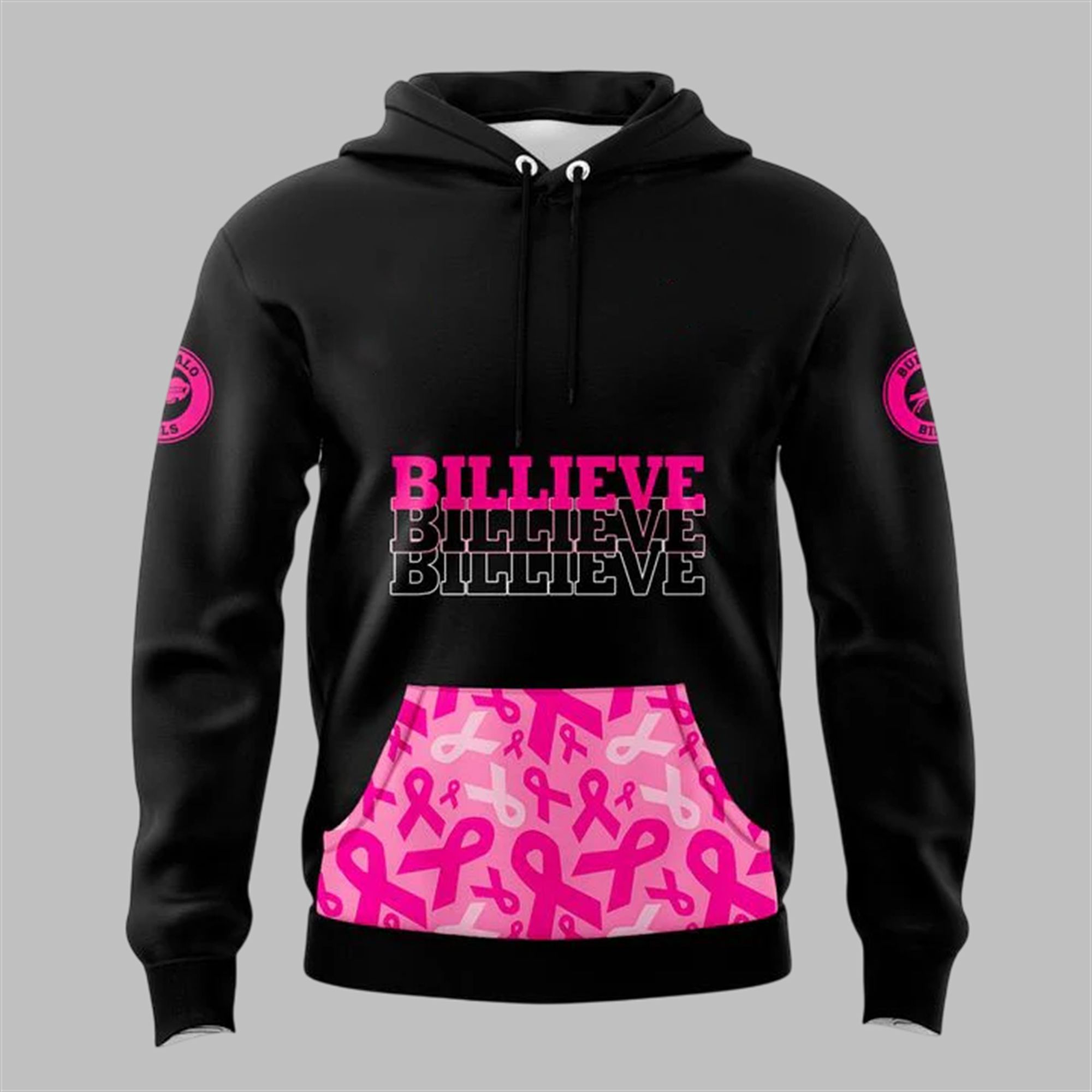 Every detail of this hoodie is infused with meaning. The front features the powerful word “BILLIEVE” repeated in a bold, stacked design, capturing the relentless optimism of the team and the enduring spirit of those in the fight. The spacious front kangaroo pocket is adorned with an all-over pattern of pink breast cancer awareness ribbons, creating a striking visual centerpiece. On the back, a large, vibrant pink Buffalo Bills logo takes center stage, ensuring your team allegiance is unmistakable from every angle. The sleeves are further accented with the iconic logo intertwined with the pink ribbon, completing a 360-degree design that is both stylish and significant.