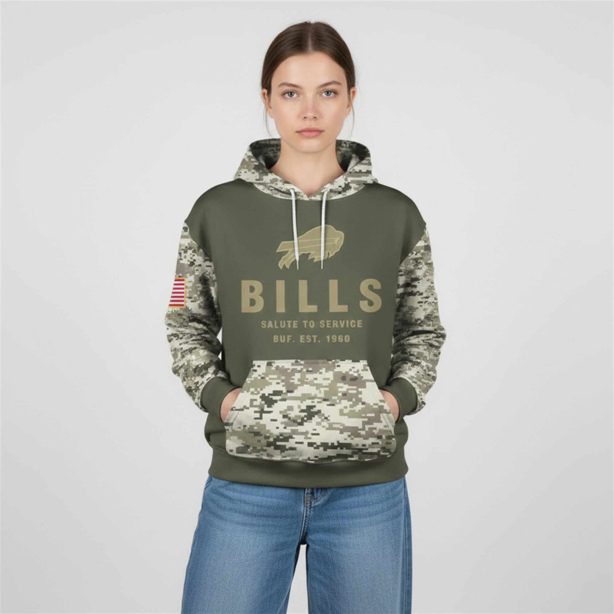This hoodie is more than just warm clothing; it is a tribute. The front of the hoodie proudly displays the iconic charging Buffalo logo in a tactical gold-beige tone, sitting above the “BILLS” wordmark and the “Salute To Service” insignia. The design pays homage to the franchise’s roots with “BUF. EST. 1960” detailed on both the front and back, reminding everyone of the team’s enduring legacy. The American flag patch on the sleeve adds the final touch of patriotism, making this a perfect garment for veterans, active-duty service members, and patriotic fans alike.