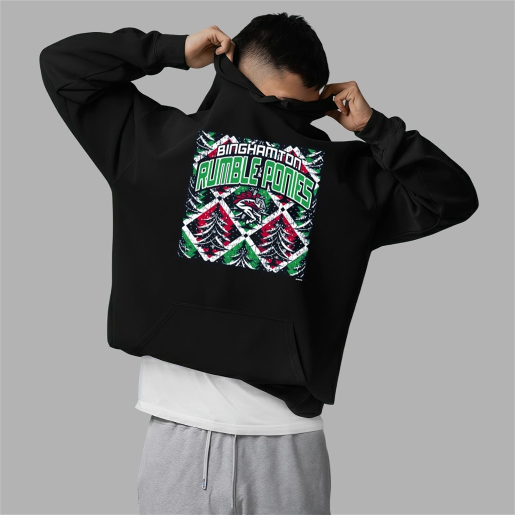 Instead of heavy knits, you get a premium, lightweight shirt featuring a high-quality faux-stitch graphic. The centerpiece is the fierce Rumble Ponies mascot—Rowdy, the carousel horse with an attitude—galloping through a winter wonderland of geometric pine trees, snowflakes, and diamond patterns. Dressed in the team’s signature red, green, and white holiday palette, this shirt is a conversation starter that honors Binghamton’s rich “Carousel Capital” heritage while celebrating the joy of the season.