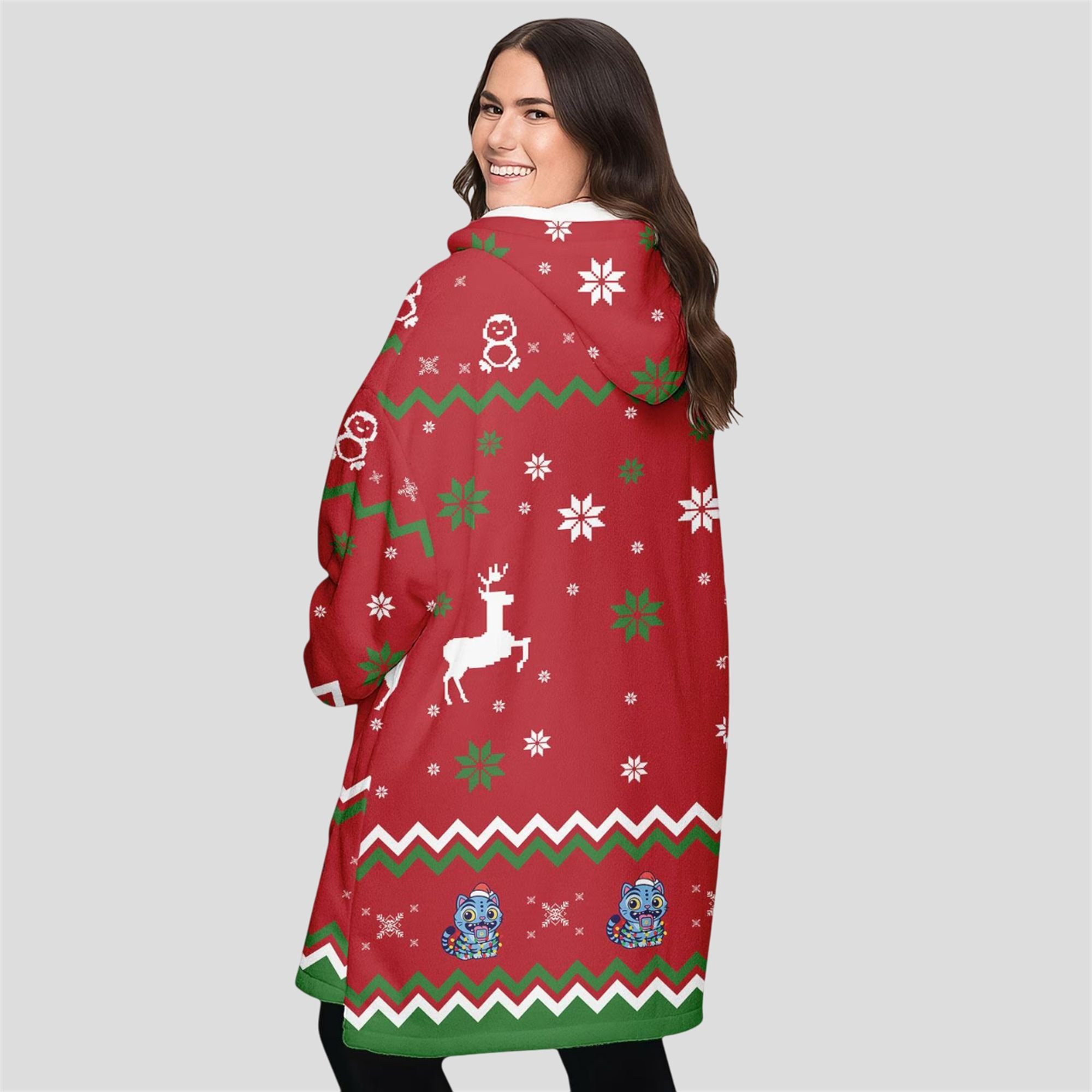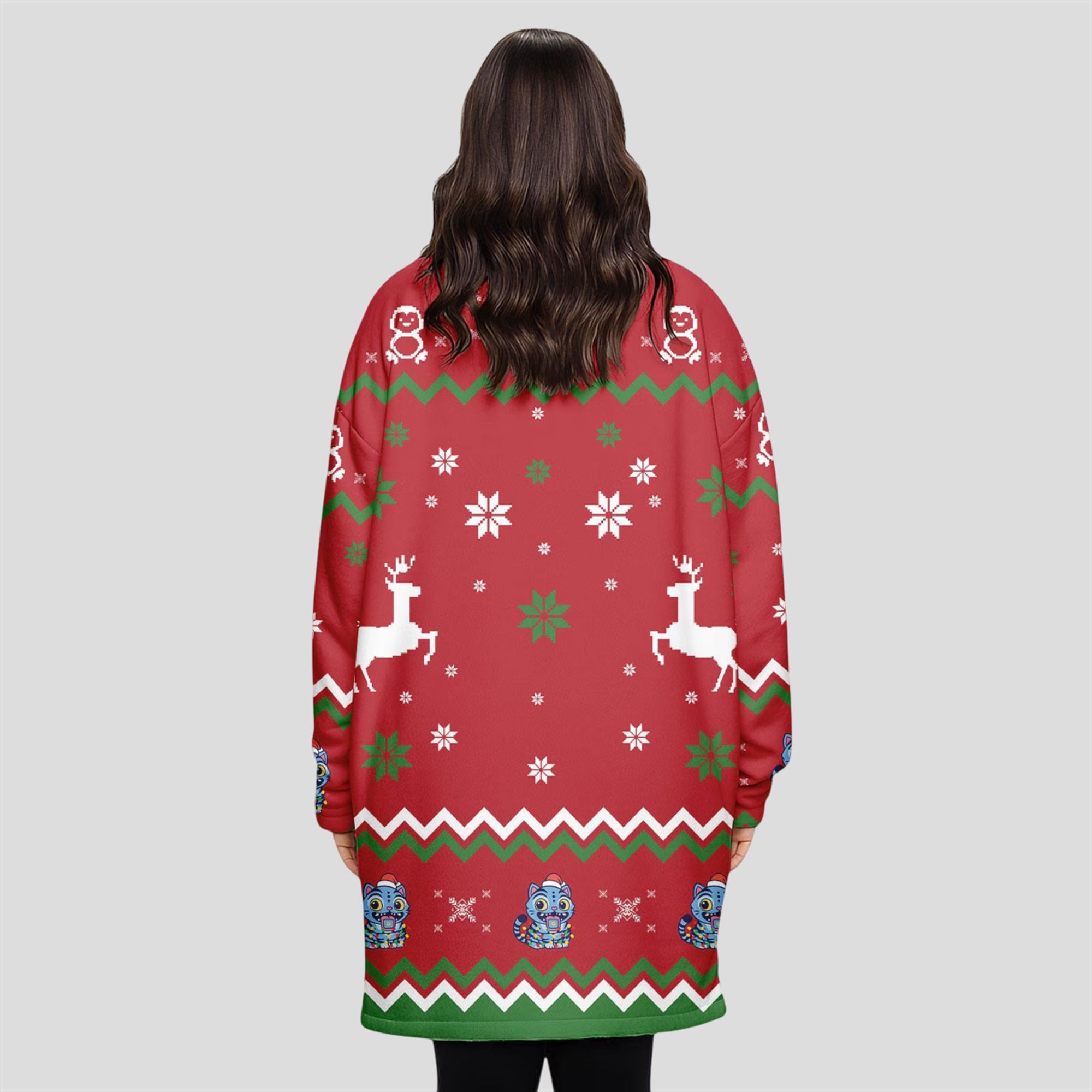 This hoodie blanket is a vibrant shade of holiday red, instantly setting a cheerful mood. The entire garment is adorned with a classic “ugly sweater” pattern, complete with pixel-style snowflakes, festive trees, and leaping reindeer. But the real star of the show is the adorable, mischievous blue creature front and center, wearing its very own Santa hat. This cute blue monster, reminiscent of a playful alien, adds a dash of unique personality, making this hoodie a standout piece at any holiday gathering or simply on your own couch.