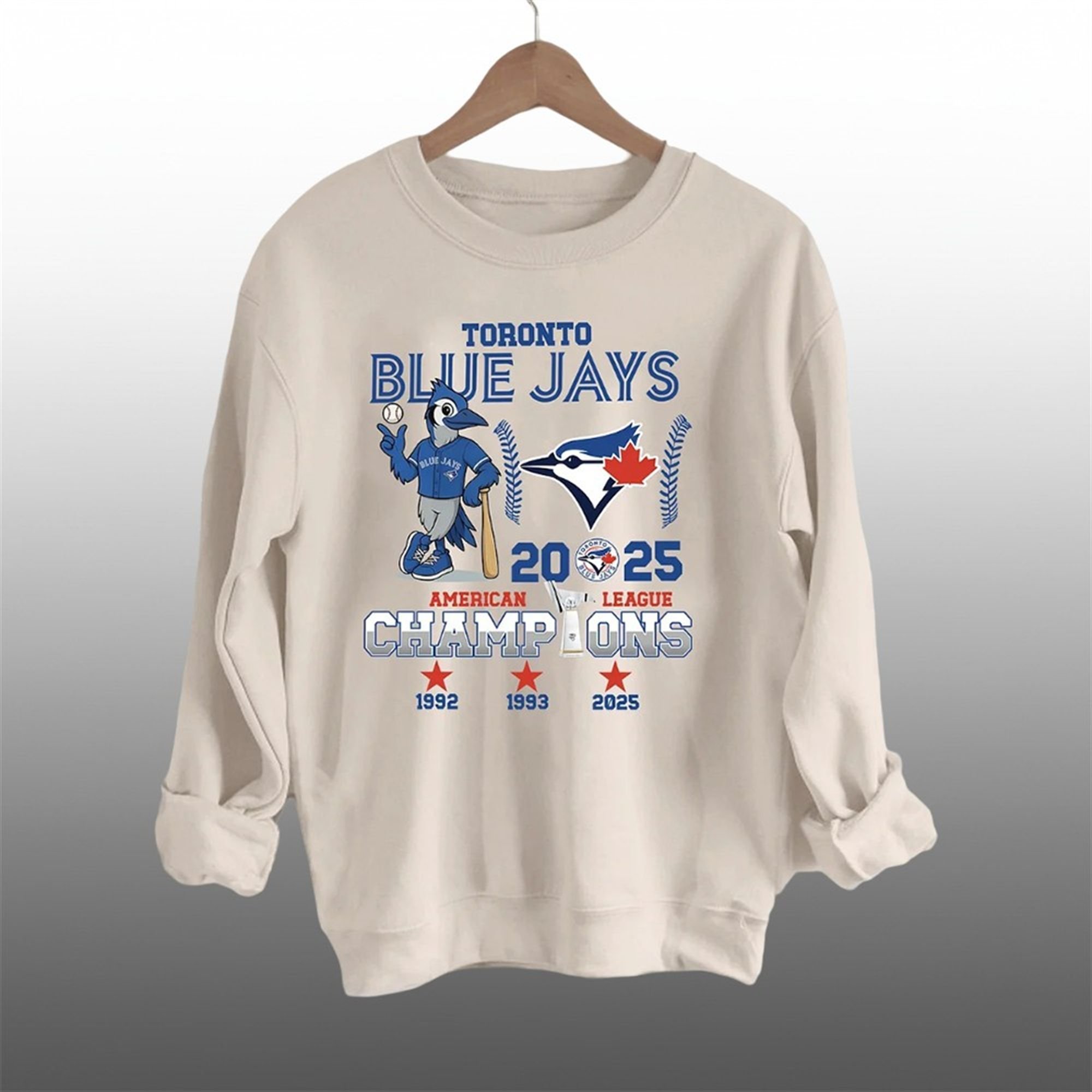 This is the sweatshirt you’ll wear to watch the deciding game of the World Series. It’s the one you’ll point to years from now and say, “I remember that season.” The design is a perfect blend of modern pride and retro history, featuring the classic Blue Jays mascot alongside the sleek current logo. Most importantly, it honors the new championship dynasty, the bold “AMERICAN LEAGUE CHAMPIONS” text, placing the 2025 victory star alongside the legendary ’92 and ’93 championships. It’s not just a sweatshirt; it’s a statement that the Blue Jays are back on top of the American League.