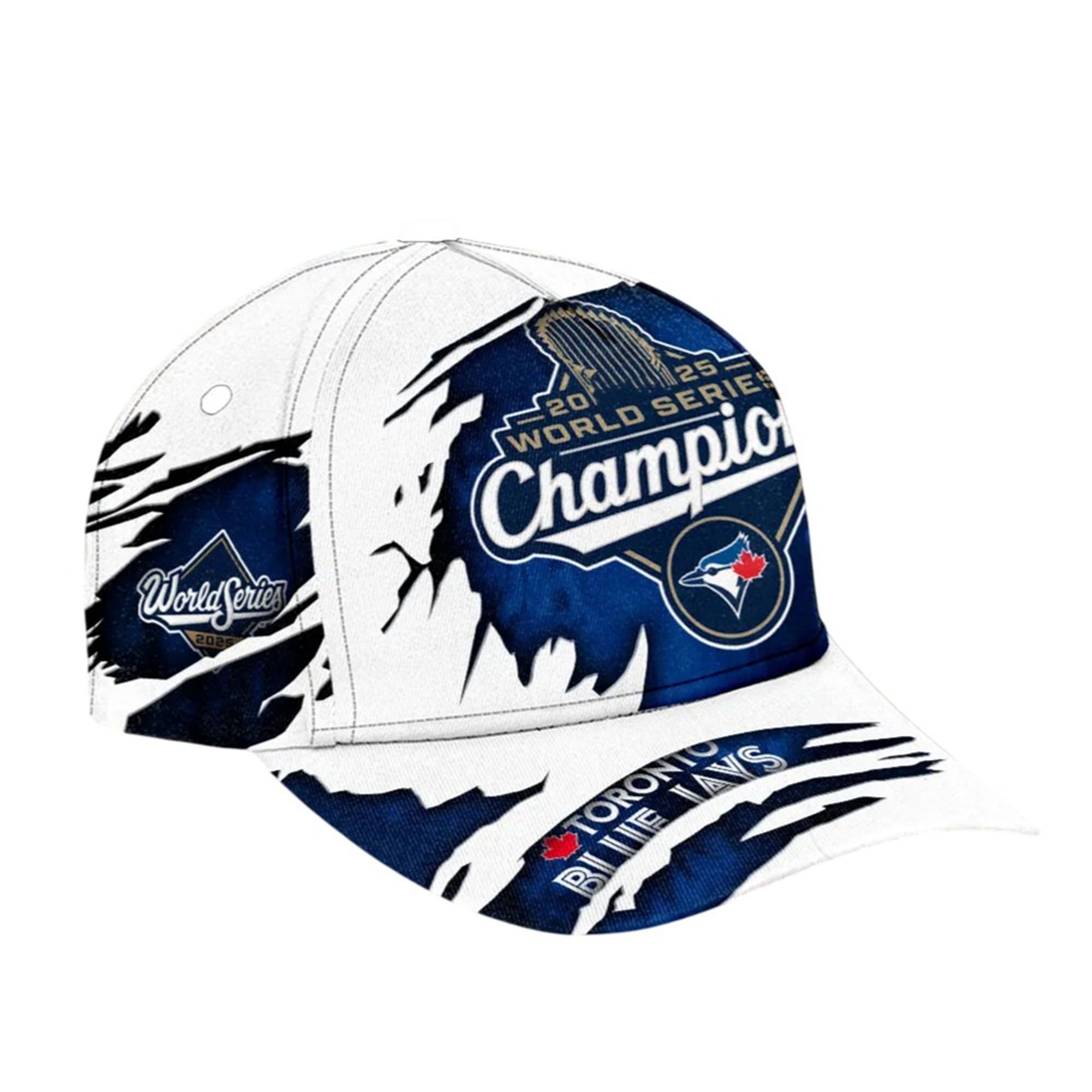 As the confetti settles, the ultimate badge of honor for every fan has arrived: the Toronto Blue Jays 2025 World Series Champions Cap. This isn’t just a standard team cap with a patch. This is a champion’s cap, designed with the energy and aggression that the Blue Jays showed on the field. The dynamic white and blue base features a stunning “ripped” or “clawed” graphic, symbolizing how this team tore through the postseason bracket.