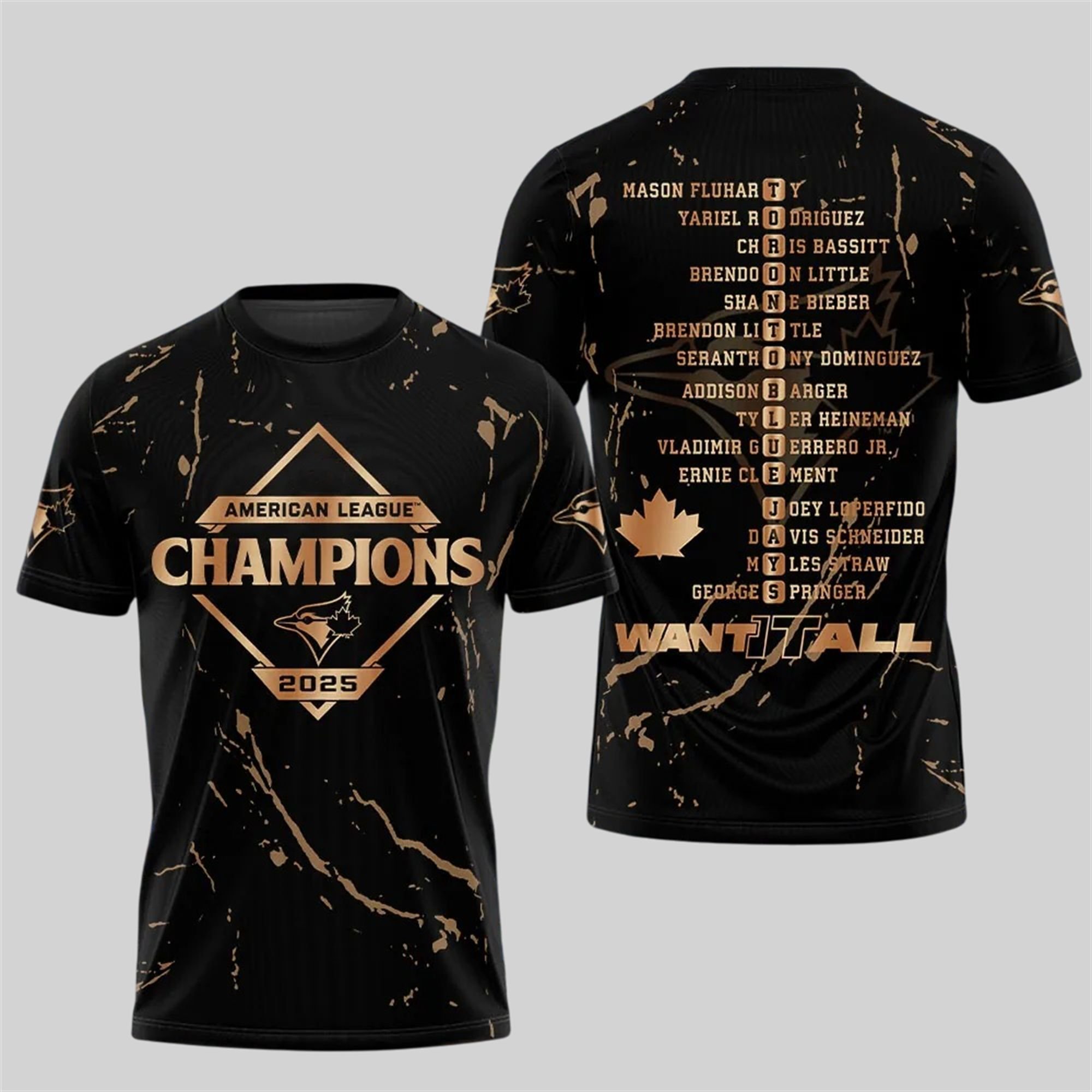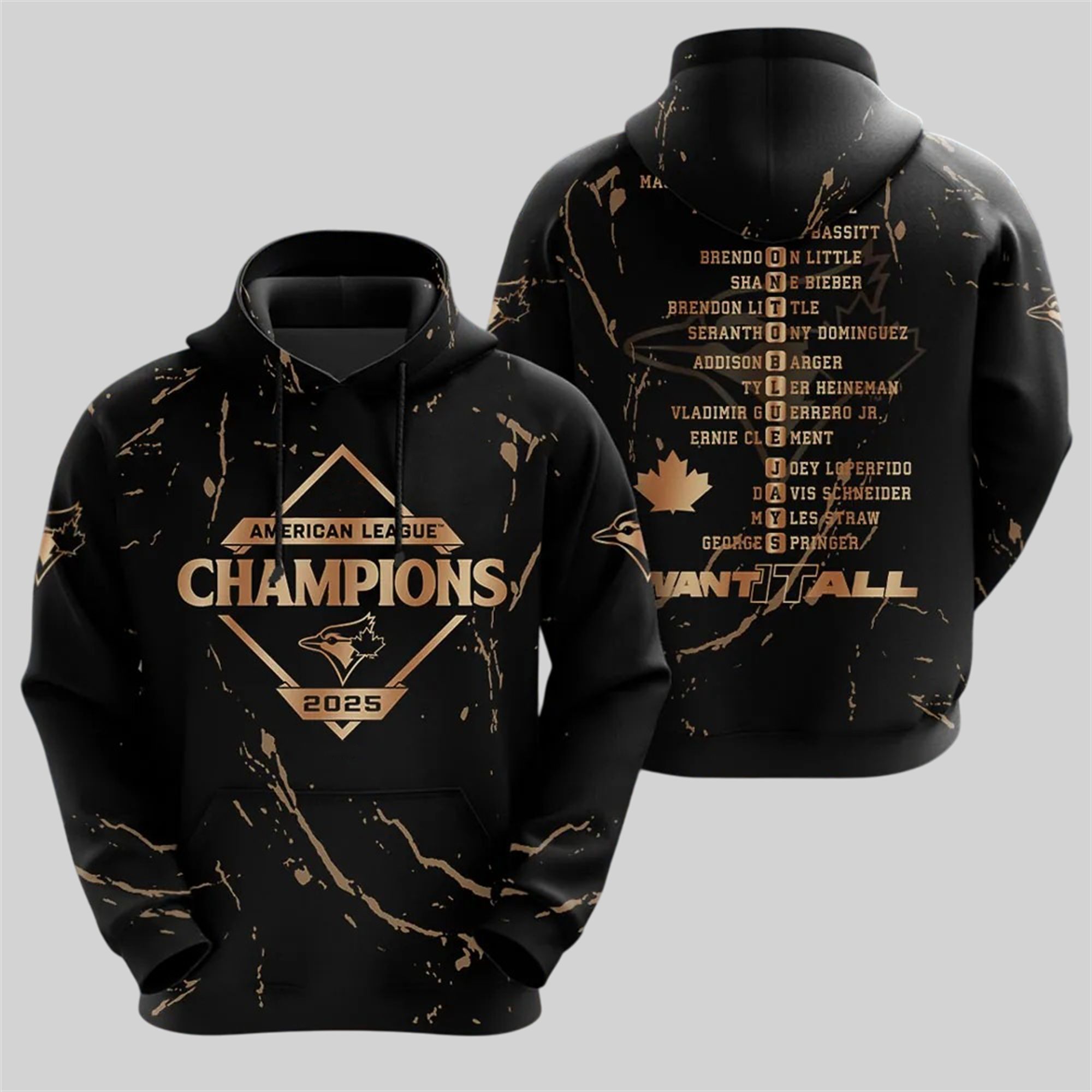 We present the Toronto Blue Jays American League Champions 2025 Shirt Hoodie. Crafted for the fans who rode every high and low, this shirt isn’t just merchandise; it’s a chronicle of a championship run. Its striking black and gold marble design signifies the prestige, grit, and glory of the champions. The bold, diamond-crested “AMERICAN LEAGUE CHAMPIONS 2025” insignia on the front leaves no doubt about who owns the AL. This is the new standard for fan gear.