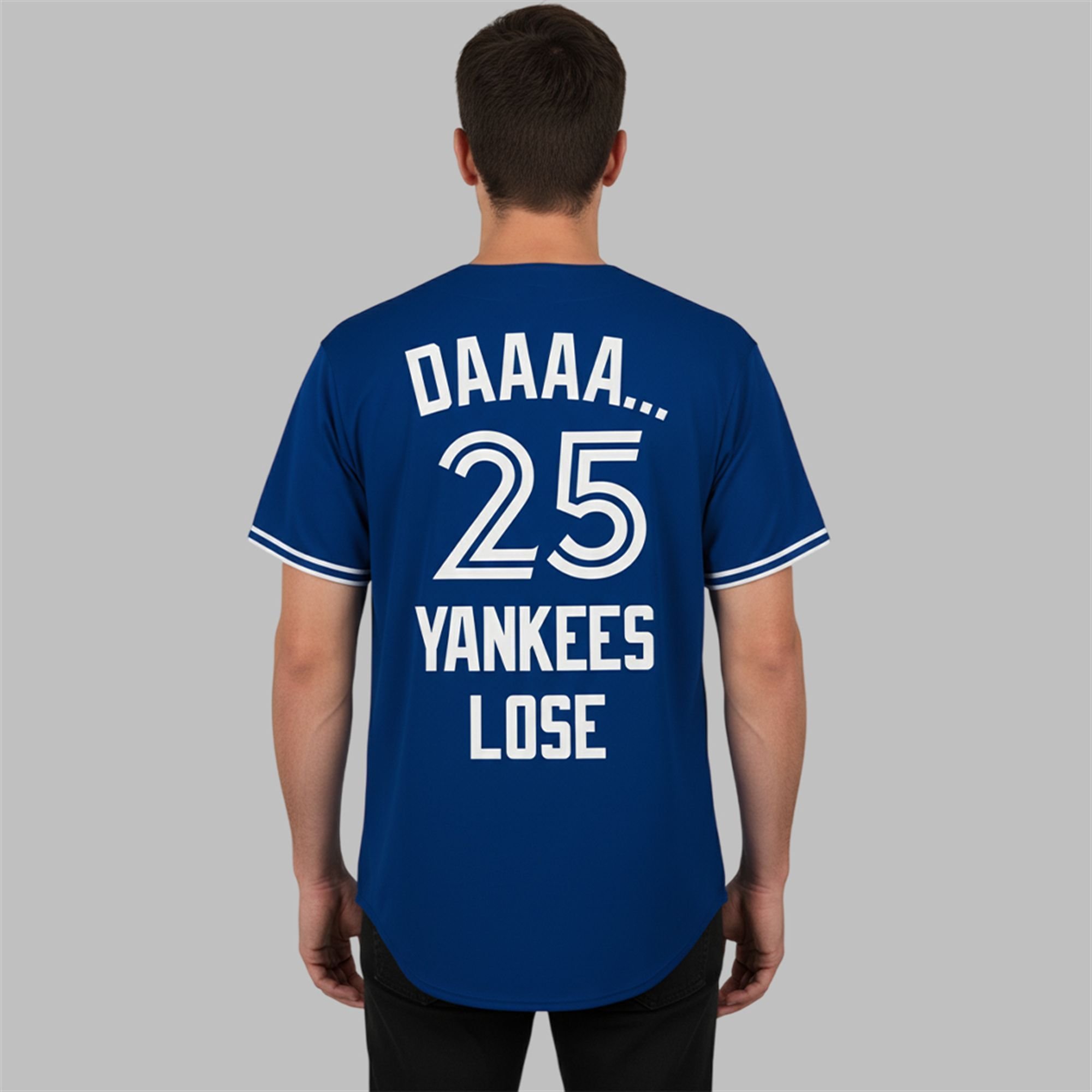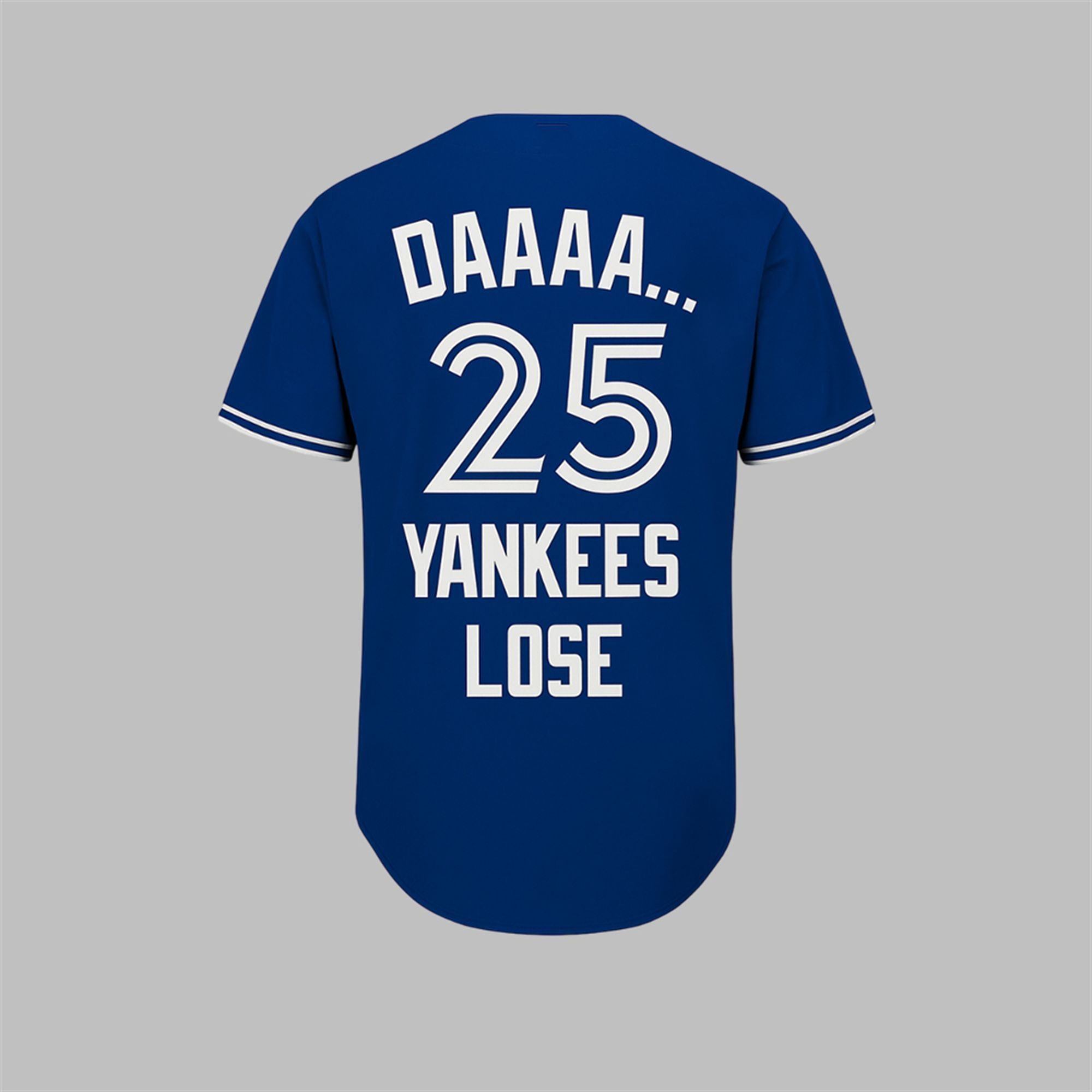 The jersey directly replicates the viral sensation, featuring the bold “DAAAA… 25 YANKEES LOSE” emblazoned across the back. The classic Blue Jays blue serves as the perfect backdrop, making the white lettering pop and ensuring your message is seen loud and clear from any seat in the stadium, sports bar, or even your living room. The number ’25’ adds an authentic touch, reminiscent of a player’s jersey, making your statement feel like an official part of the game.