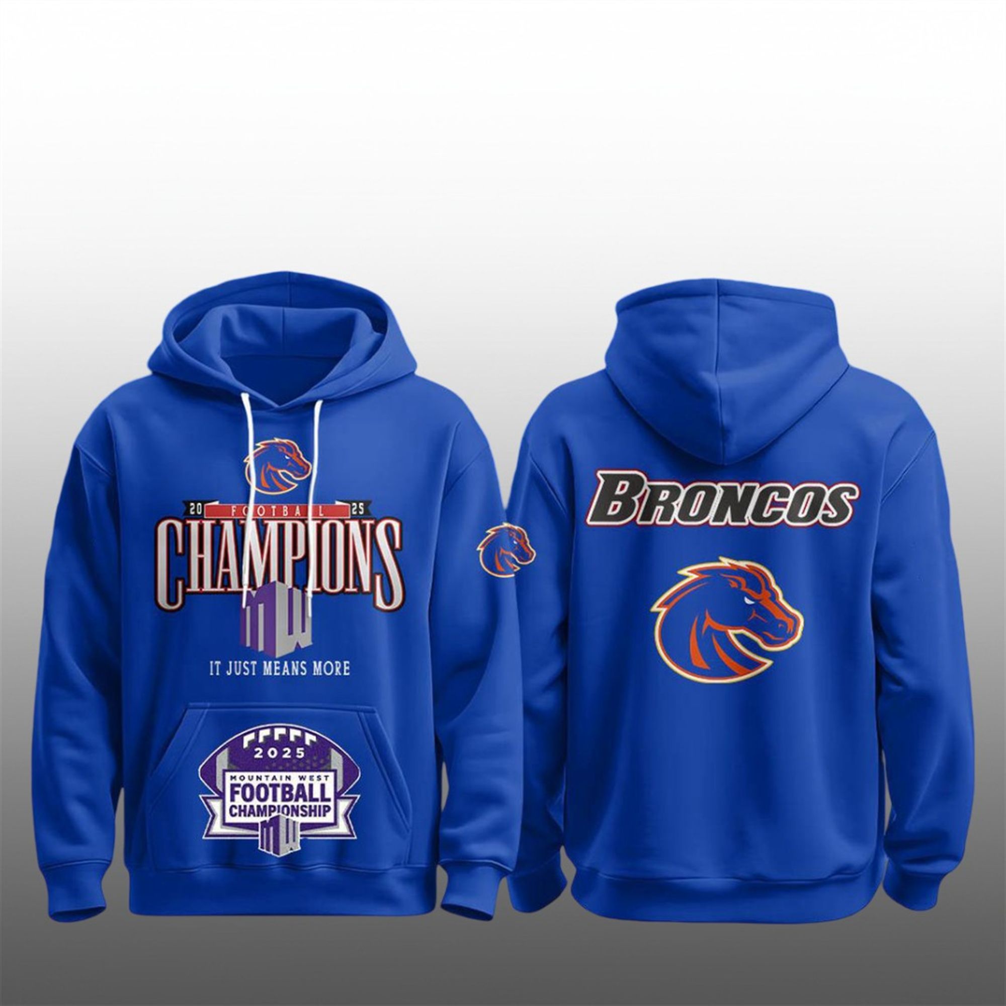 Capture the glory of a historic night at Albertsons Stadium with the 2025 Boise State Broncos Mountain West Champions Means More Shirt. After a dominant 38-21 victory over UNLV to secure a legendary “Three-Peat,” the Broncos have proven once again that the Blue Turf is hallowed ground.