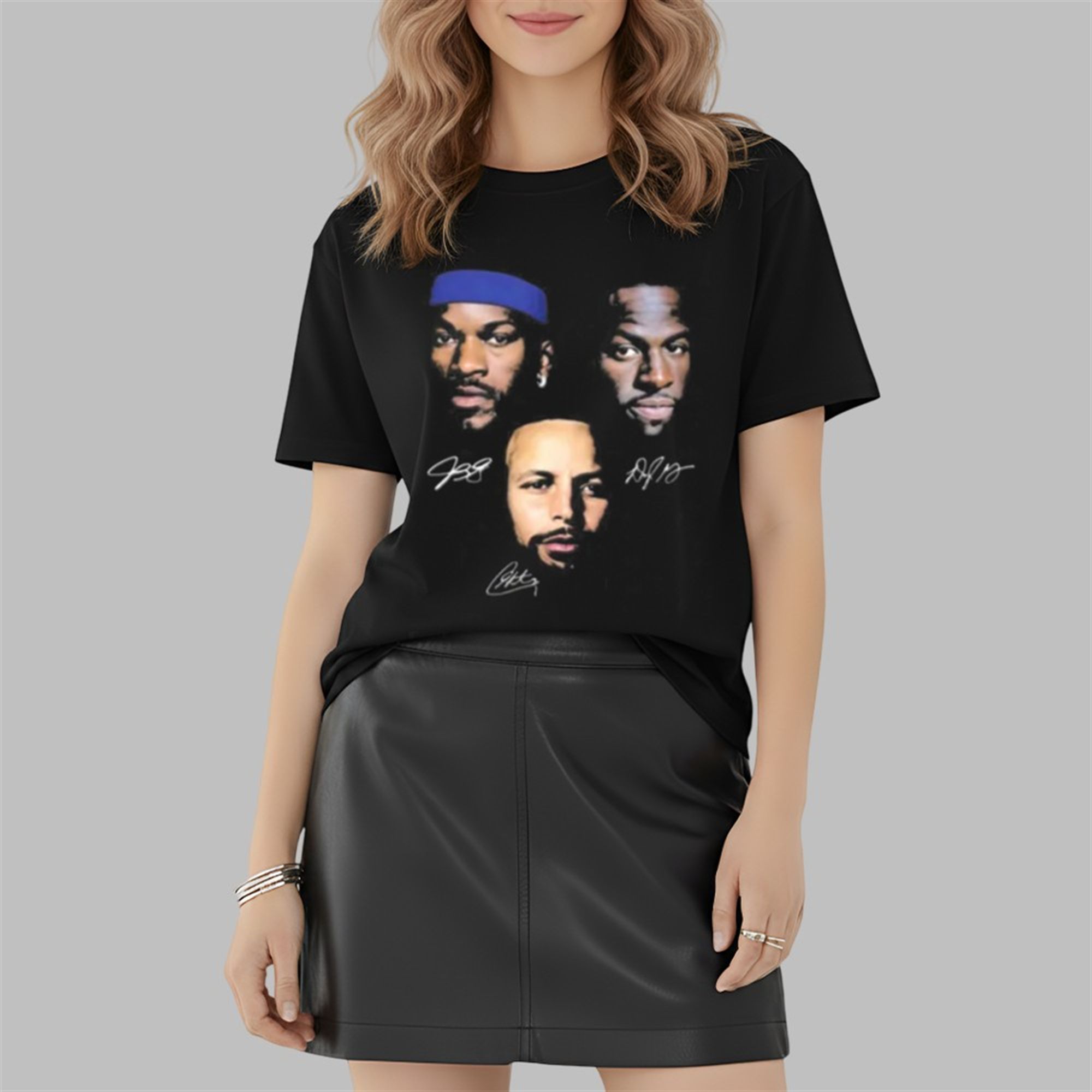 Celebrate the camaraderie of the Golden State locker room with Brandin Podziemski Jimmy Butler Draymond Green Steph Curry Signature Shirt. This “Bootleg” style rap tee pays homage to the lethal new “Big 3” lineup. By combining the legendary status of Curry and Green with the gritty intensity of Jimmy Butler, this design captures the unique chemistry of the 2025 roster.