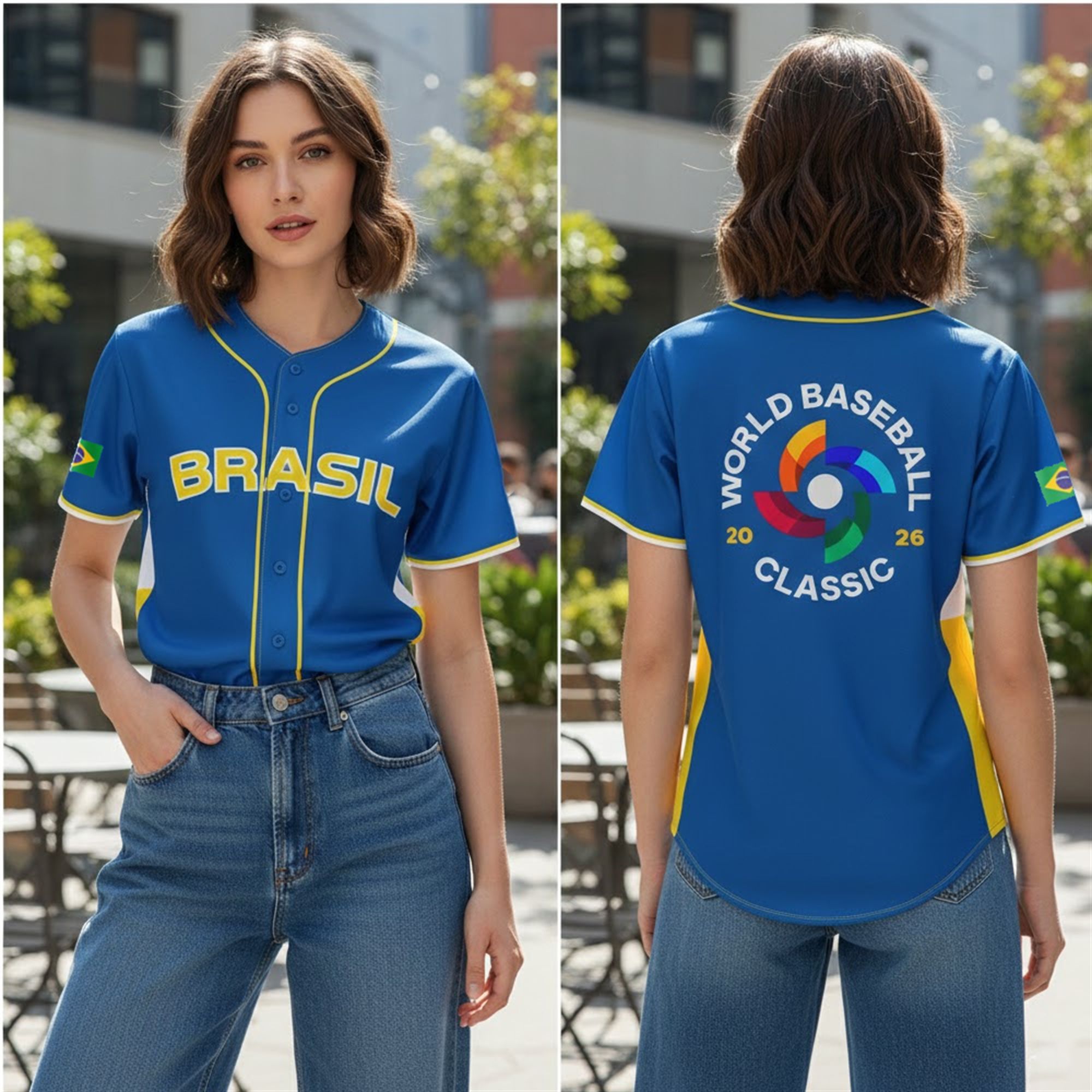 Every inch of the visual design pays homage to the country’s heritage. The electric yellow piping traces the neckline and button placket, framing the torso and evoking the dynamic lines of the Brazilian flag. On the sleeve, the flag itself is proudly displayed, ensuring that whether the player is pitching, batting, or fielding, the national identity is always front and center. The reverse of the jersey features the 2026 World Baseball Classic logo, anchoring the piece in this specific, historic moment in sports history. This is not just a replica; it is a piece of the tournament’s legacy, marking the year Brazil re-staked its claim on the diamond.