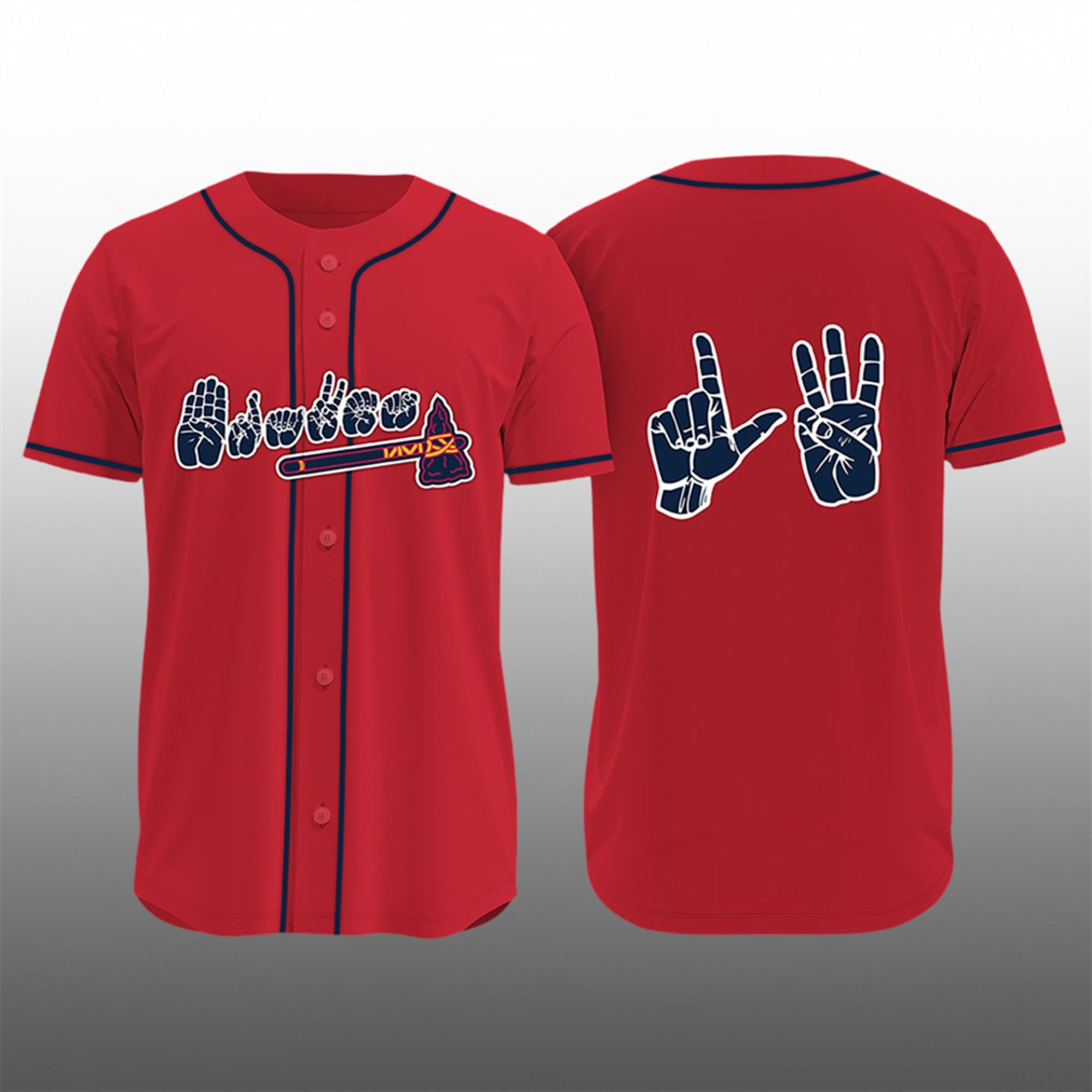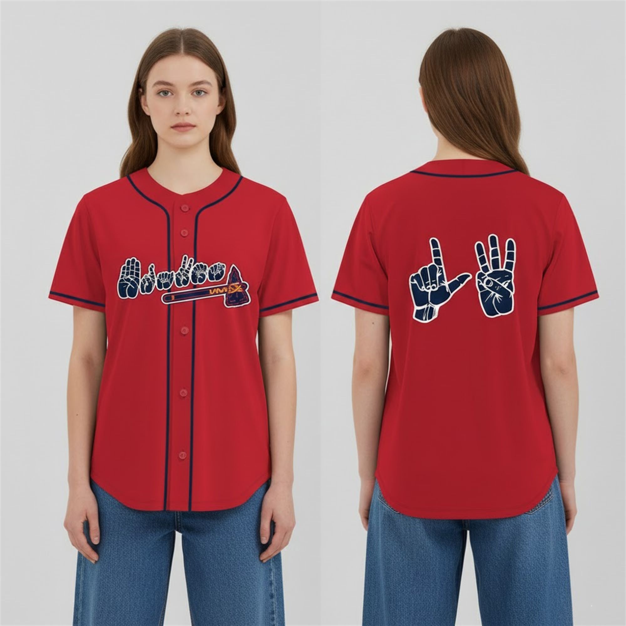 This vivid red jersey reimagines the classic Braves aesthetic through the lens of the Deaf community. The front of the jersey proudly displays “BRAVES” spelled out in the manual alphabet (American Sign Language), accompanied by the signature tomahawk logo, integrating team identity with accessible communication.