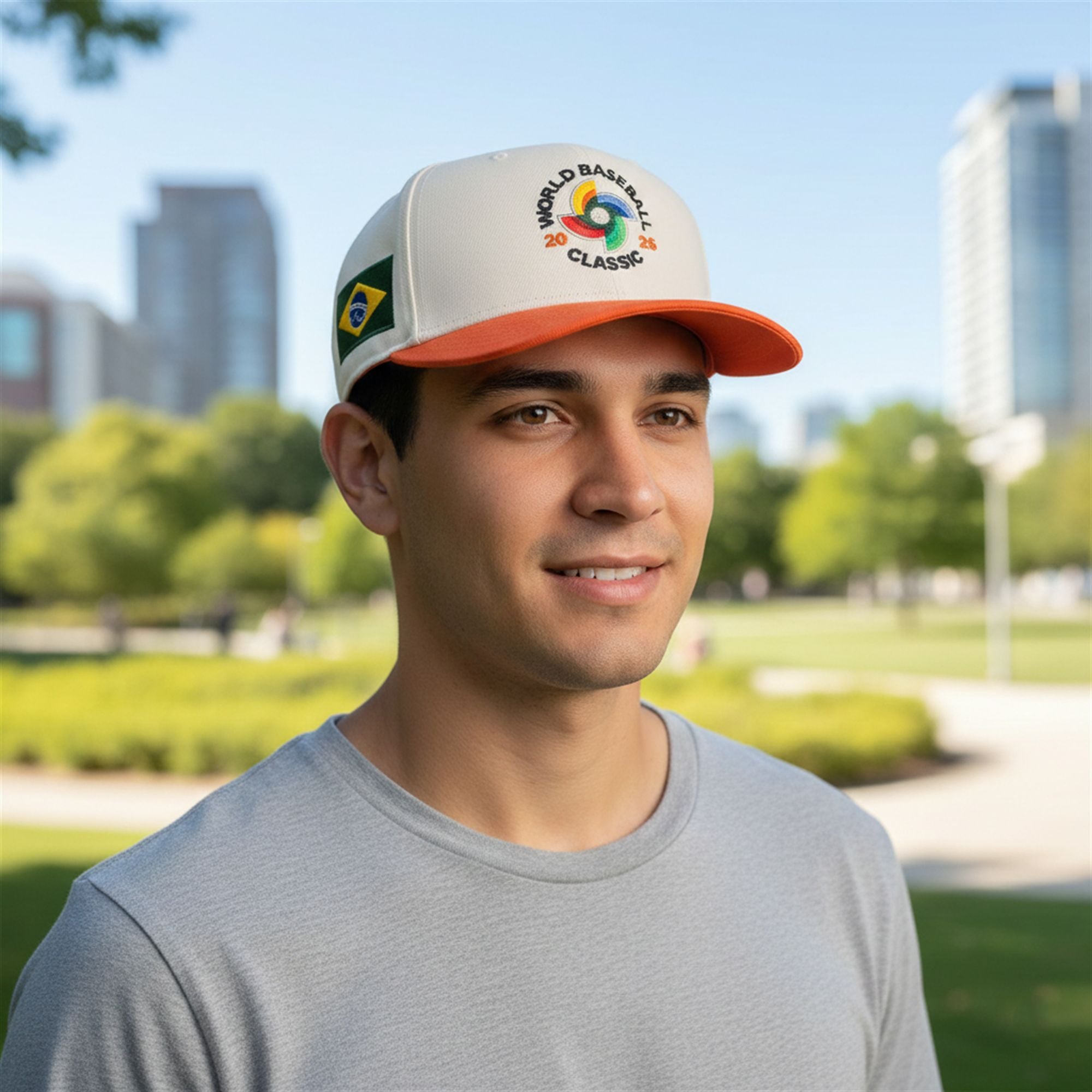 Front and center, the World Baseball Classic 2026 logo is with precision, featuring the iconic pinwheel design in global colors (blue, yellow, red, green) that signify the unity of the sport. The side panel proudly displays the Bandeira do Brasil (Brazilian Flag), adding an authentic touch of national pride. The cap is finished with a matching orange top button and breathable eyelets, ensuring it remains cool and comfortable during high-stakes innings or sunny outings.