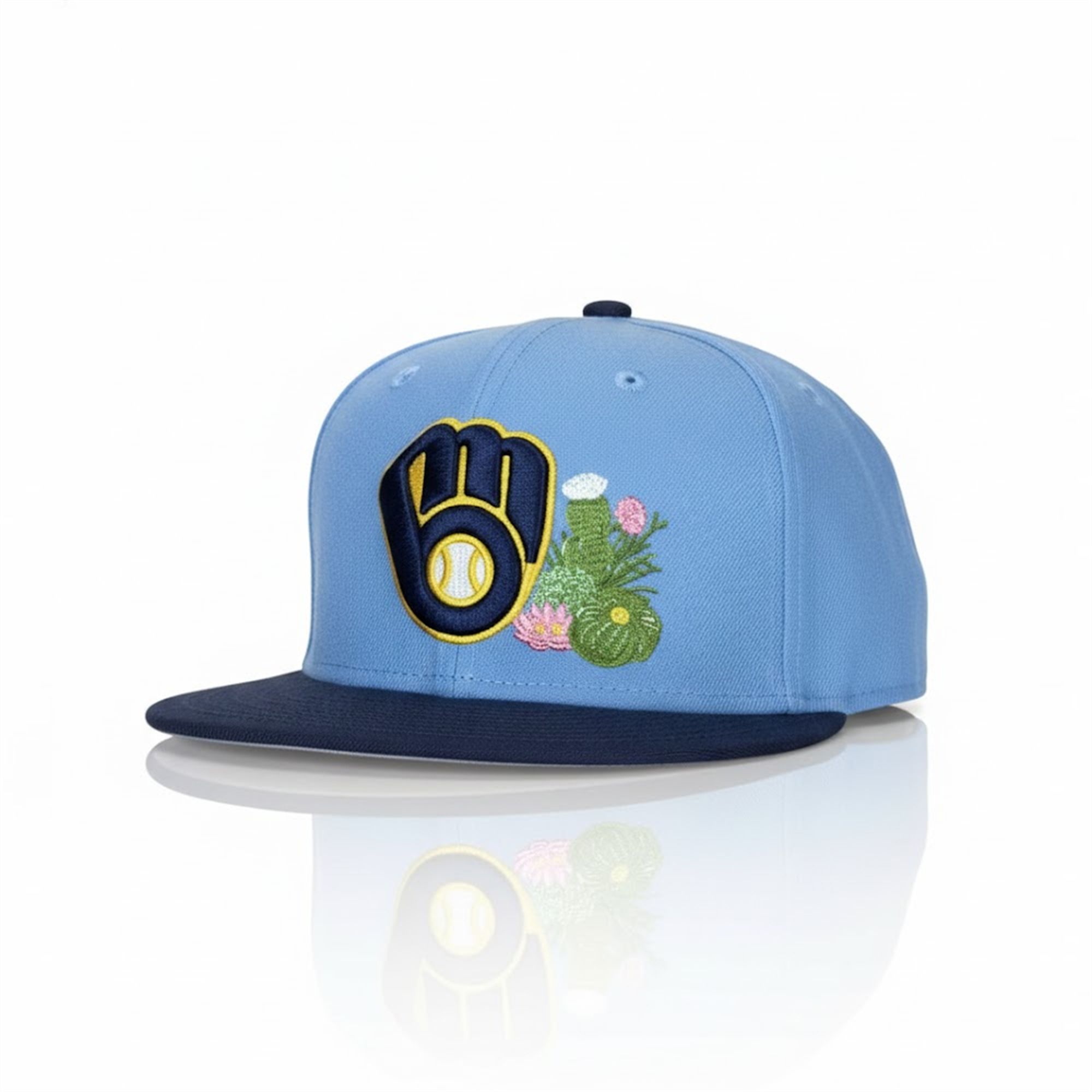 The front panel is the centerpiece, showcasing the beloved “Ball-in-Glove” Milwaukee Brewers logo—a timeless fan favorite. However, for the 2026 season, this classic emblem is reimagined with a localized touch. Directly next to the gold and navy lettering is a detailed cluster of saguaro cacti and blooming desert flowers. This artistic addition adds a pop of pink and green, softening the athletic aesthetic with a botanical flair that represents the Phoenix area where Spring Training takes place.