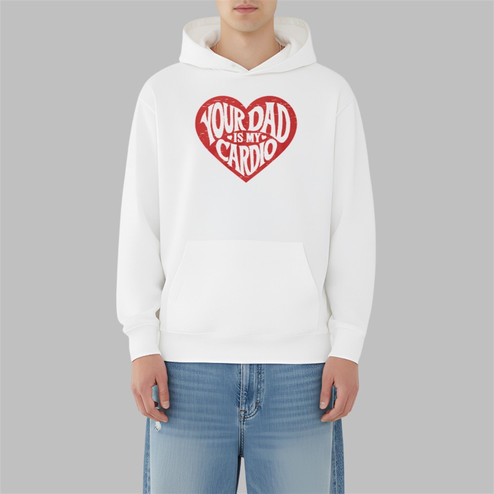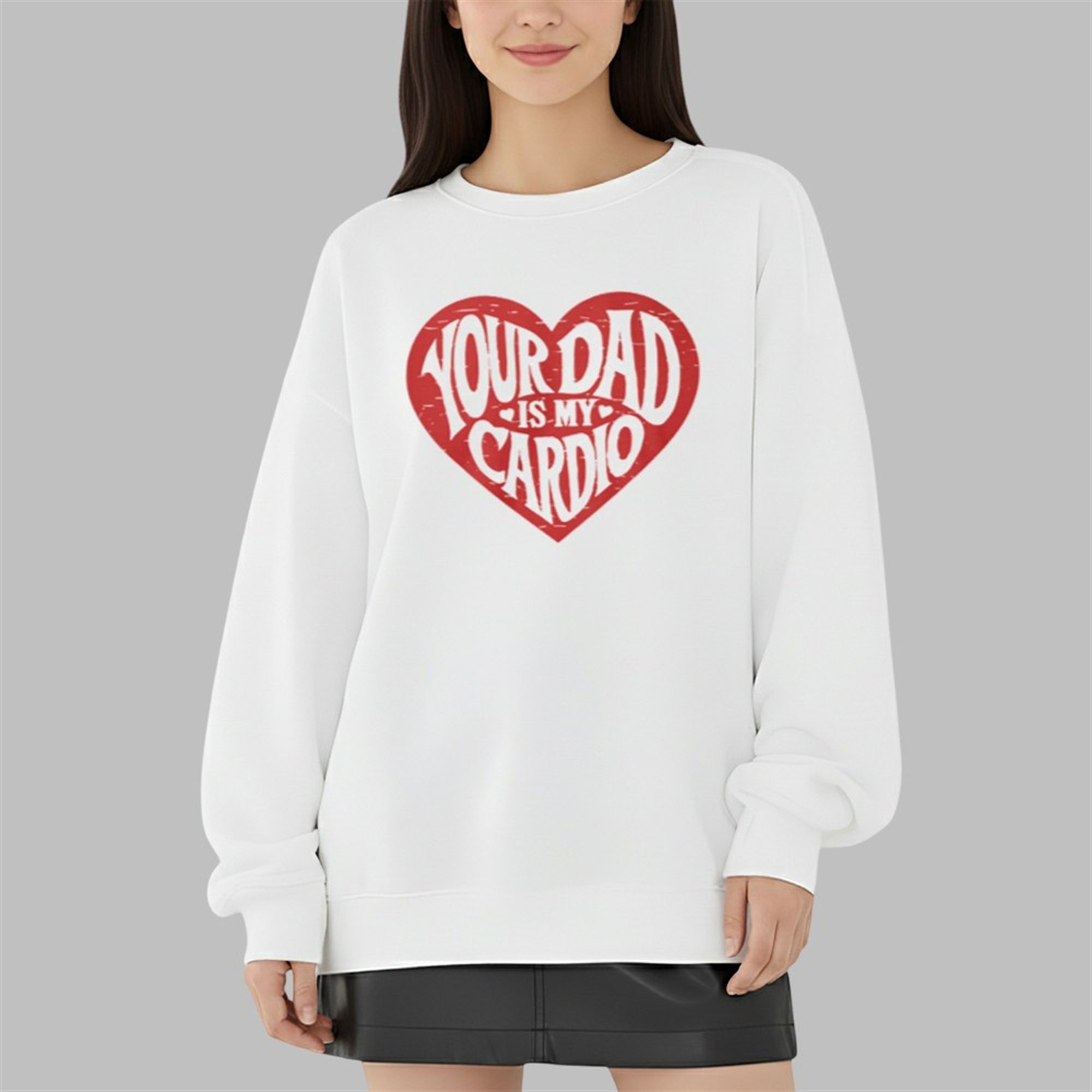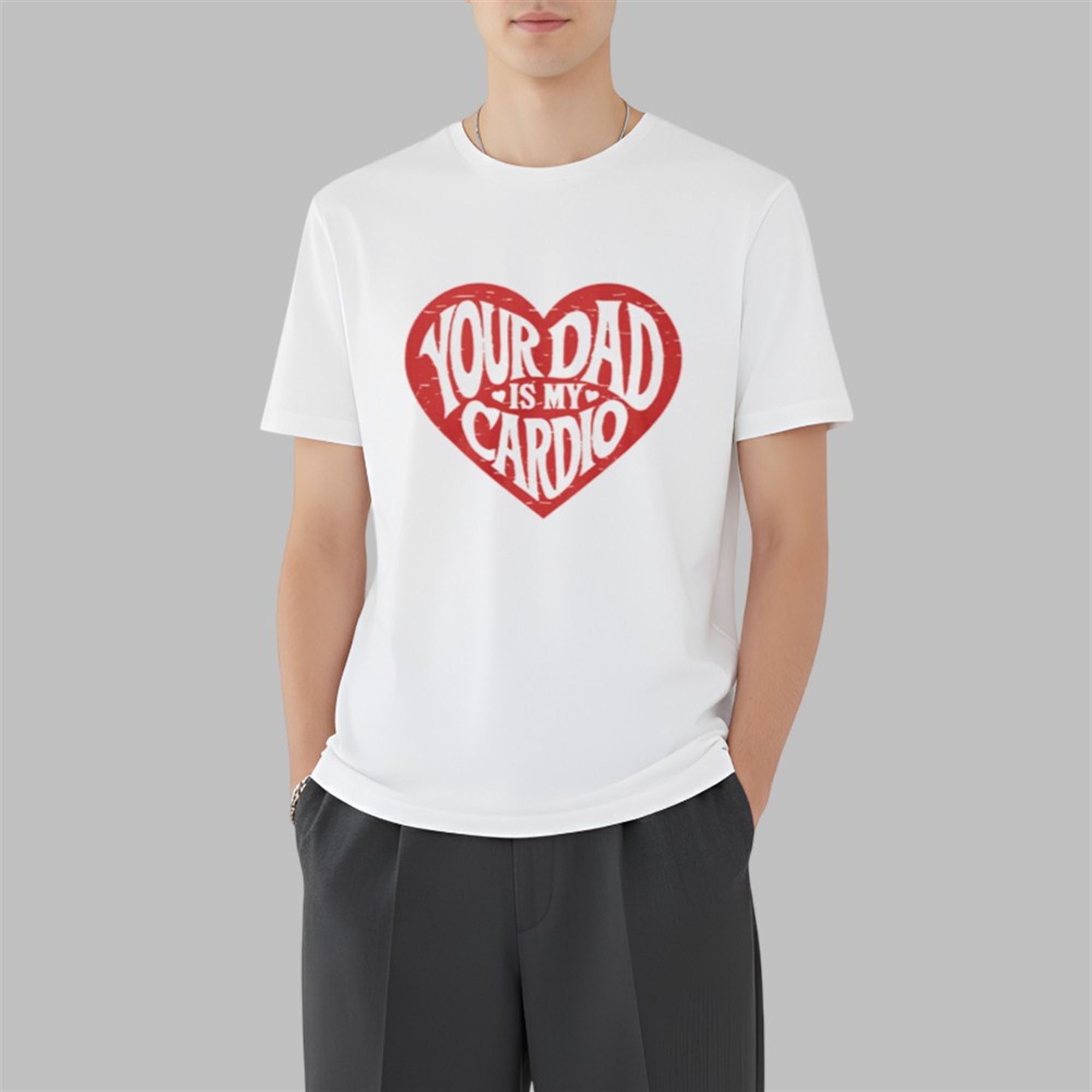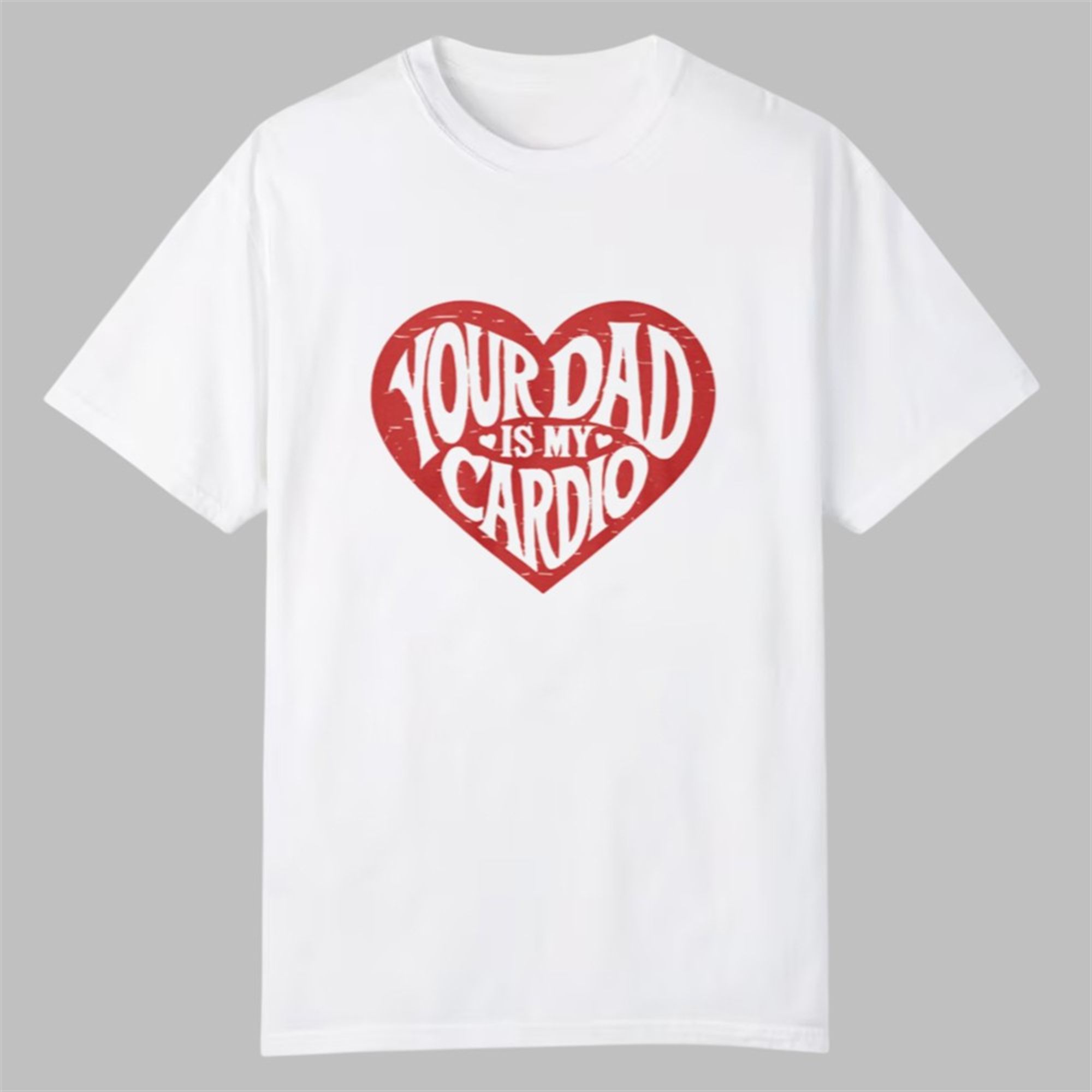Crafted on a clean, classic white tee, the design features a bold, vintage-style red heart. But look closer—this isn’t your standard symbol of love. The text “YOUR DAD IS MY CARDIO” is cleverly integrated into the heart’s shape, creating a design that’s both aesthetically pleasing and laugh-out-loud funny. It’s the perfect blend of retro charm and modern, “IYKYK” (if you know, you know) internet wit.