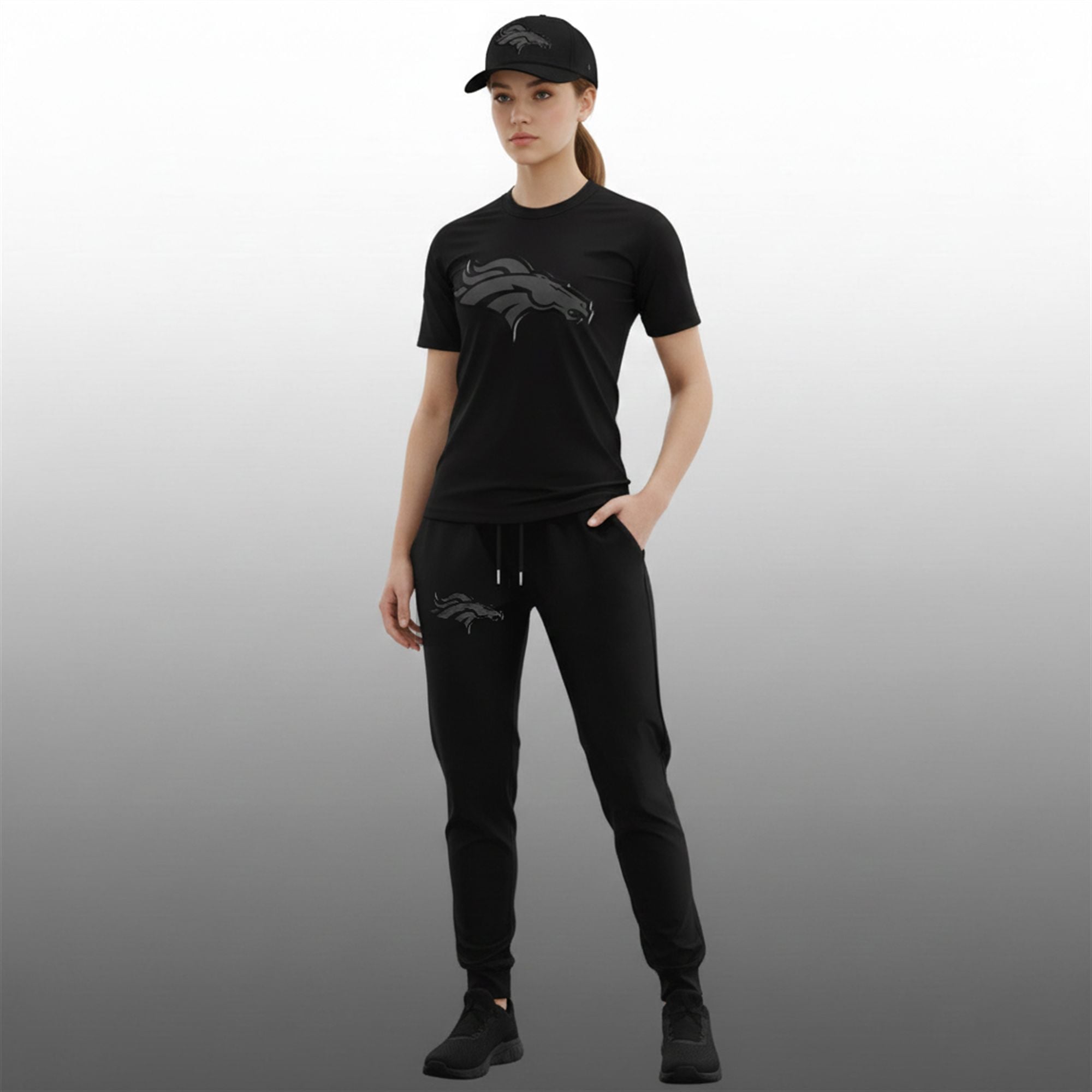 This shirt features a stunning double-sided design. The front showcases the iconic Broncos horse head logo in a stealthy, gunmetal grey finish that pops against the deep black fabric. On the back, the design expands to feature the full “DENVER BRONCOS FOOTBALL” wordmark, arched proudly over a larger rendition of the logo. The monochromatic palette creates a “ghosted” or “shadow” effect that is subtle yet undeniably aggressive.