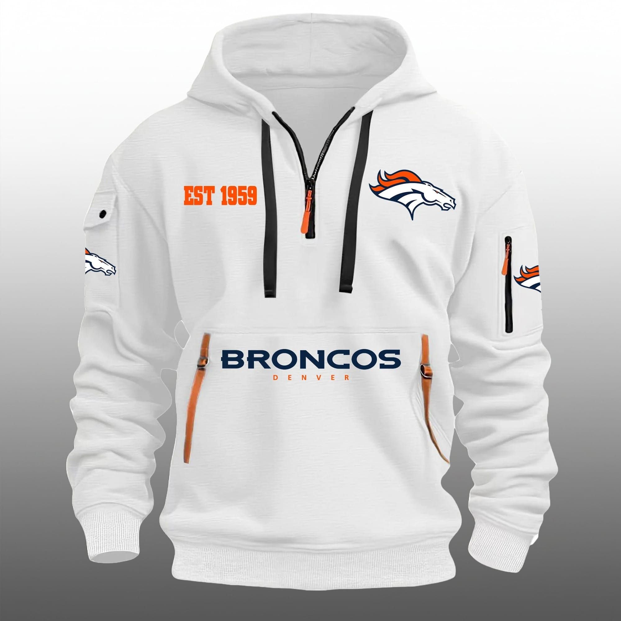 The front of the hoodie proudly displays the “BRONCOS DENVER” wordmark across the central pocket area, anchoring the design in team identity. The chest features the iconic Broncos horse head logo, while the shoulder area is marked with “EST 1959,” paying homage to the franchise’s inaugural year. Uniquely, this garment includes functional utility pockets on the sleeves, complete with zipper detailing and patch-style logo placements. The quarter-zip neckline allows for adjustable styling, while the drawstrings add a customizable fit to the hood.