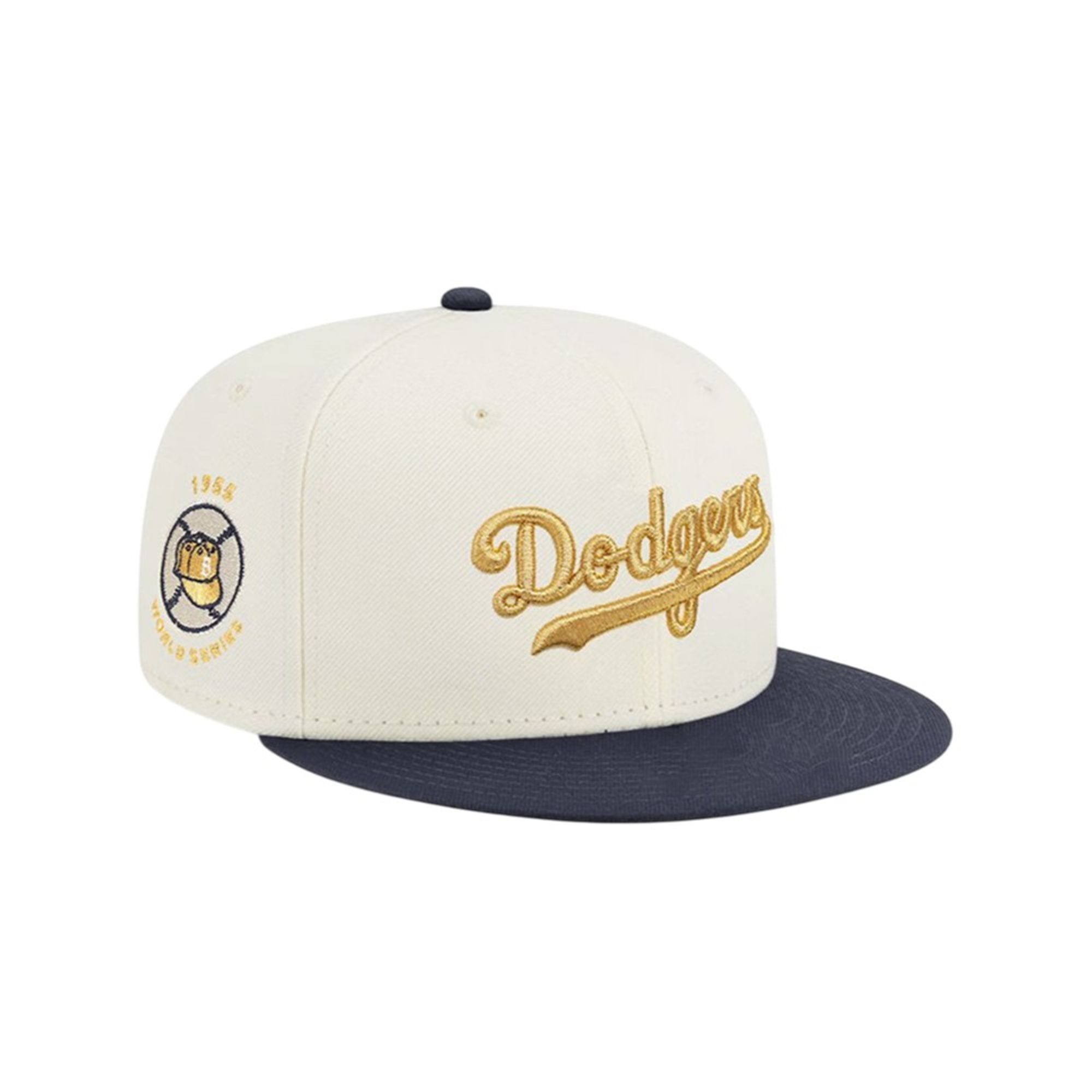 But the true centerpiece is the iconic “Dodgers” script, rendered in a magnificent, high-sheen gold embroidery. This isn’t the standard red or blue; the gold script elevates the entire design, giving it a commemorative, championship feel that catches the light and draws the eye. On the side, the beautifully detailed 1955 World Series patch sits as a badge of honor, a constant reminder of the team that featured legends like Jackie Robinson, Duke Snider, Roy Campanella, and a young Sandy Koufax.