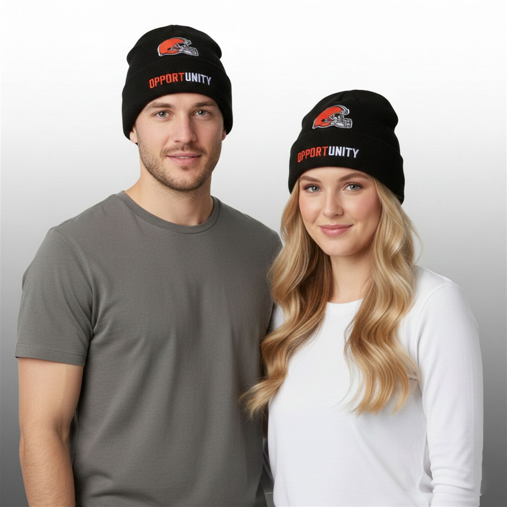 The beanie is not merely a winter accessory; it is a graphical representation of the team’s philosophy entering the new year. The design utilizes a stark, blackout aesthetic that allows the vibrant orange and white to pop, ensuring immediate visual recognition. At the center of the cuff lies the pristine Browns helmet logo, untouched and classic. Below it, the text “OPPORTUNITY” is with a deliberate color split—”OPPORT” in signature orange and “UNITY” in bright white.