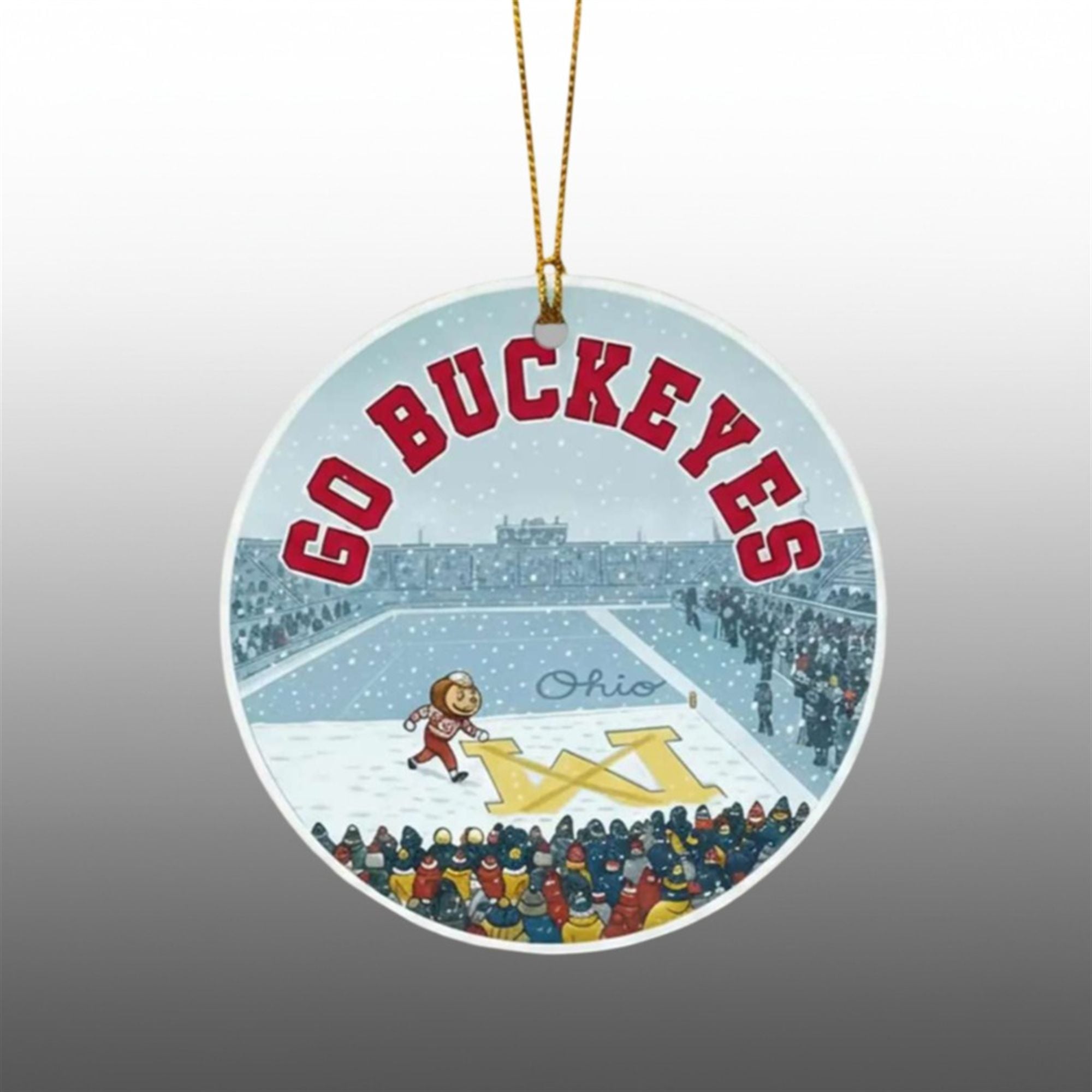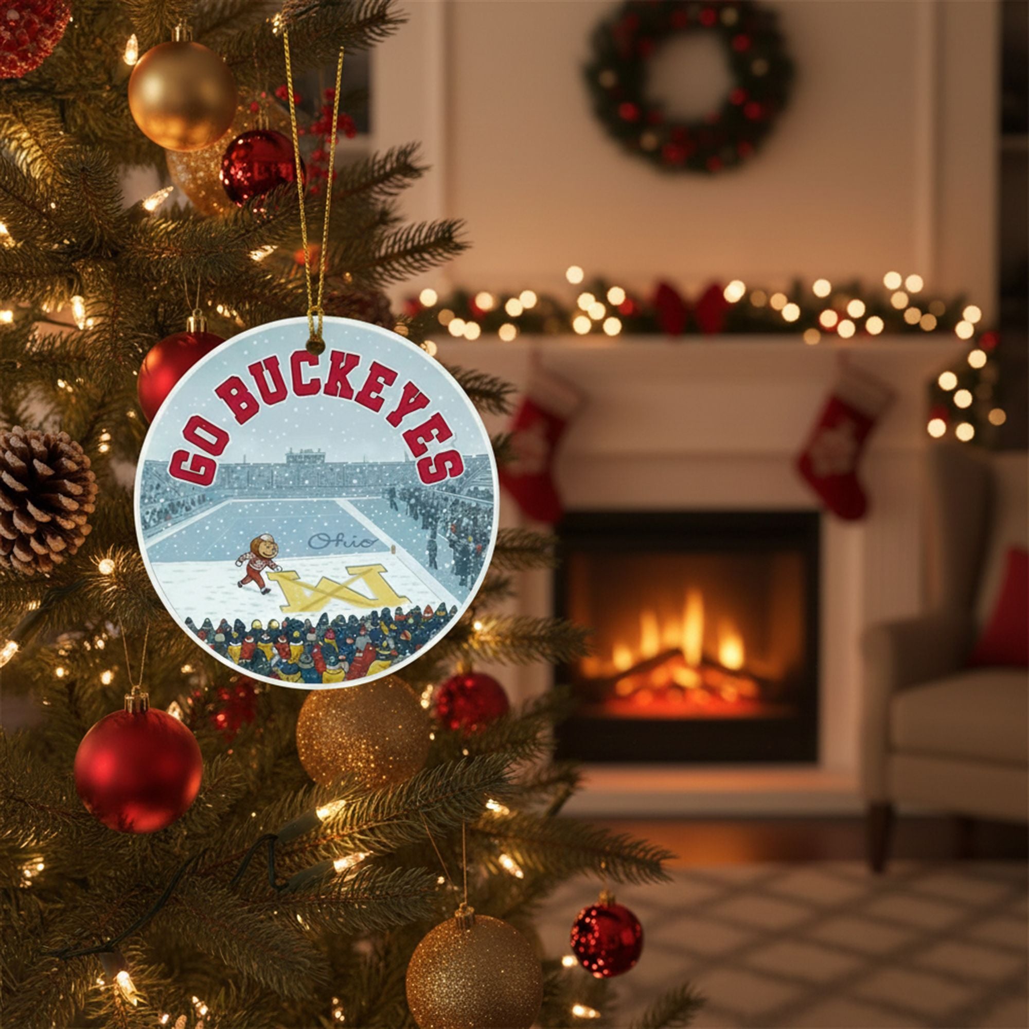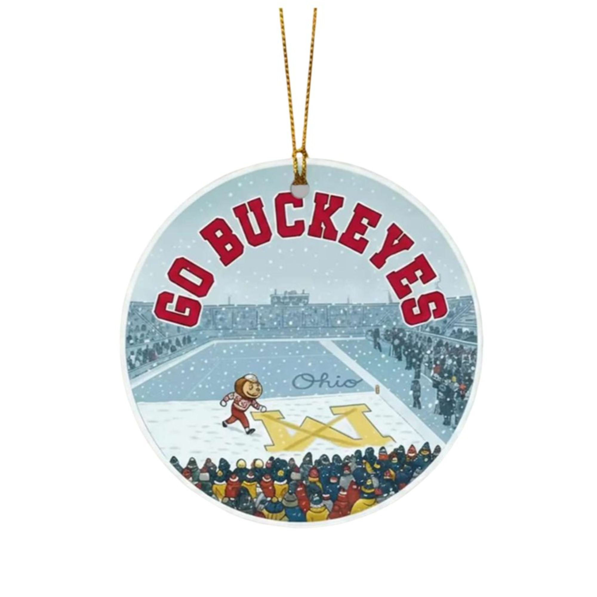 This beautifully designed circular ornament features a scenic winter view of the football stadium, dusted in white. In the center, the iconic Brutus Buckeye is hard at work, physically pushing a large yellow “M” off the field—literally “erasing” the competition from the landscape. Above him, bold red text screams “GO BUCKEYES,” leaving no doubt about your allegiance. It is a whimsical, high-quality keepsake that perfectly blends the joy of Christmas with the intense passion of Big Ten football.