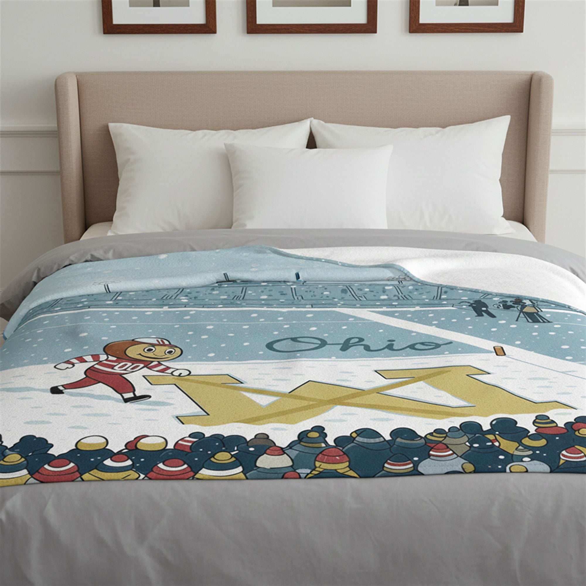 In the world of college football, few traditions are as sacred as the Ohio State vs. Michigan rivalry. This Brutus Snow Erase The M Blanket brings that intensity into your home with a charming, illustrative twist. The blanket features a beautifully rendered winter scene inside the stadium, complete with falling snow and a packed crowd in the foreground bundled up for the action.