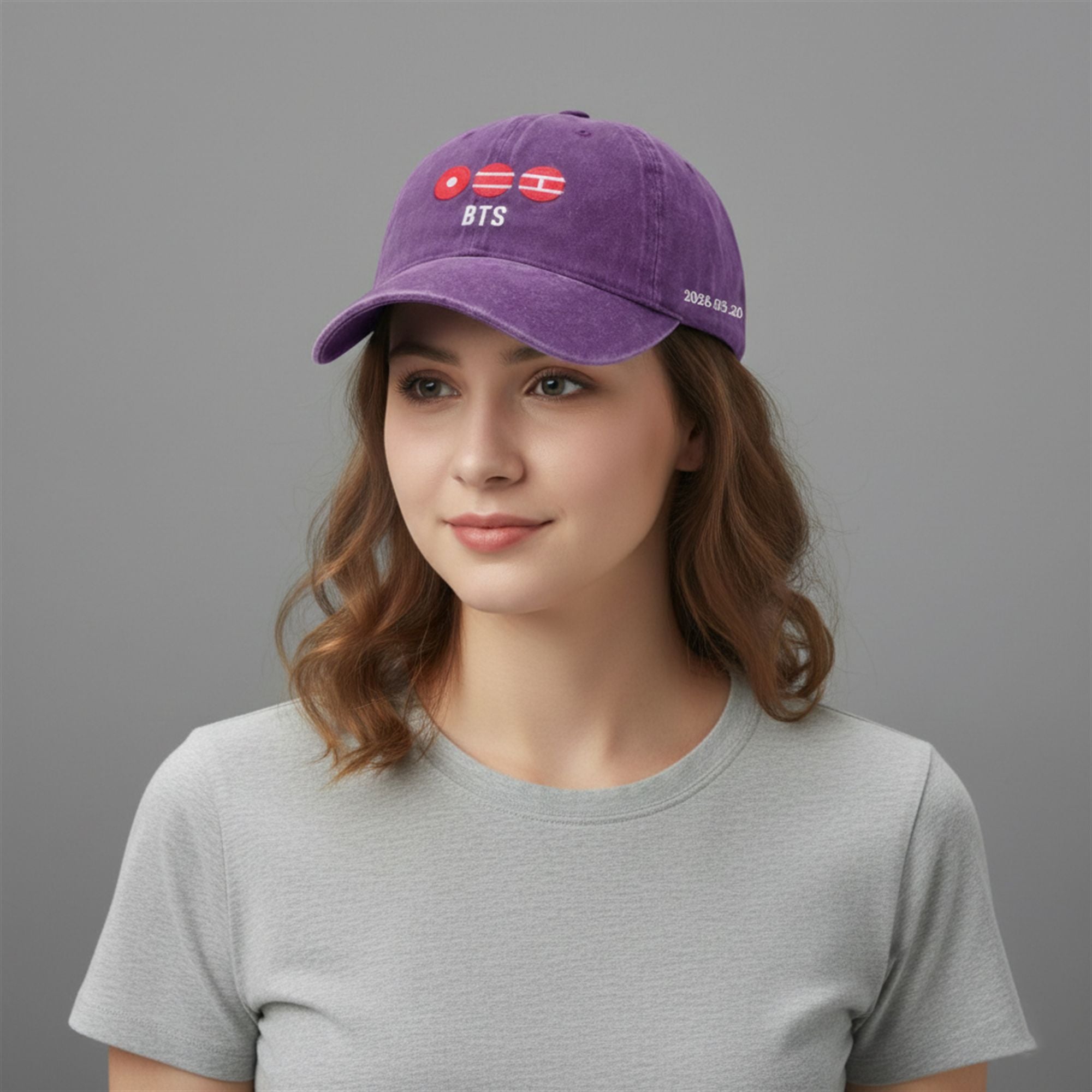 Crisply on the side profile is the sequence “2026.03.20.” This is not just a manufacturing date; it is the timestamp of the full group’s return to the global stage. By wearing this specific date, fans are claiming ownership of a historic moment in music. The placement is subtle yet deliberate, visible only in profile, making it an intimate secret shared between the wearer and those in the know. It transforms the hat from simple merchandise into a commemorative artifact, marking the end of the “waiting era” and the beginning of the “forever era.”