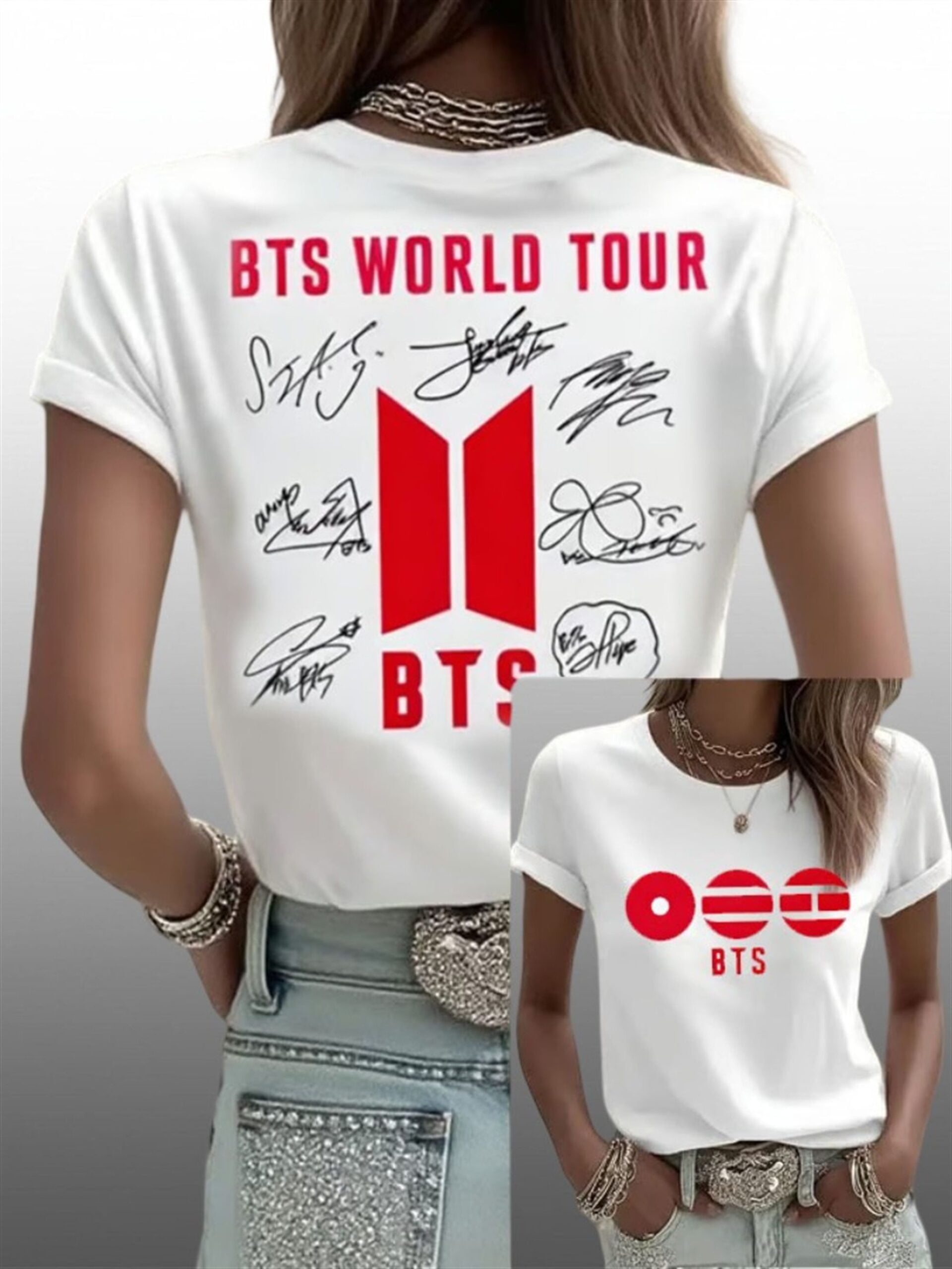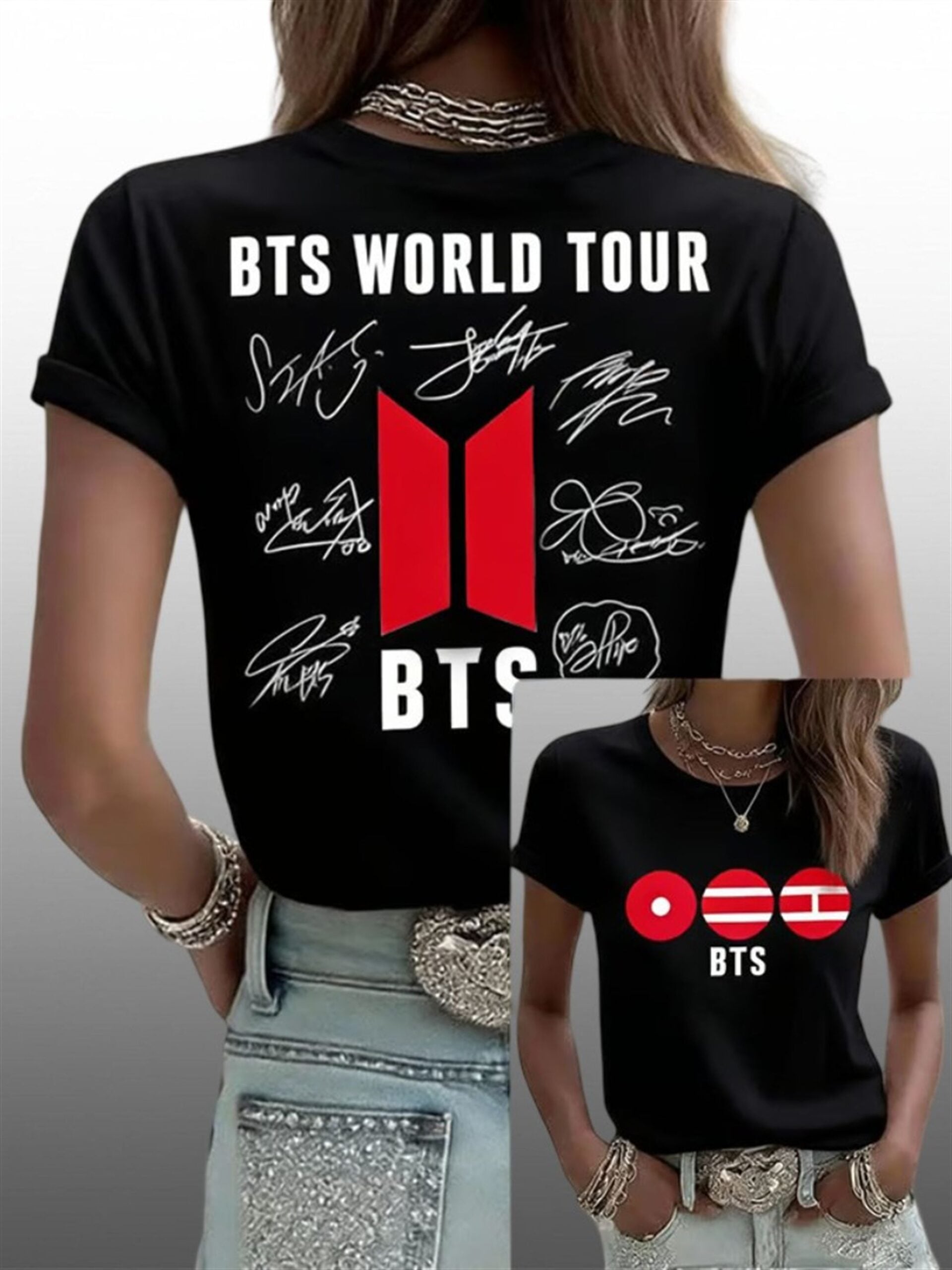 The back serves as a roll call of legends. It proudly displays the BTS World Tour bold typography anchored by the iconic trapezoid logo, surrounded by the authentic replica signatures of all seven members: RM, Jin, Suga, J-Hope, Jimin, V, and Jung Kook. It is a wearable declaration that “OT7” is back, stronger than ever.’