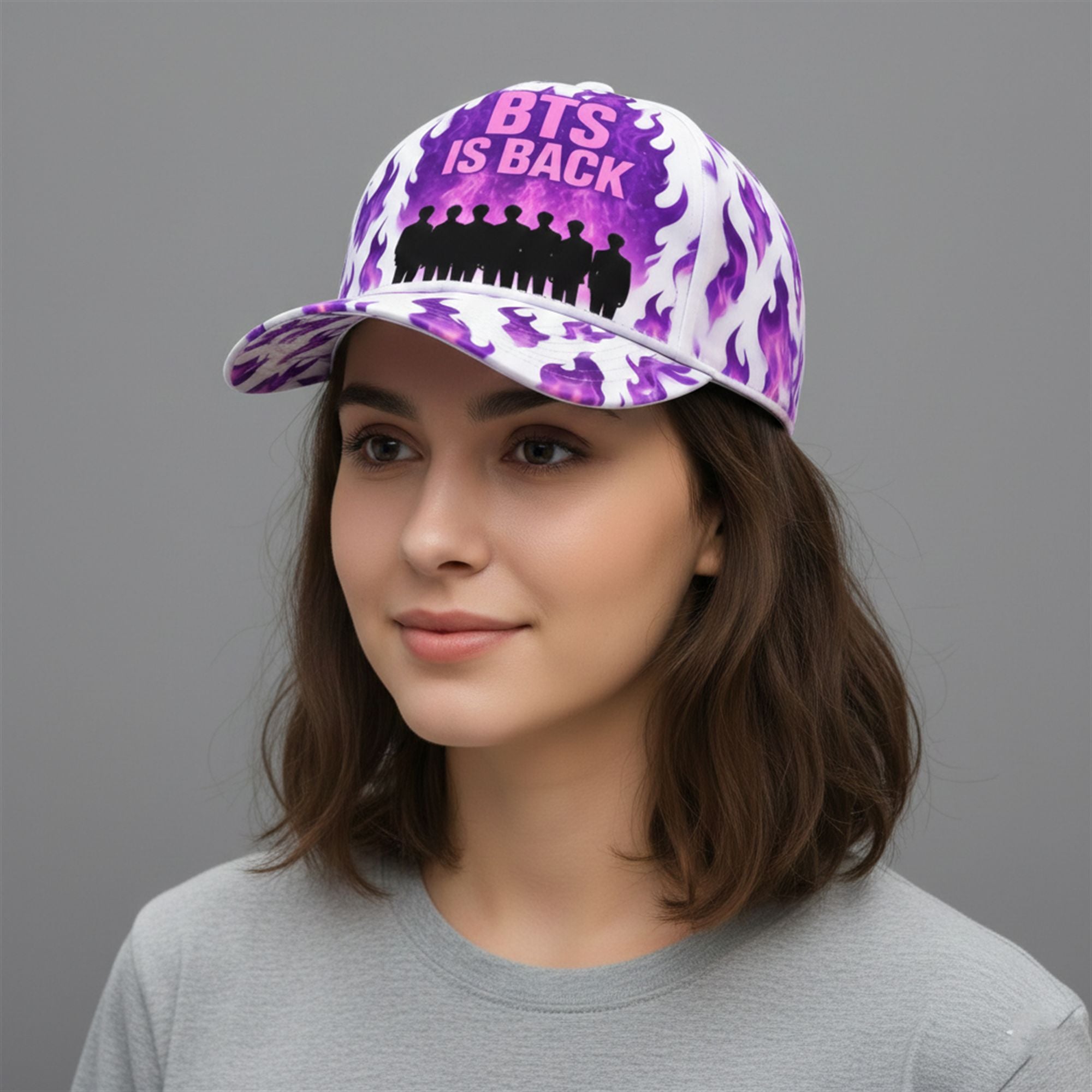 The year 2026 marks a historic milestone in pop culture history. With the group reuniting for their first full tour since Permission to Dance, the atmosphere is electric. This hat is designed specifically for this moment. The vivid purple fire graphic isn’t just an aesthetic choice; it represents the burning passion of the fandom that stayed loyal through the hiatus. The design features the silhouettes of all seven members—RM, Jin, SUGA, J-Hope, Jimin, V, and Jung Kook—standing united against a backdrop of “Borahae” purple flames, symbolizing their unbreakable bond with ARMY. Wearing this is the ultimate way to signal your readiness for the new era.